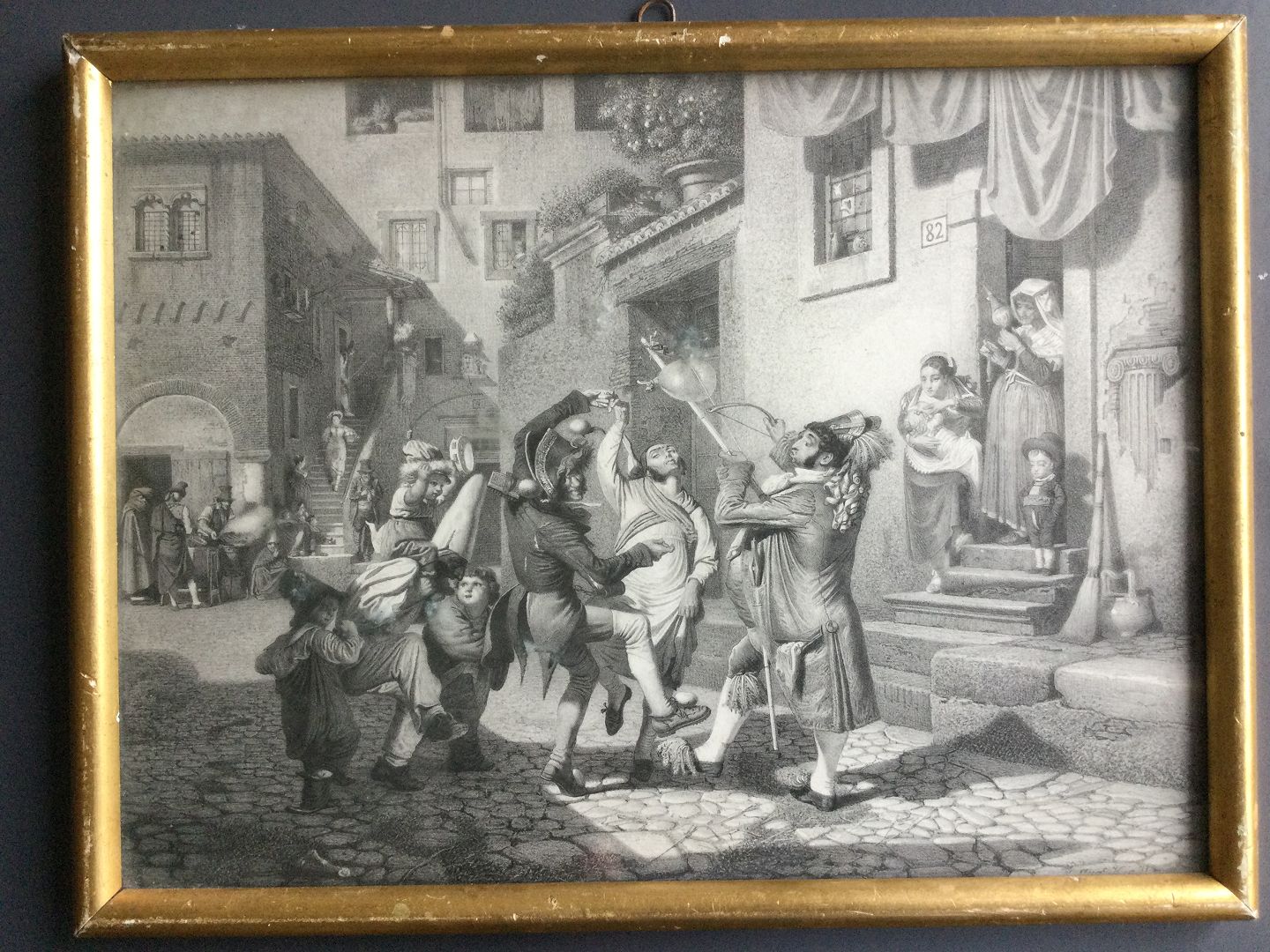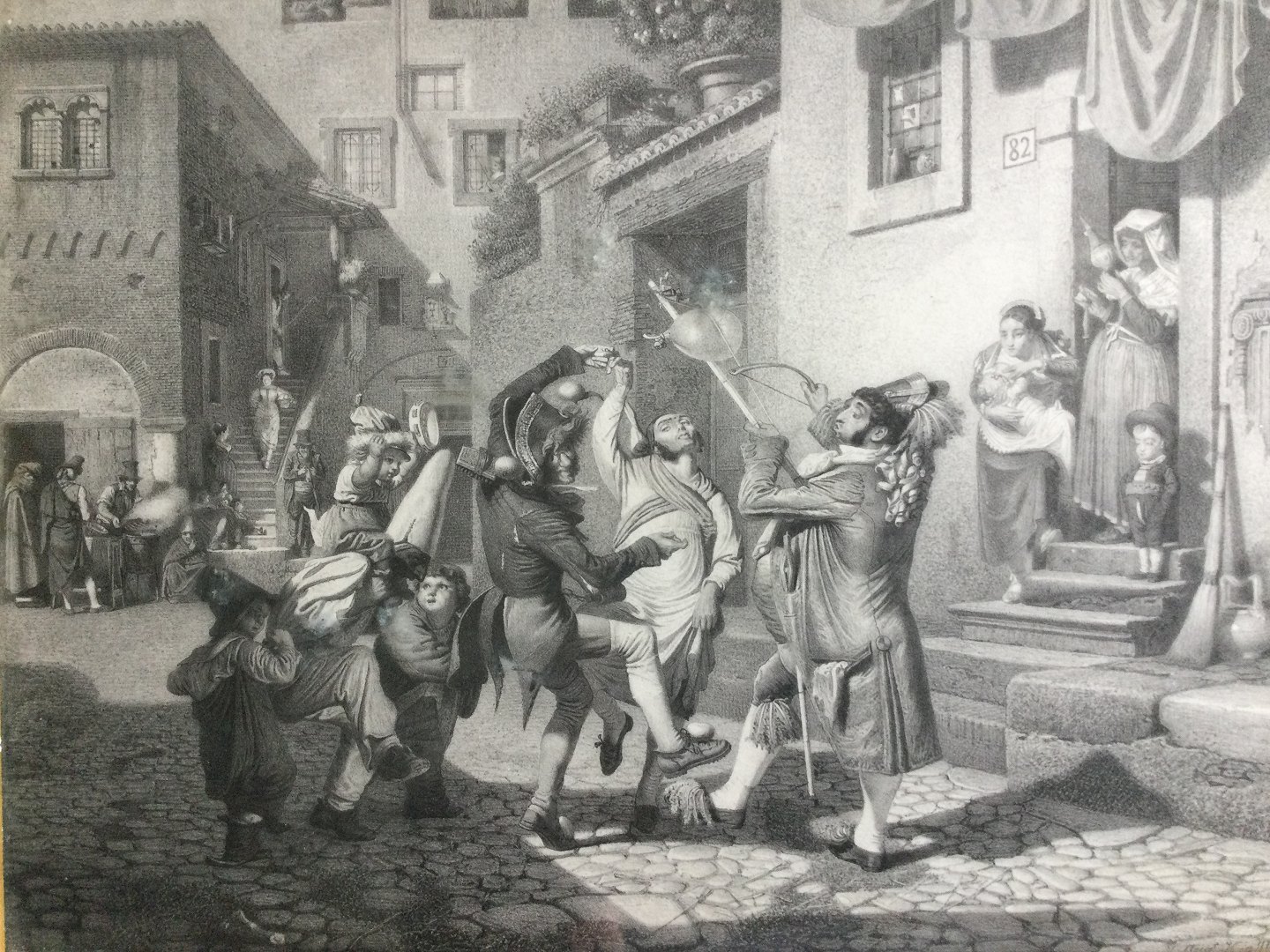 Litografi af Ad. Kittendorff - Karnevals lystighed på en gade i Rom 1824.