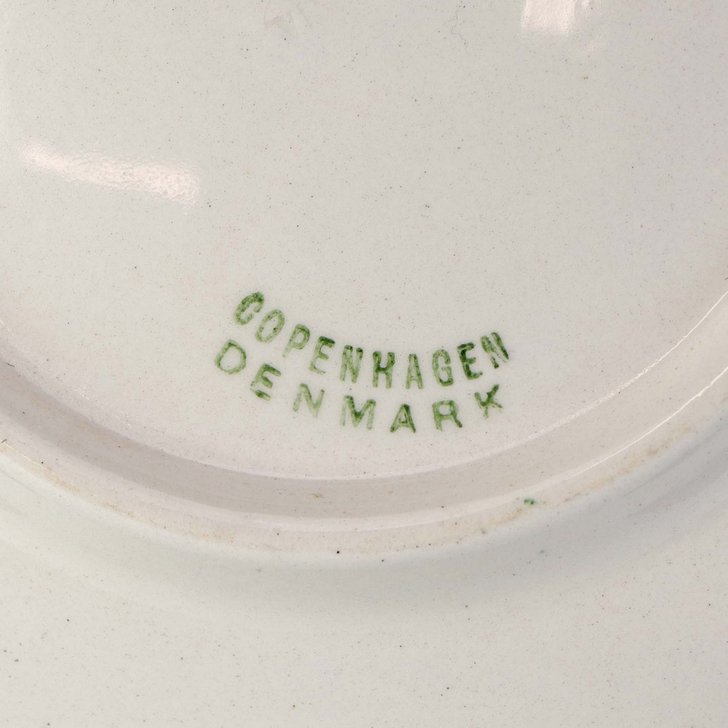 Ældre platte i fajance med teksten Viborg Amt Mejeriforening for 1ste klasses smør 1917 og motiv af fire blæseinstrumenter kaldet lur.Producent Aluminia
