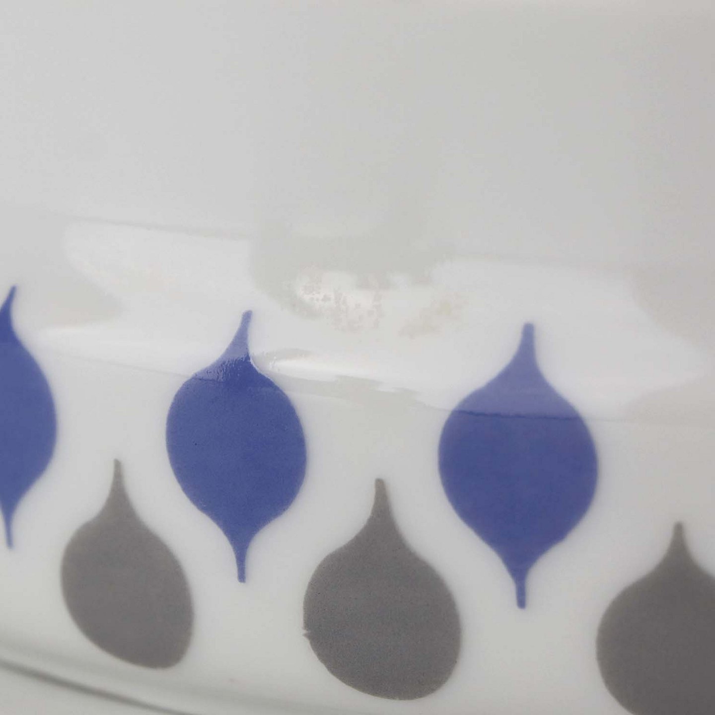 Stel produceret i perioden 1961-69 fremstillet i glat hvidt porcelæn dekoreret med blå og grå dråber.