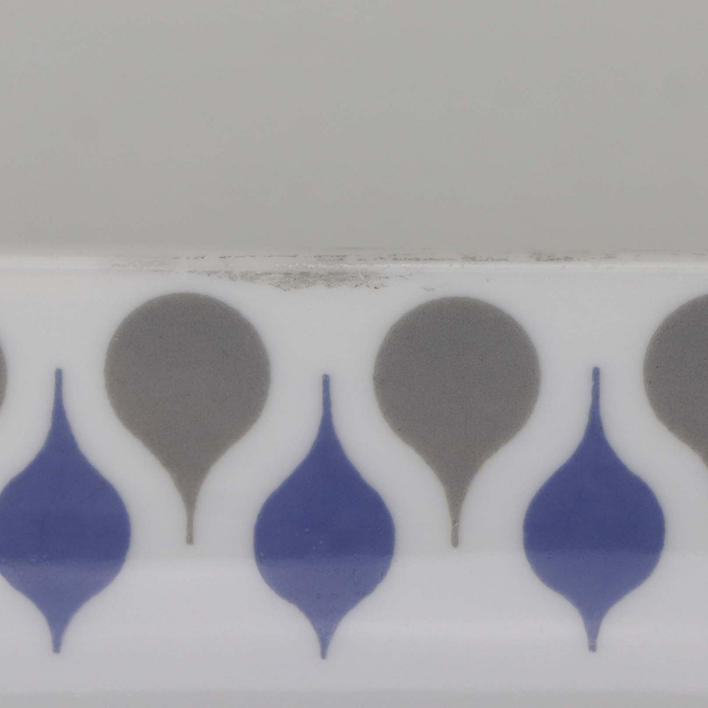 Stel produceret i perioden 1961-69 fremstillet i glat hvidt porcelæn dekoreret med blå og grå dråber.