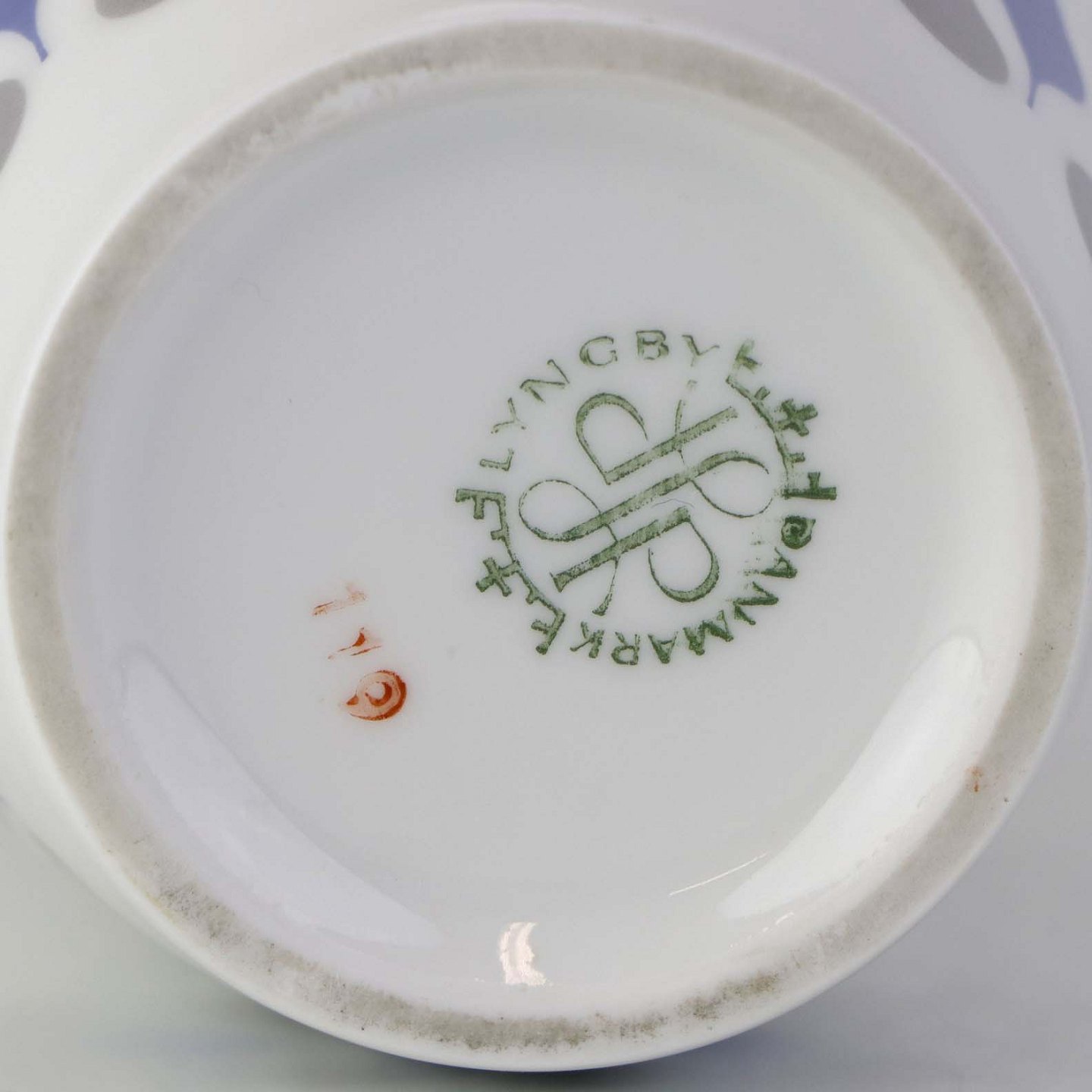 Stel produceret i perioden 1961-69 fremstillet i glat hvidt porcelæn dekoreret med blå og grå dråber.