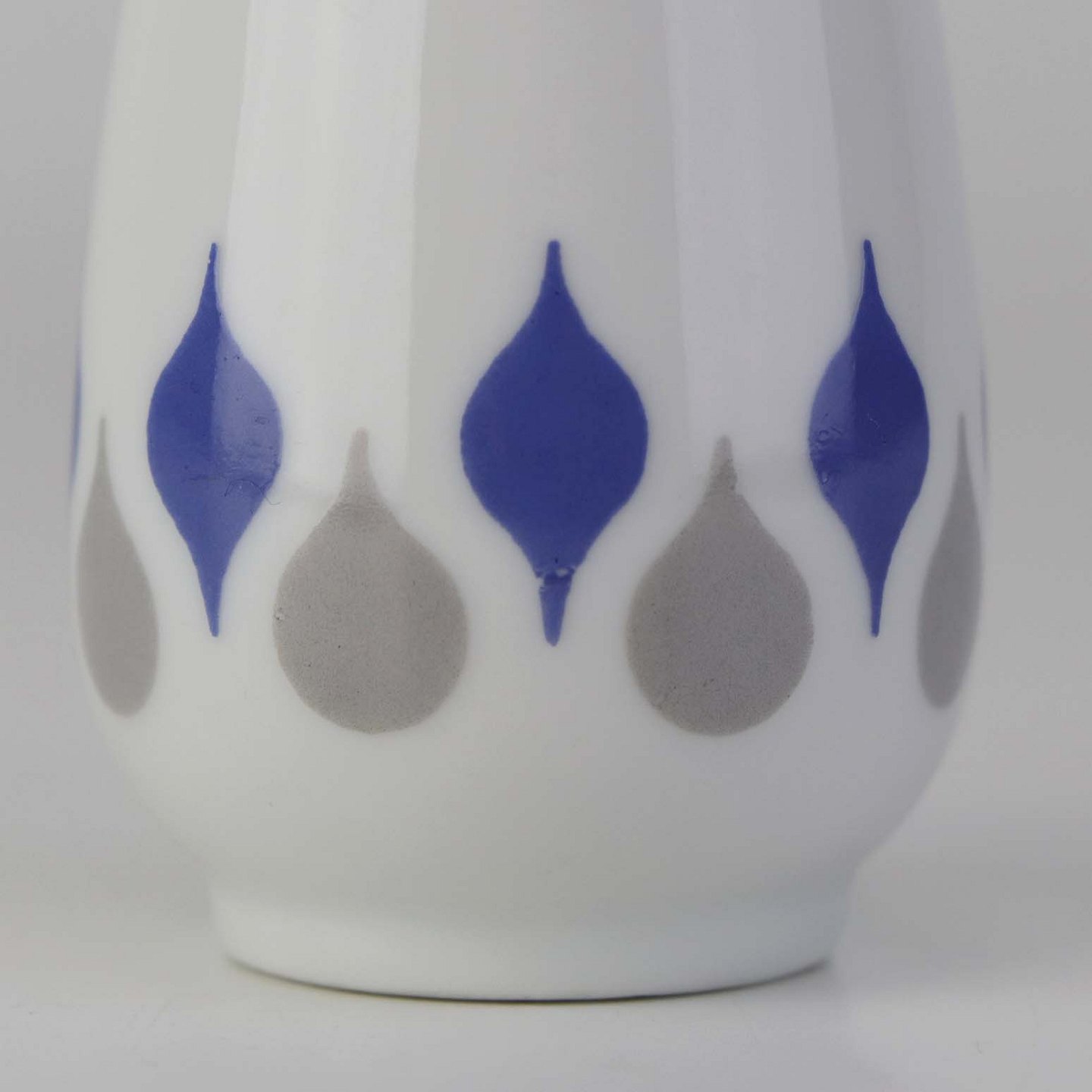 Stel produceret i perioden 1961-69 fremstillet i glat hvidt porcelæn dekoreret med blå og grå dråber.