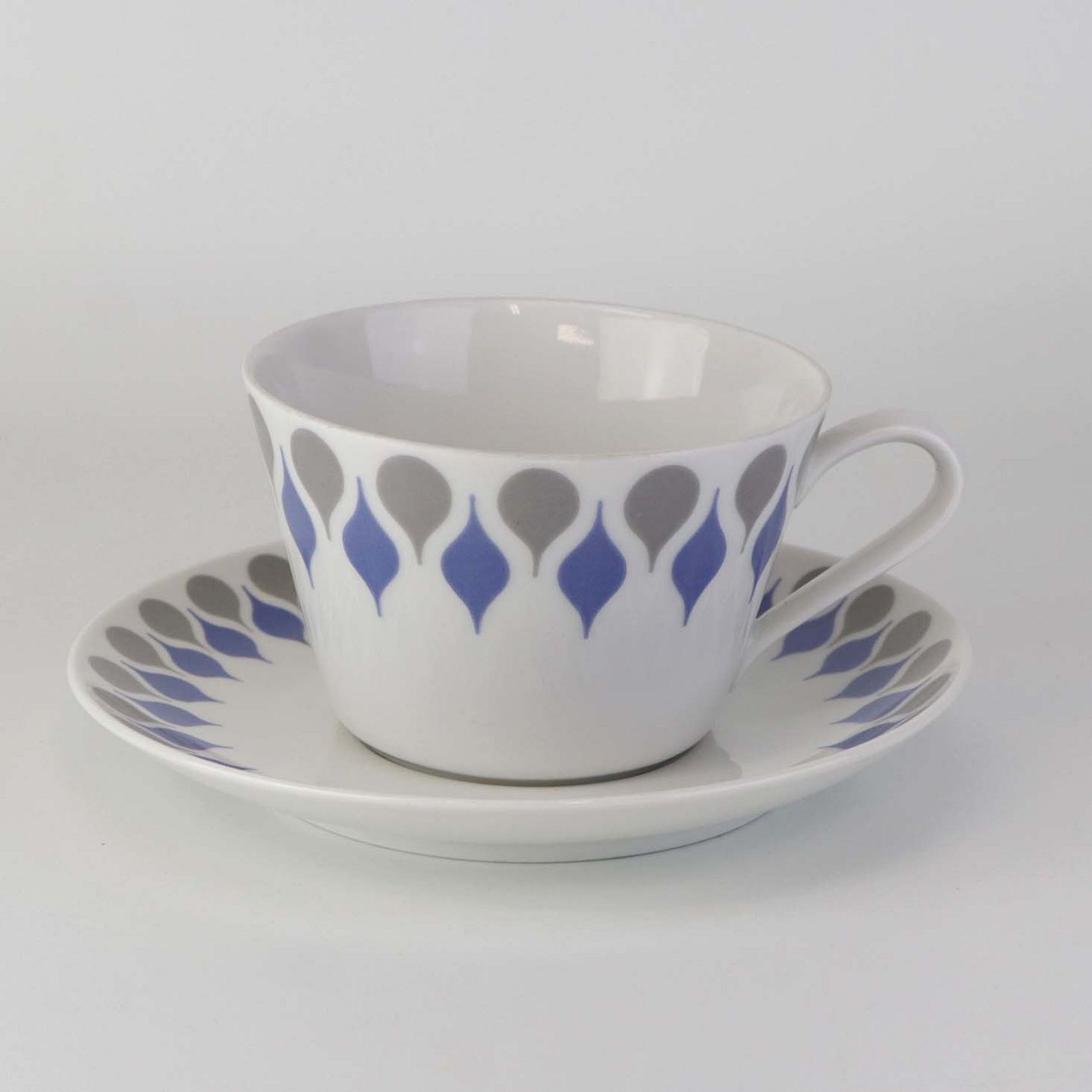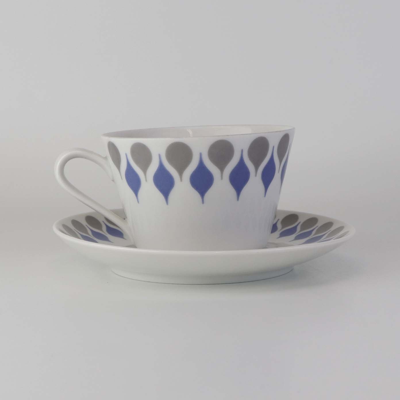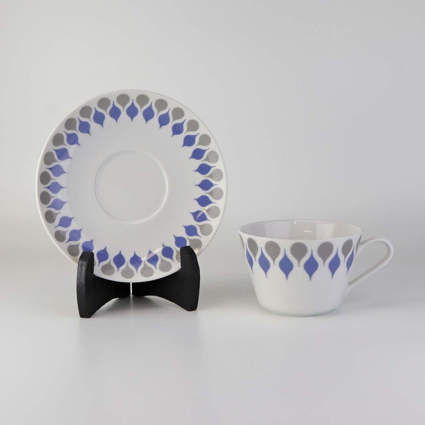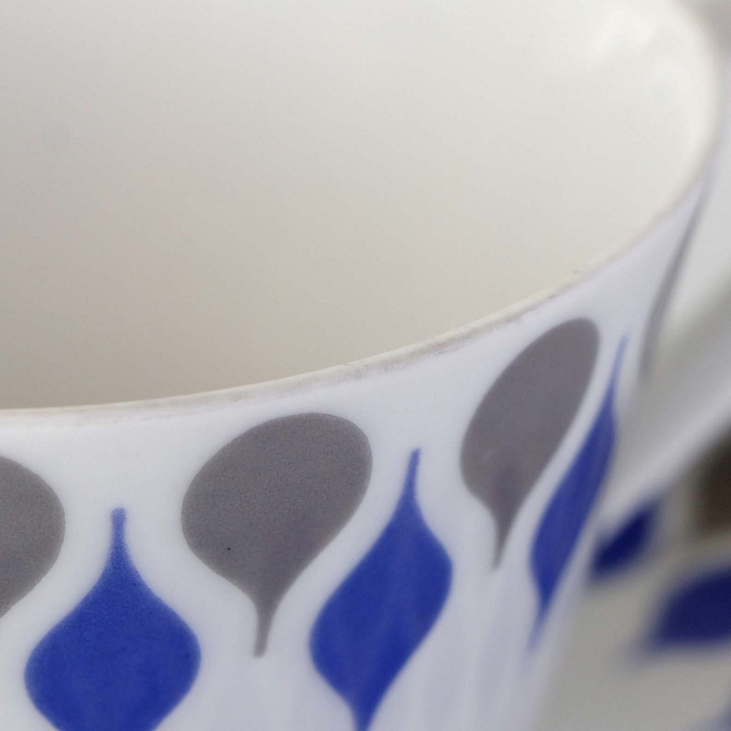 Stel produceret i perioden 1961-69 fremstillet i glat hvidt porcelæn dekoreret med blå og grå dråber.