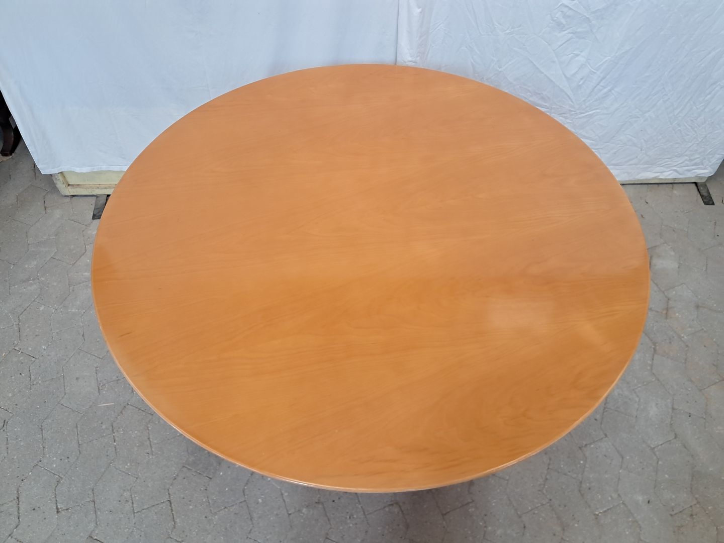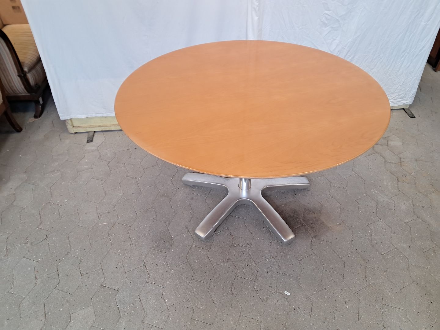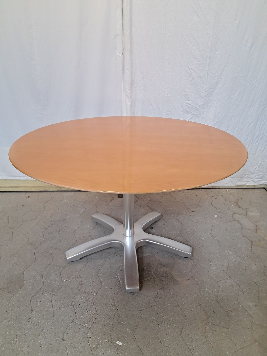 Rundt spisebord i fineret bøgetræ med metal understel, fra 2000erne.Det har brugsspor.