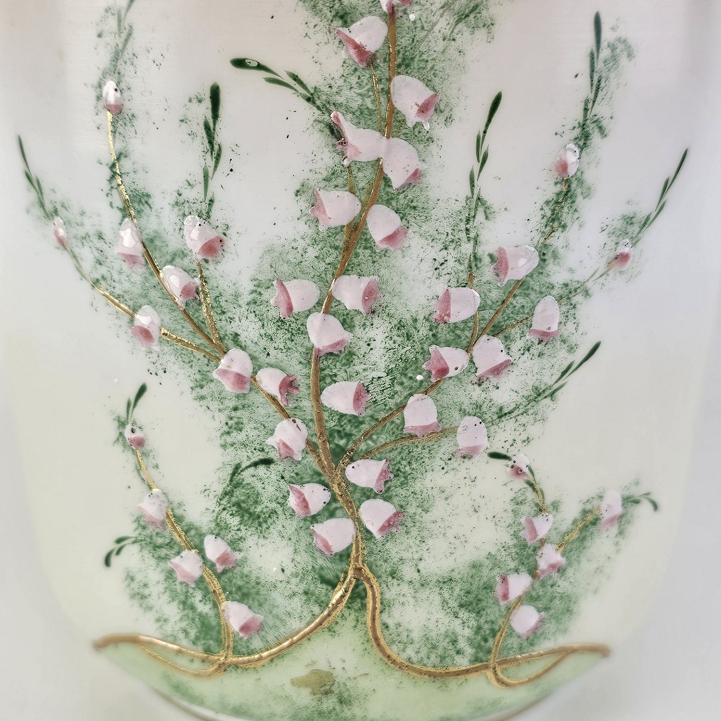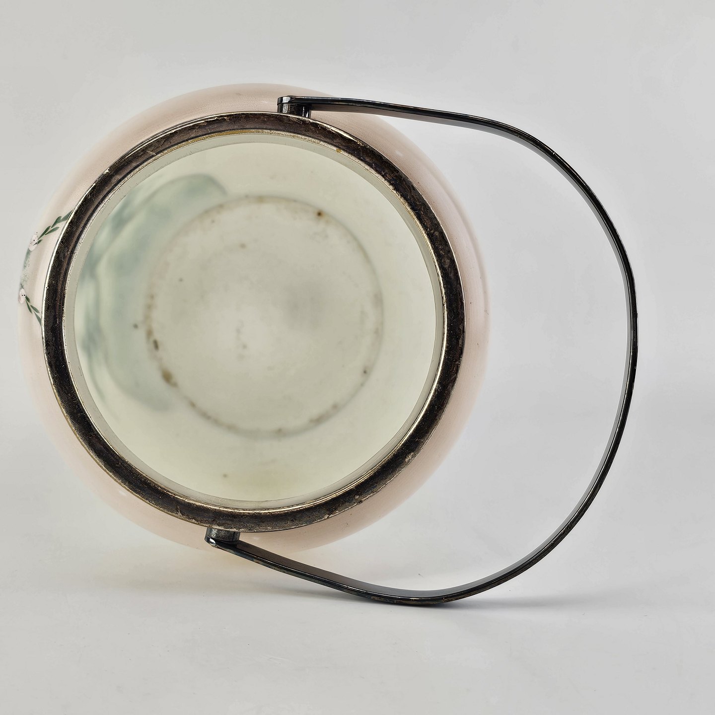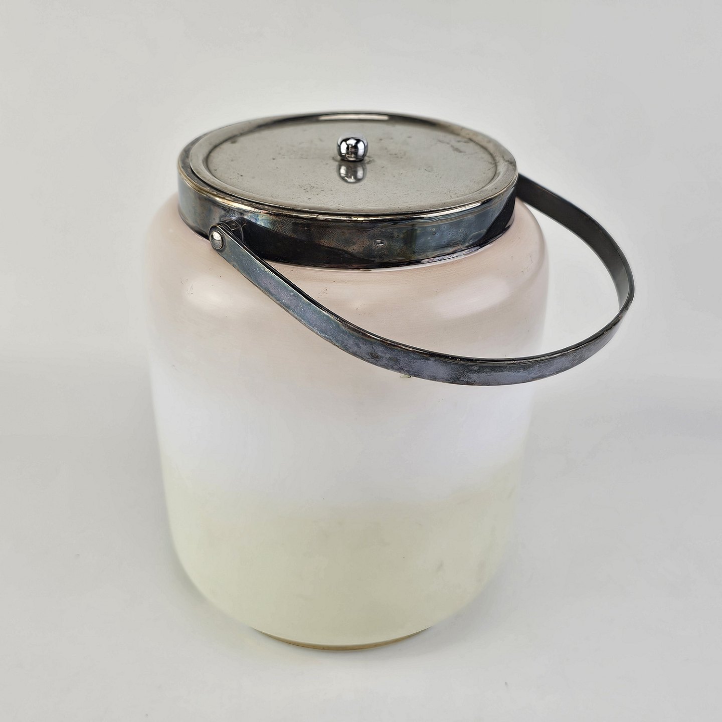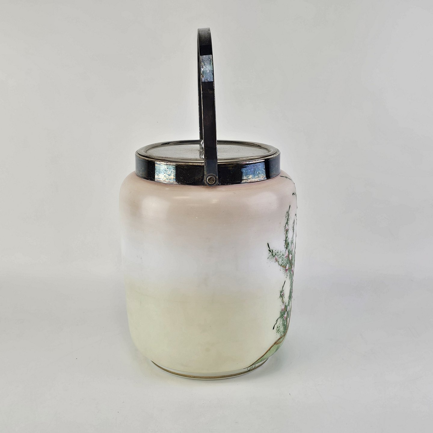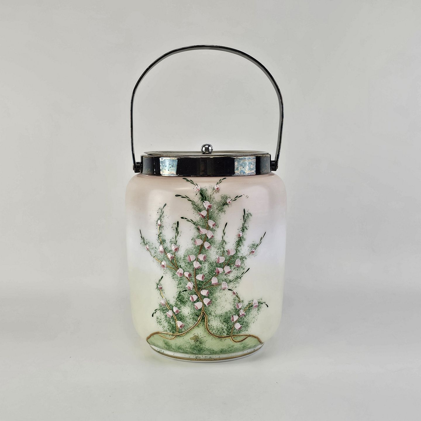 Håndmalet opalglas krukke med låg og håndtag, dekoreret med blomstermotiv. Låg og hank lavet af metalHøjde 16,5 cm