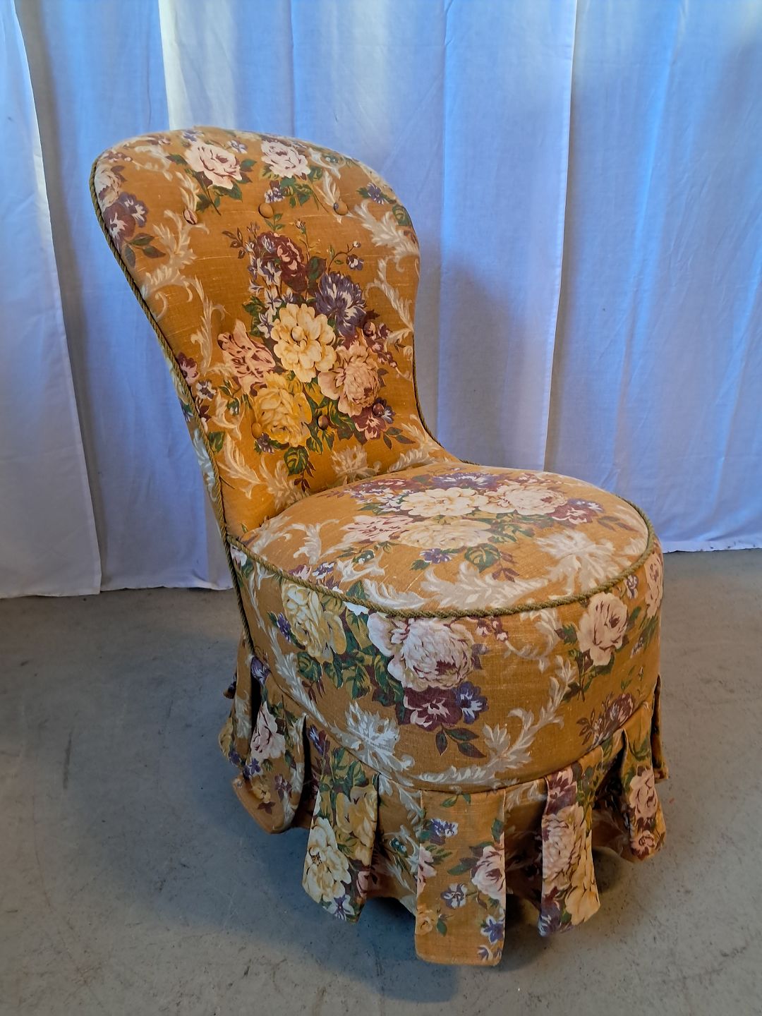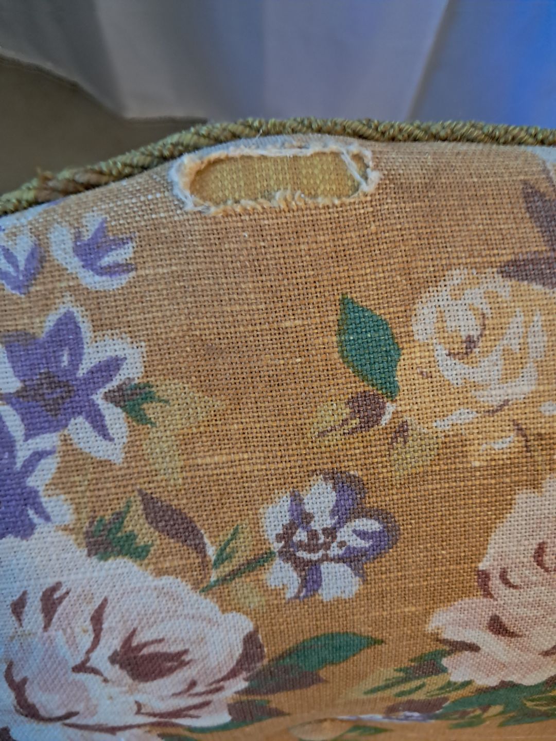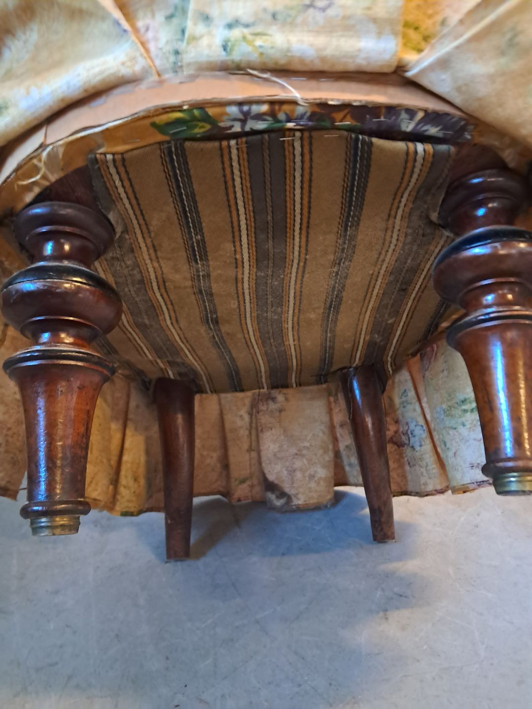 Lænestol fra 1920erne.Den har brugsspor og defekt i betrækket.