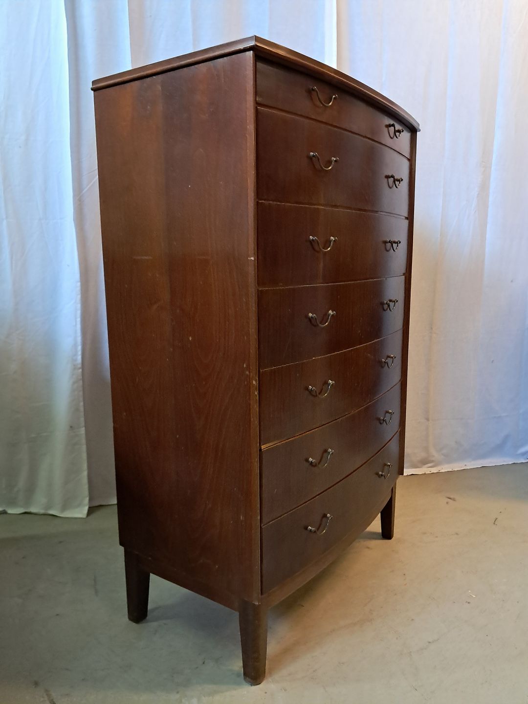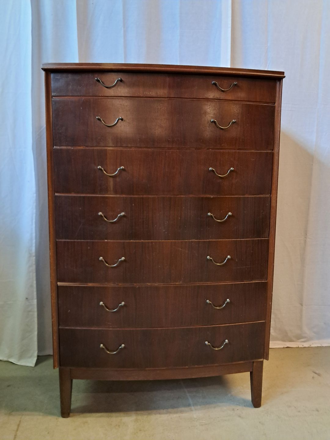 Kommode i fineret nødetræ, fra 1960erne.Den har brugsspor.