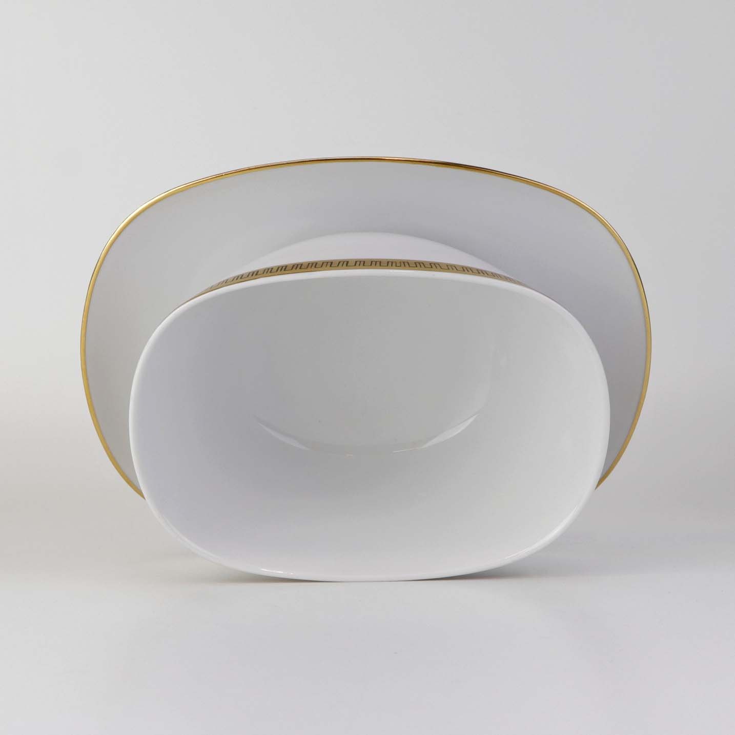 Stel i glat hvidt porcelæn dekoreret med sort streg i guldbort.