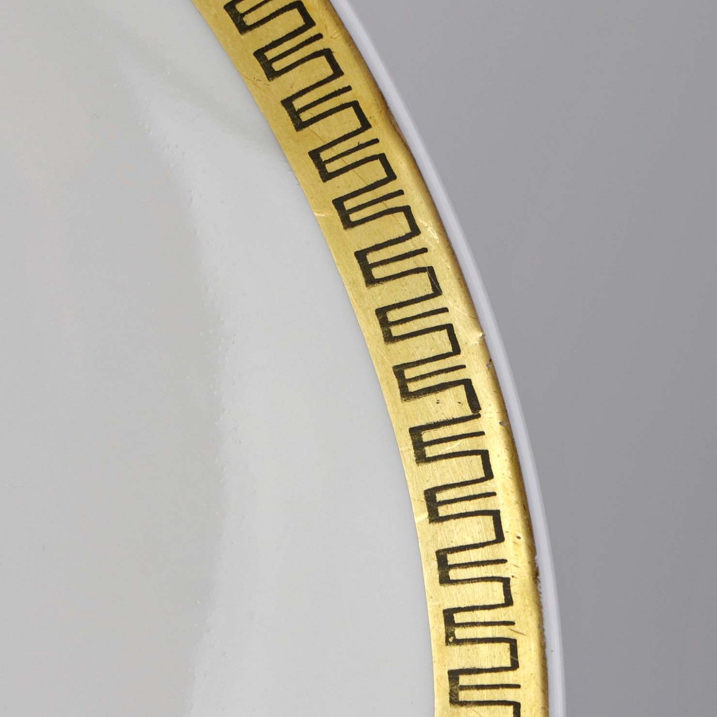 Stel i glat hvidt porcelæn dekoreret med sort streg i guldbort.