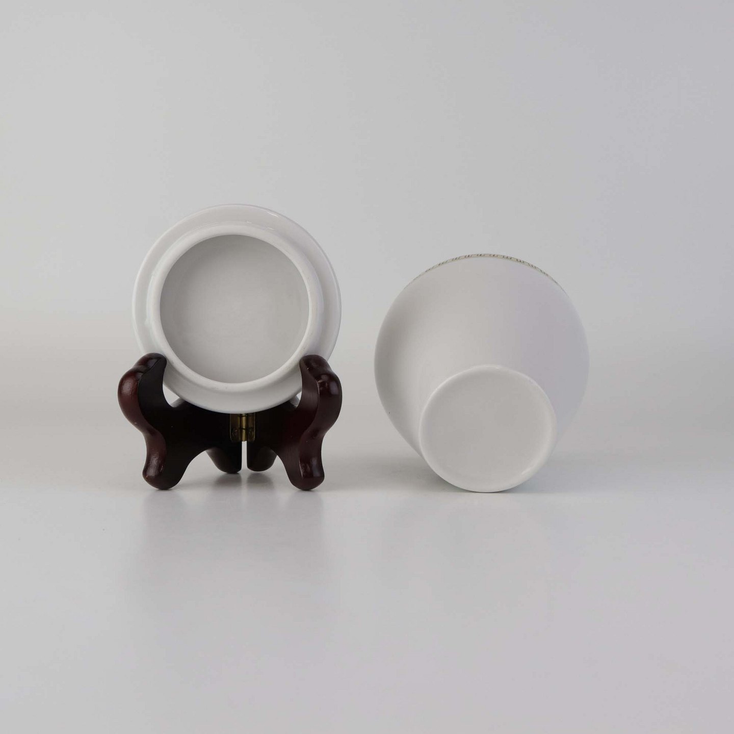 Stel i glat hvidt porcelæn dekoreret med sort streg i guldbort.