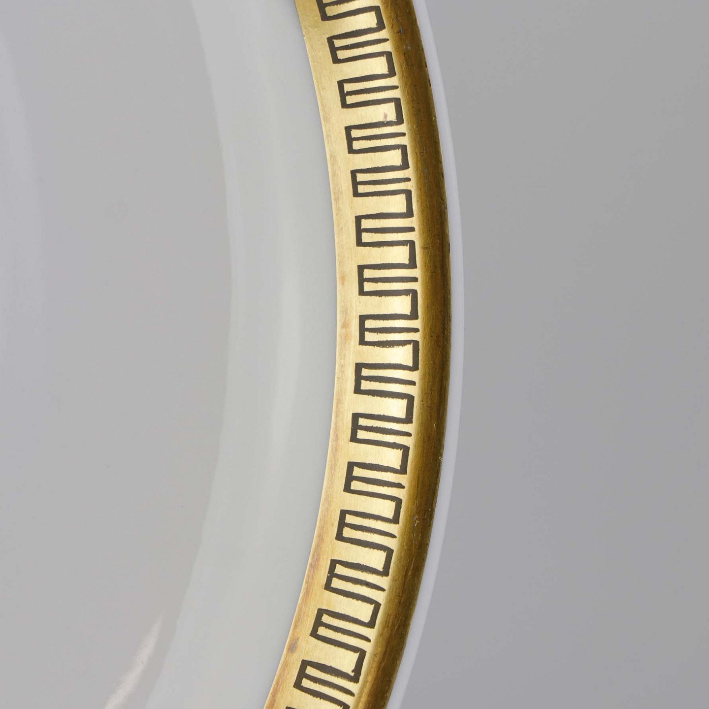Stel i glat hvidt porcelæn dekoreret med sort streg i guldbort.