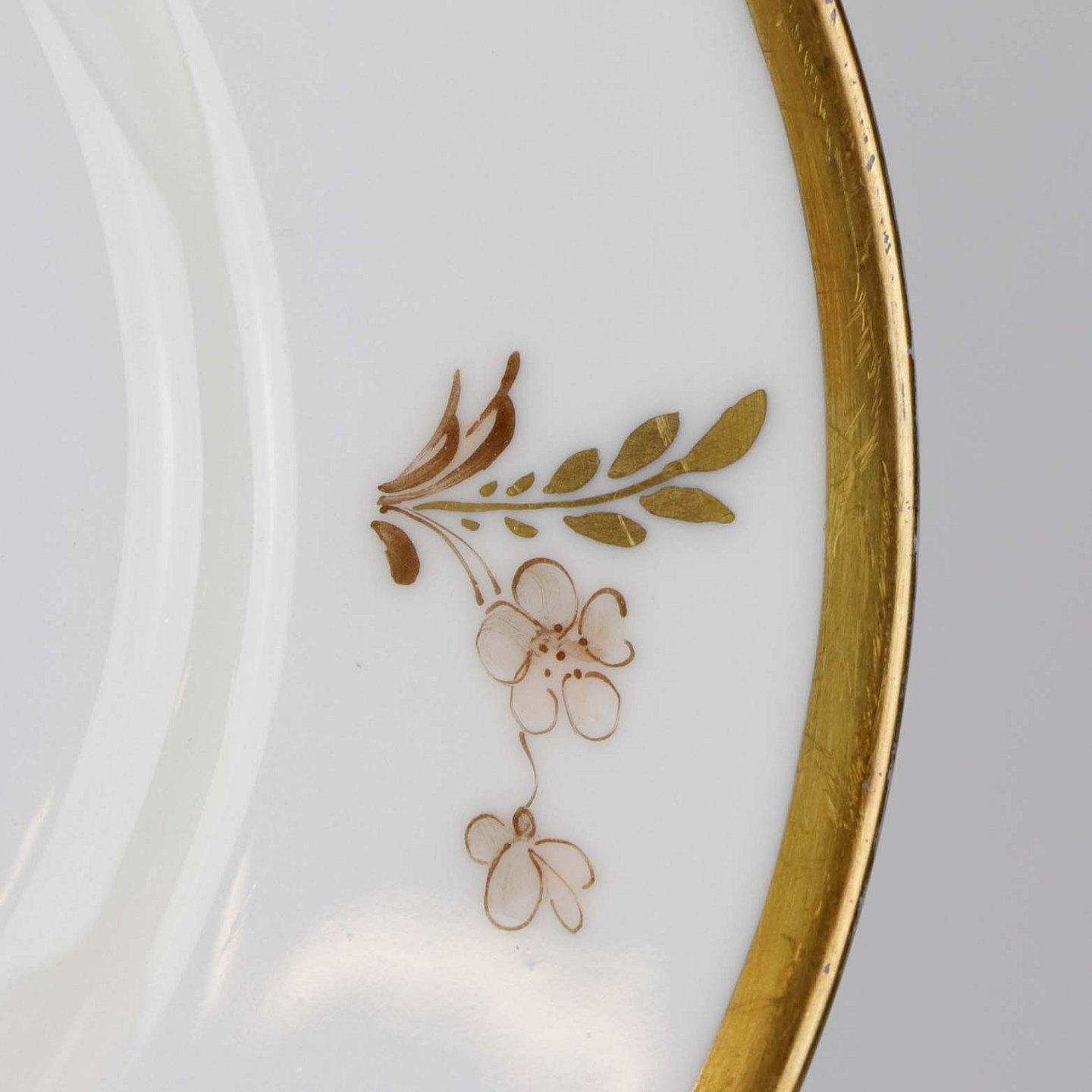 Stel i glat hvidt porcelæn dekoreret brune roser og kantet af med guldbort.