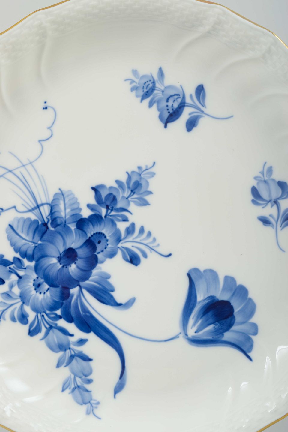 Founded in 1775, Royal Copenhagen is one of the world’s most renowned porcelain manufactories. The “Blue Flower” pattern was introduced in the late 18th century as a free floral motif inspired by European Rococo. Produced in several versions—Curved, Basketweave, and Angular—the rare editions with applied gilding were often made as special orders and are today highly sought after among collectors.