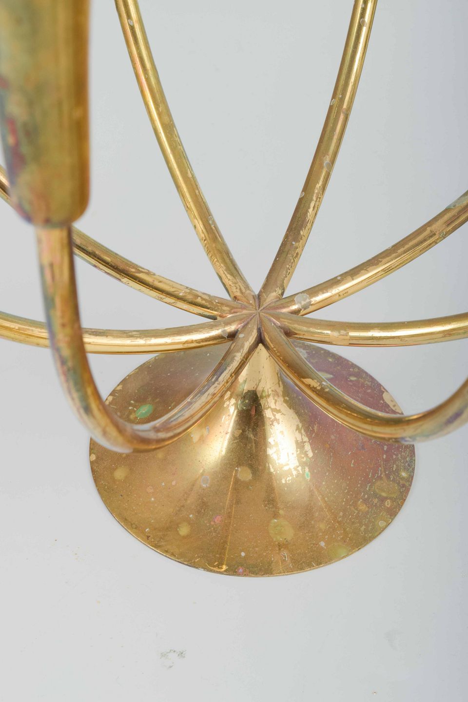 Brass candelabrum with eight curved arms, trumpet-shaped holders and conical base.