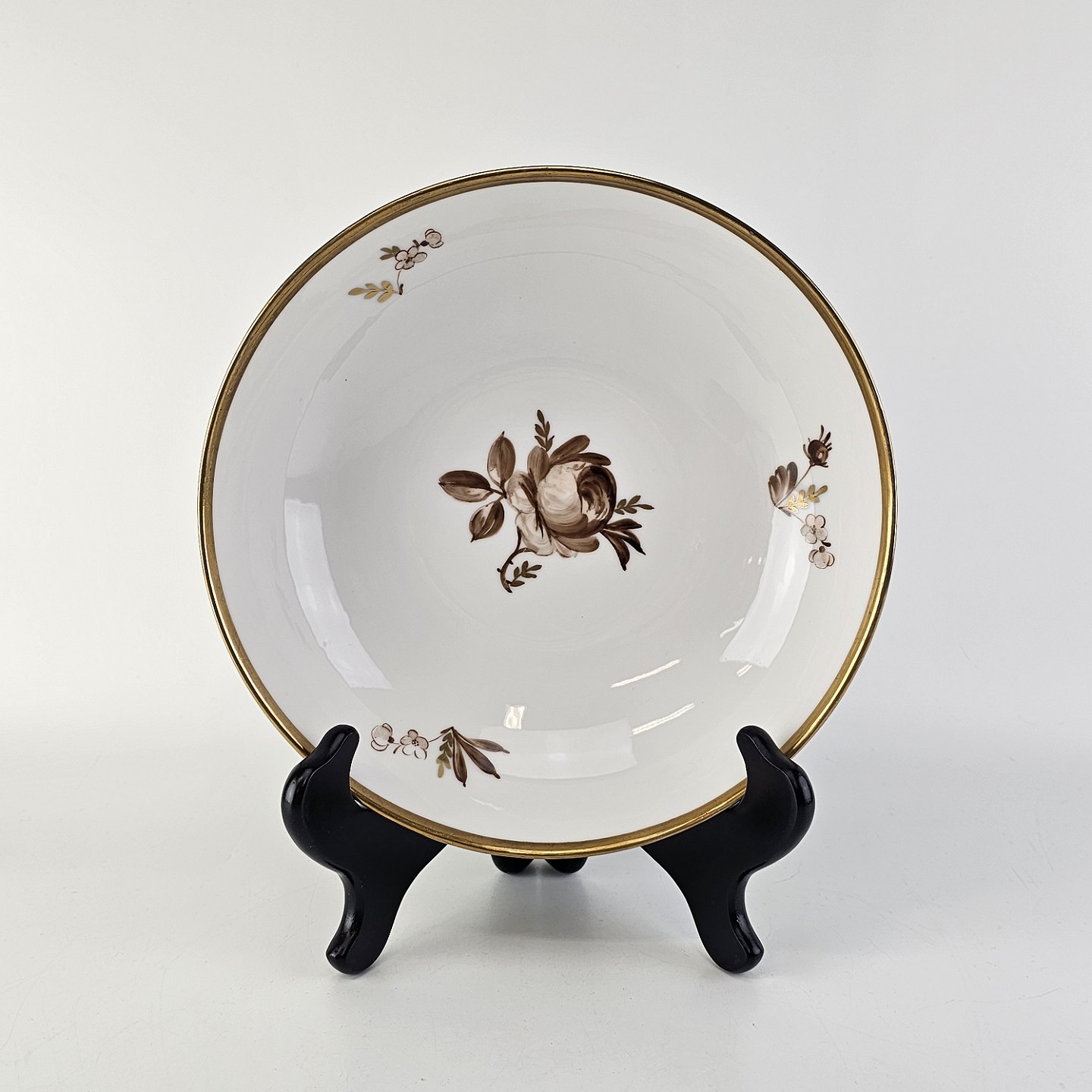 Stel i glat hvidt porcelæn dekoreret med brune roser og guldbort