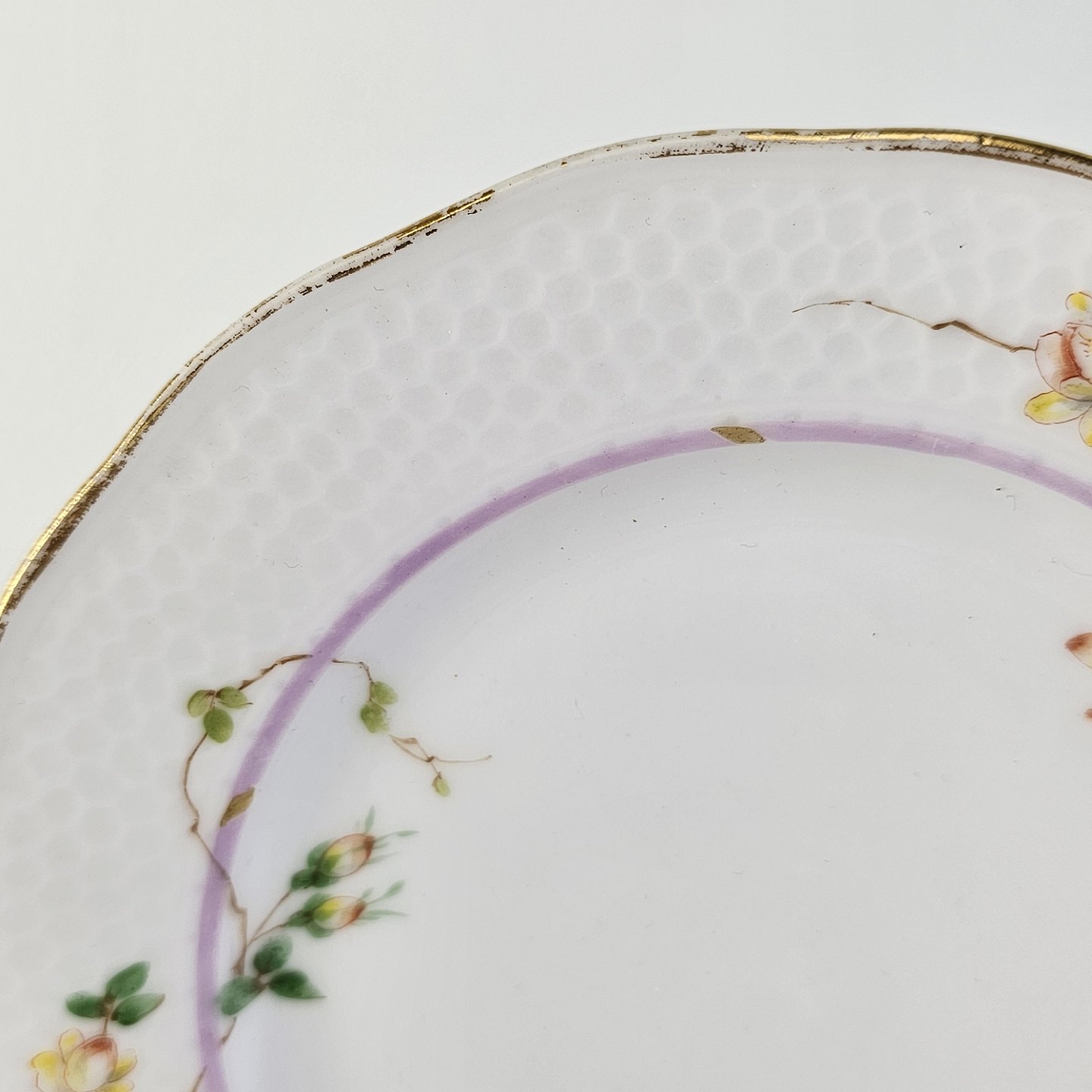 Service i hvidt porcelæn med hamret kantmønster dekoreret med gule blomsterranker og lyslilla streg. Stellet er med guldkant og det er mærket med bølger anvendt frem til 1890.