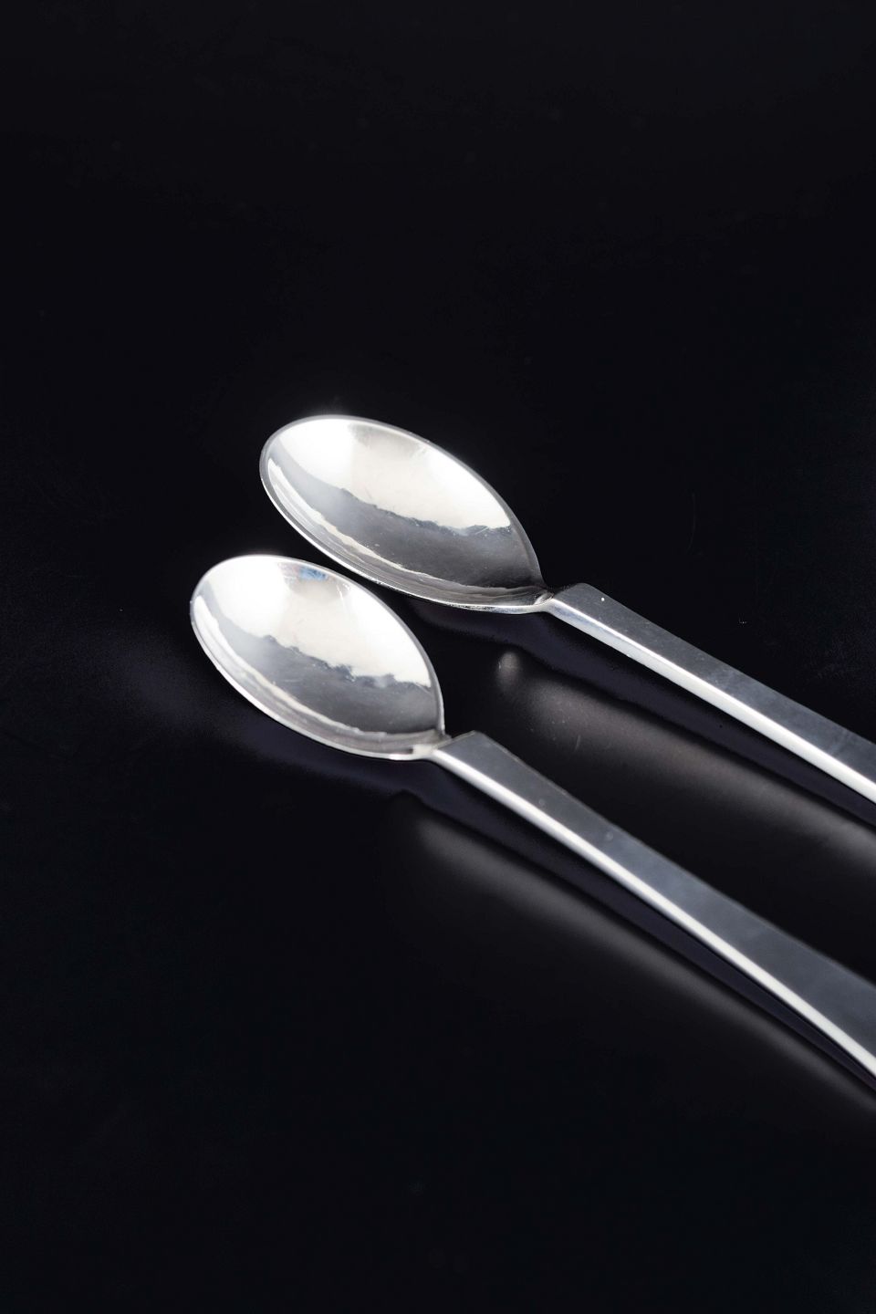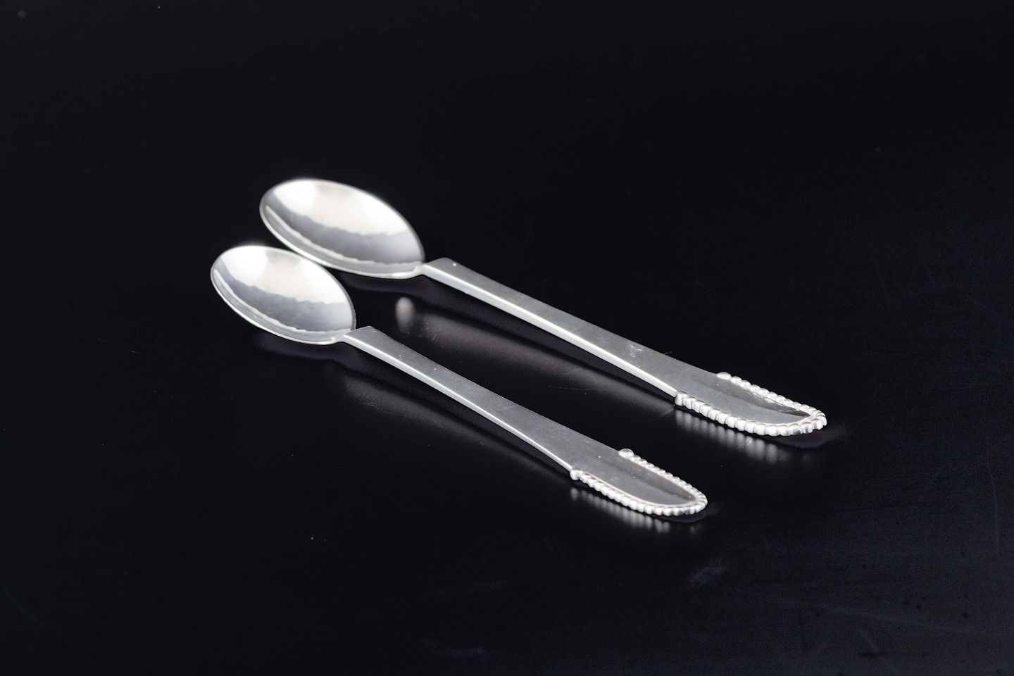 A classic pair of spoons from Georg Jensen in the timeless “beaded” pattern, designed in 1916 and produced in sterling silver in the periods 1915–1930 and 1933–1944.