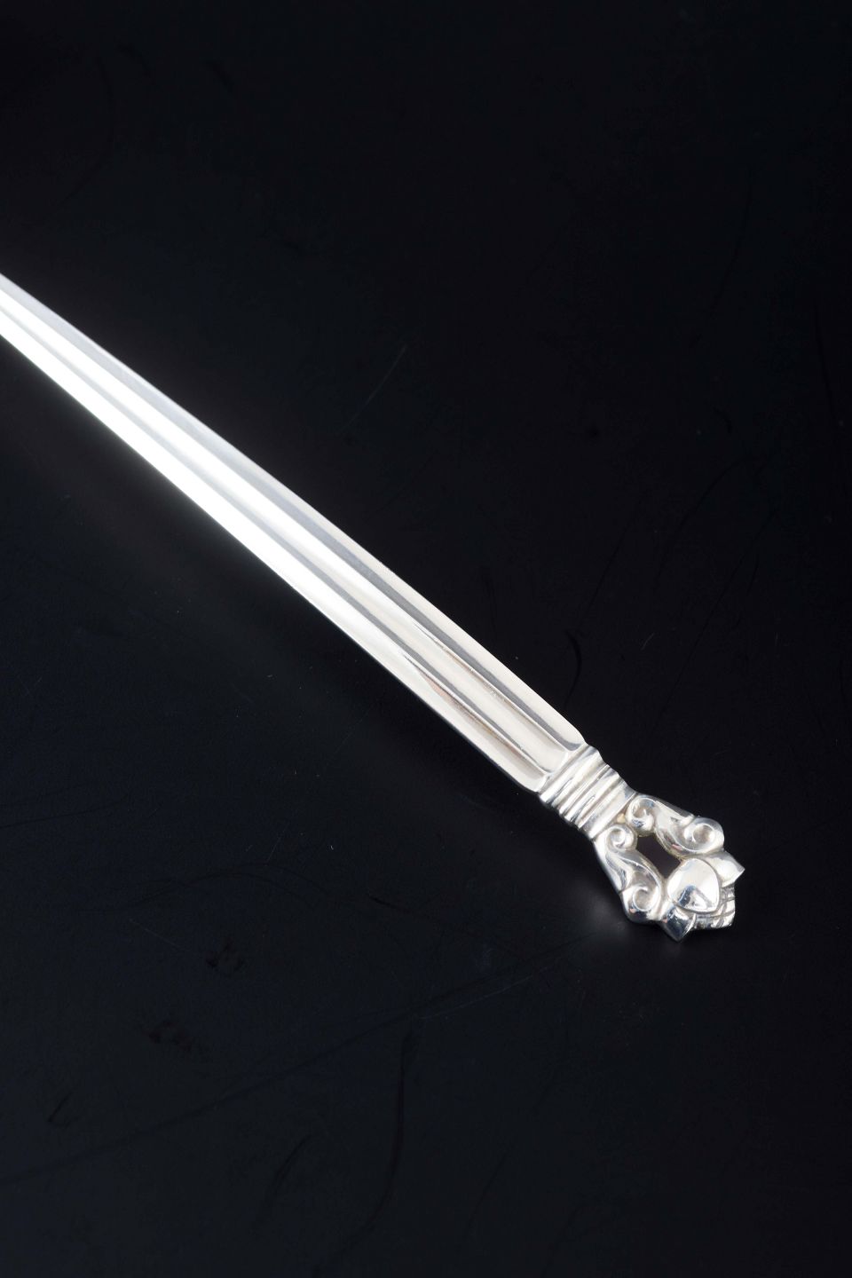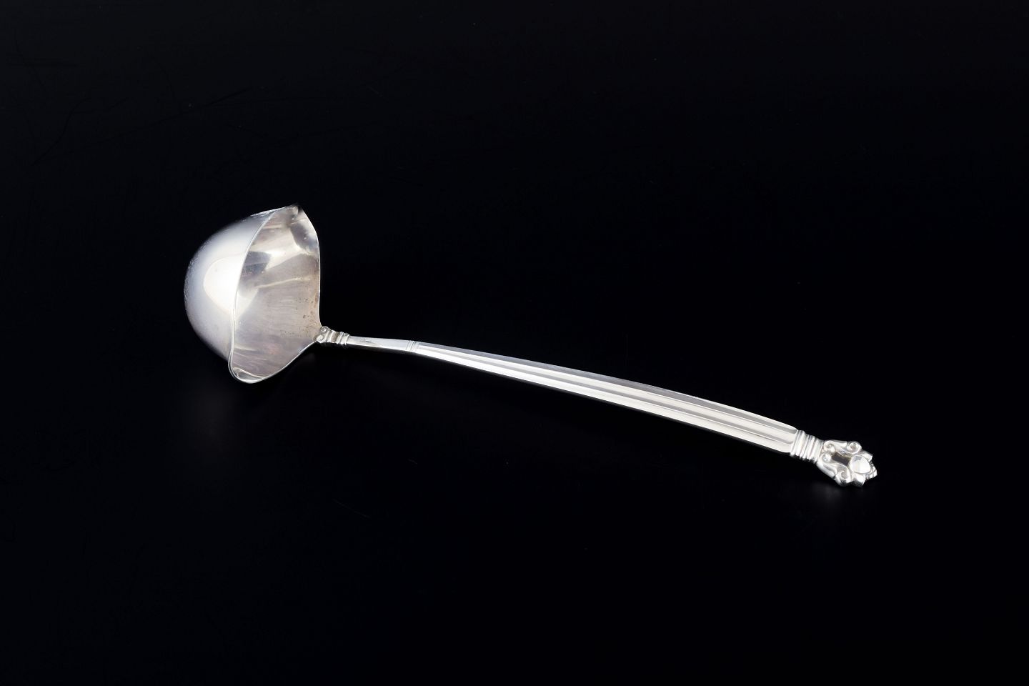 An elegant butter sauce ladle from Georg Jensen in the classic “Konge” pattern, introduced in 1917 and distinguished by its decorative handle with floral and foliate details.