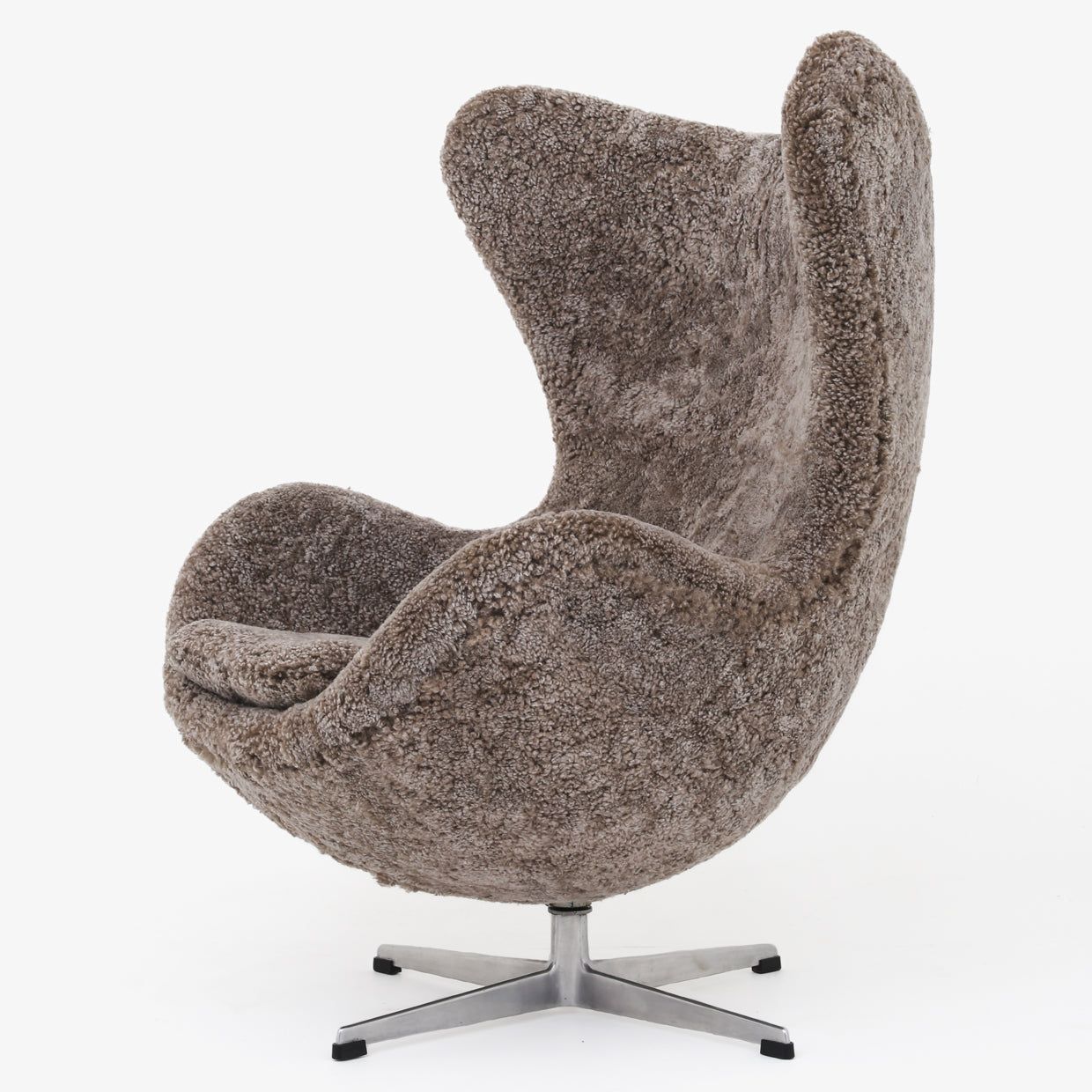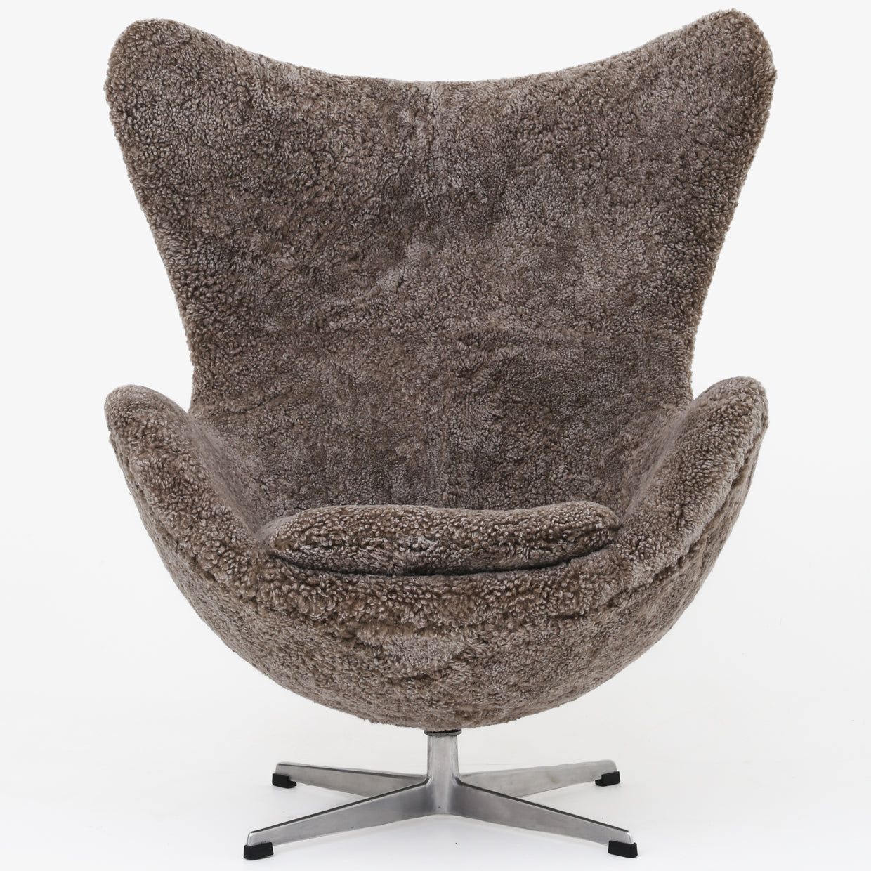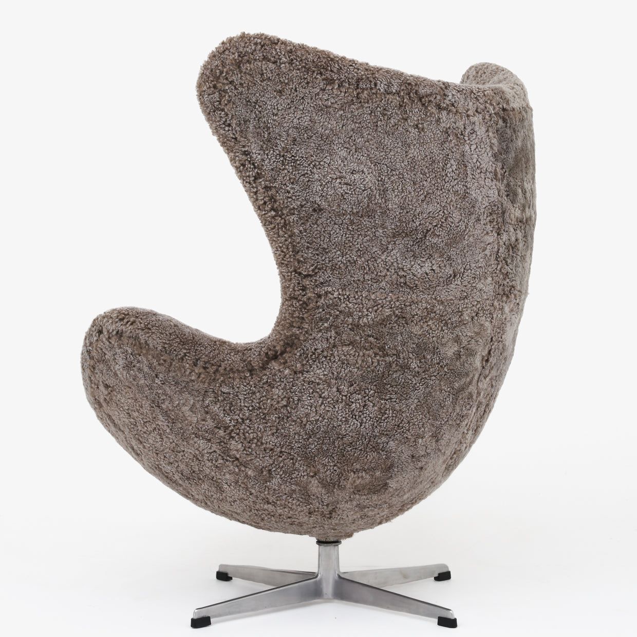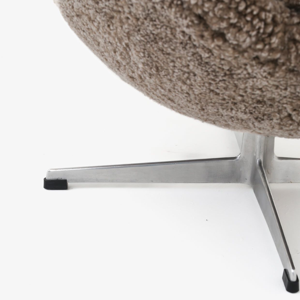 AJ 3316 - Newly upholstered 'Egg' armchair with lambskin ottoman (Sahara 07, Curly 17mm) with solid cast aluminum base.