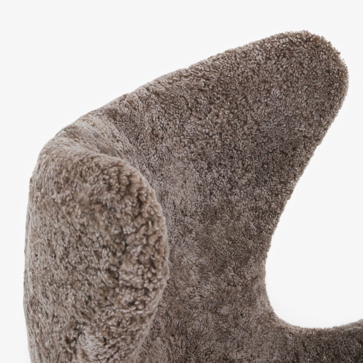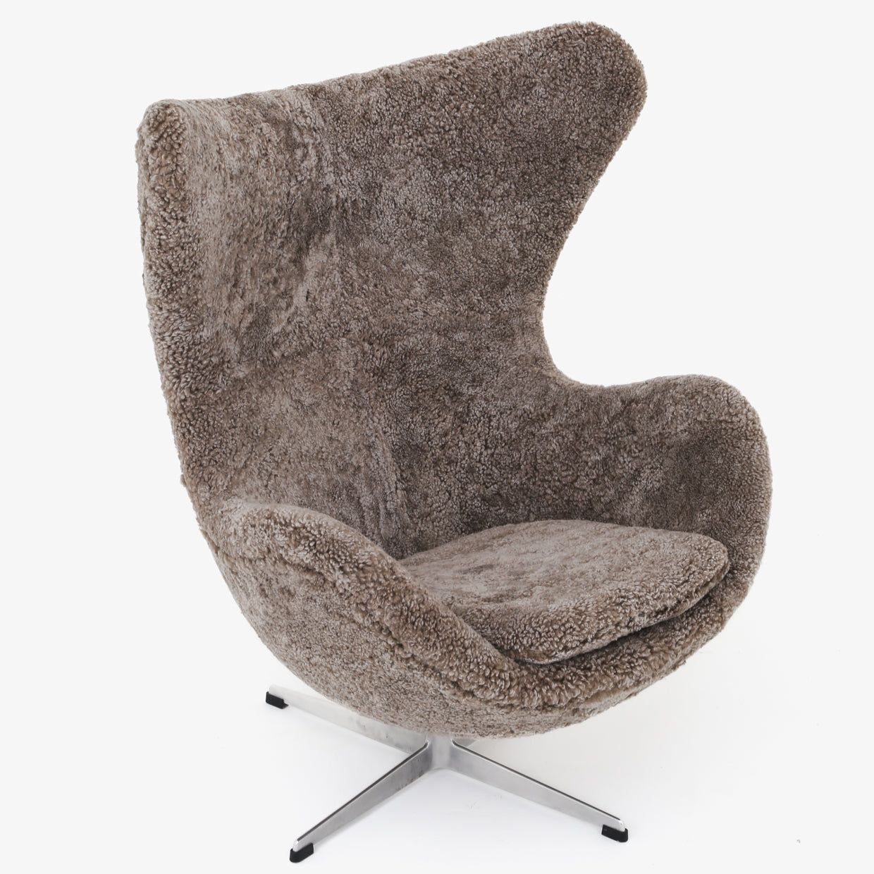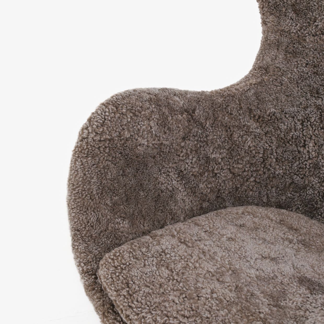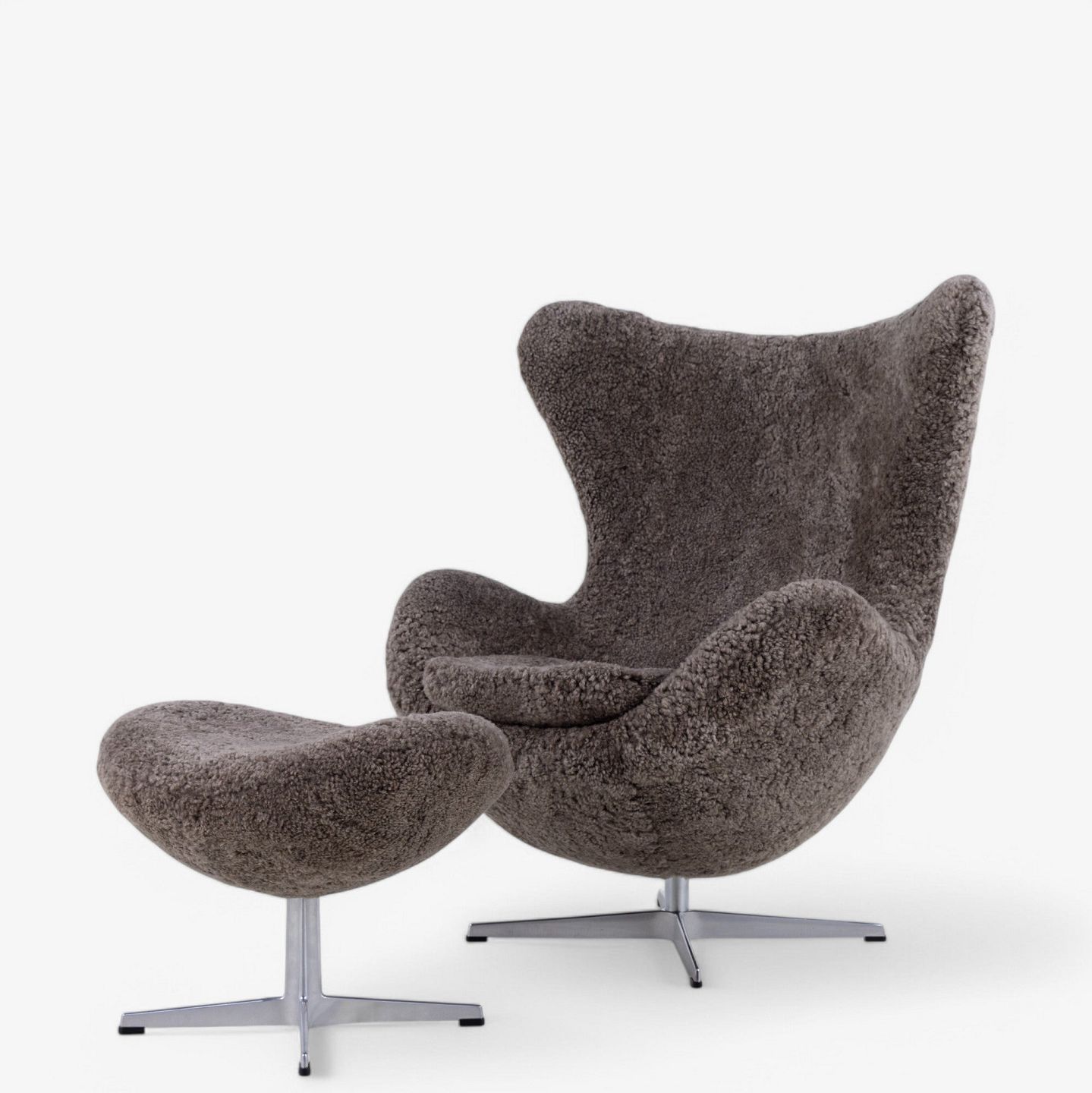 AJ 3316 - Newly upholstered 'Egg' armchair with lambskin ottoman (Sahara 07, Curly 17mm) with solid cast aluminum base.