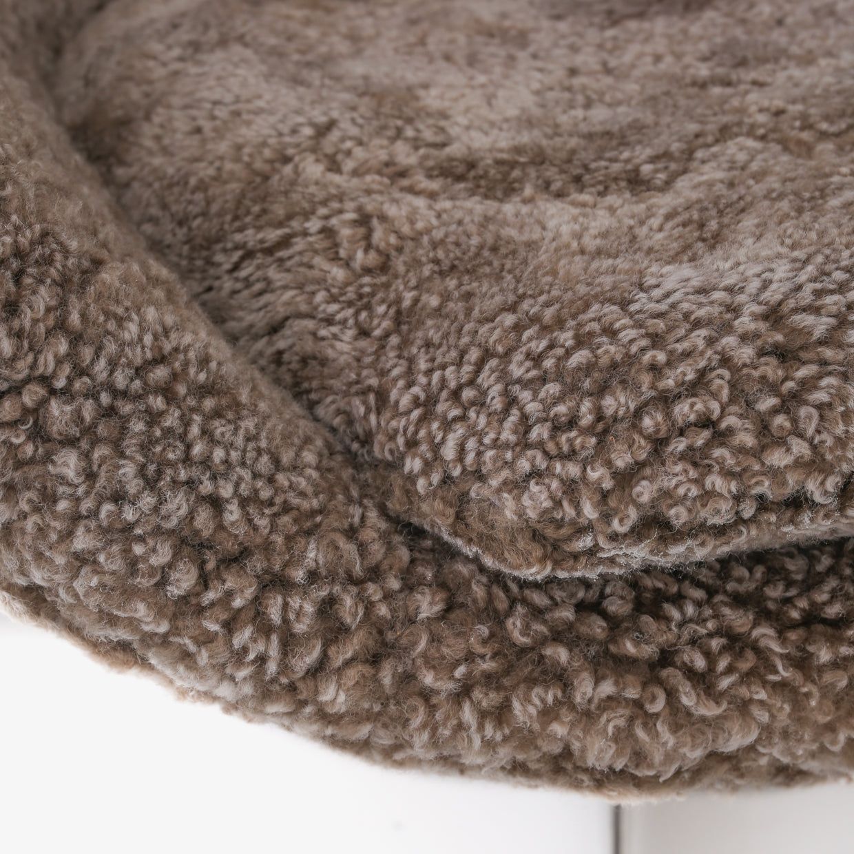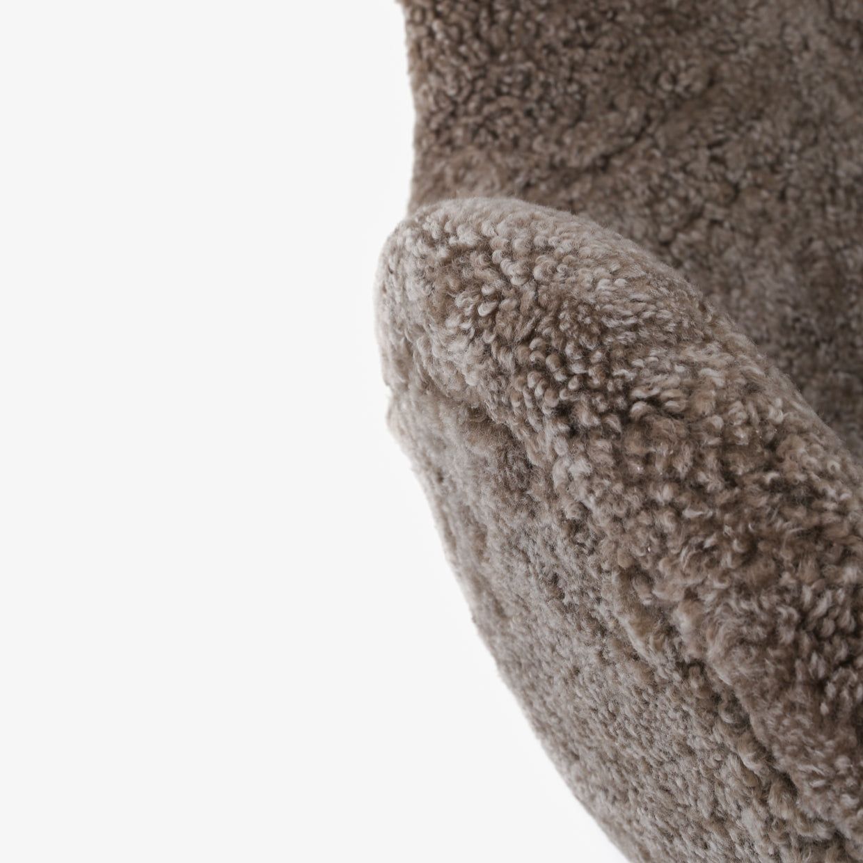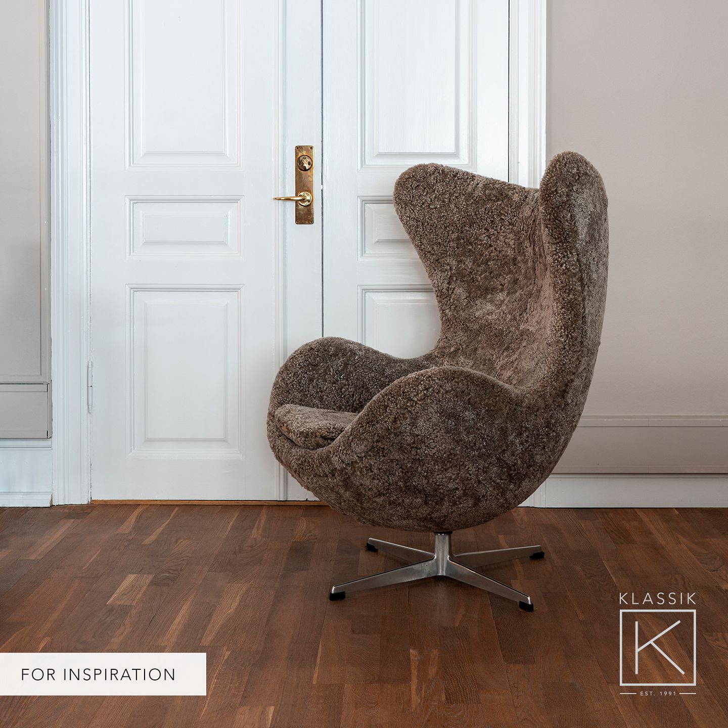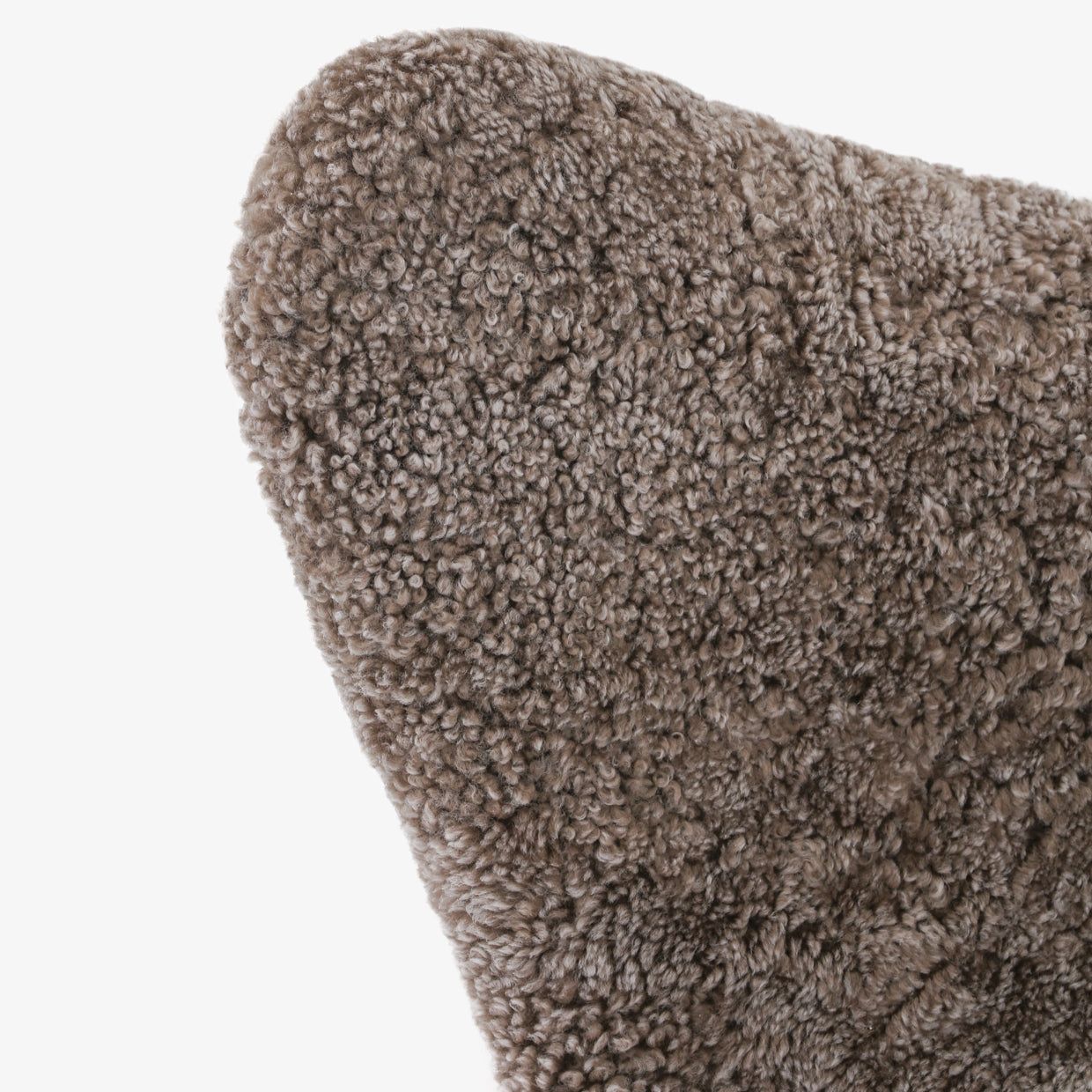 AJ 3316 - Newly upholstered 'Egg' armchair with lambskin ottoman (Sahara 07, Curly 17mm) with solid cast aluminum base.