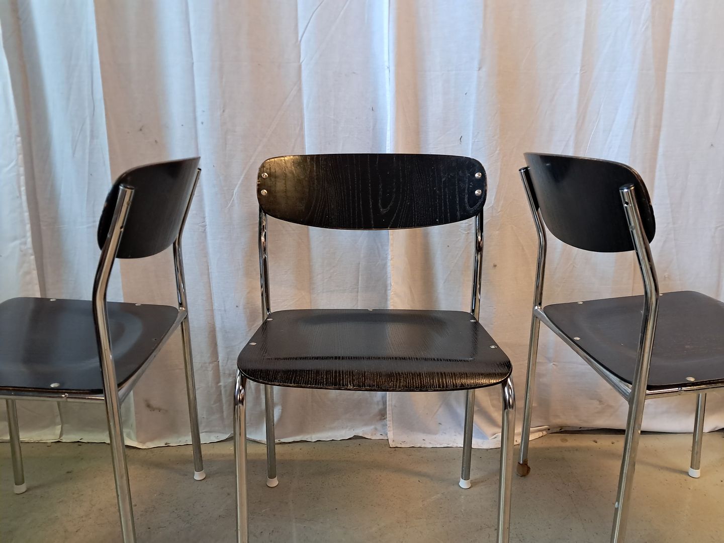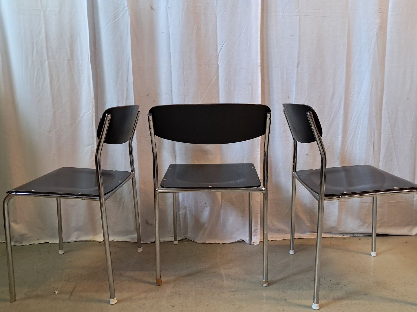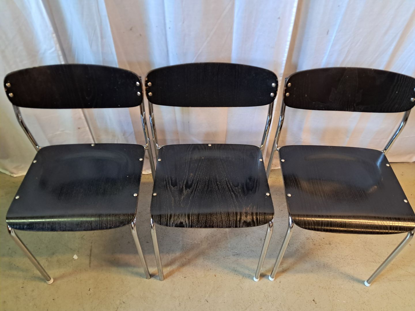 3 Stole i metal og malet træ, fra 1980erne.De har brugsspor og den ene mangler en nitte.