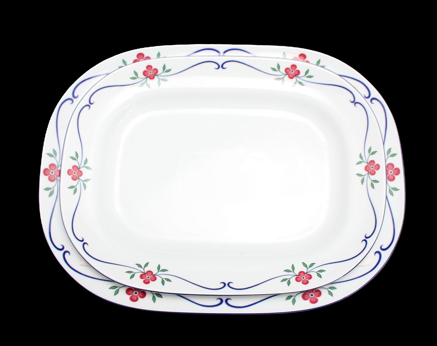 Rørstrand, Sundborn, dishwasher safe porcelæn. Dekoreret af Pia Rönndahl. Fra det oprindelige Rørstrand, da de stadig producerede i Sverige.Stegefad. Længde 35,5 cm. Bredde 27 cm. Højde 3,5 cm. Pris: 450 kr. stk. Lager: 1