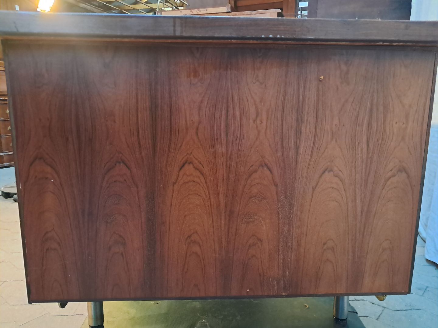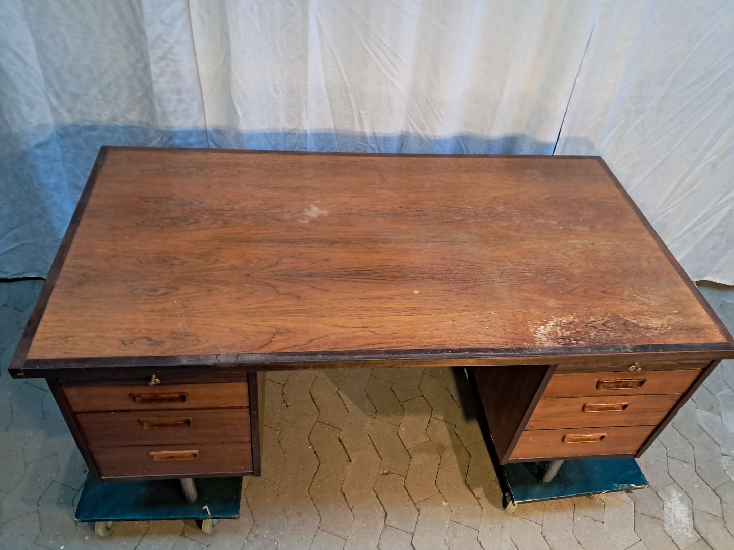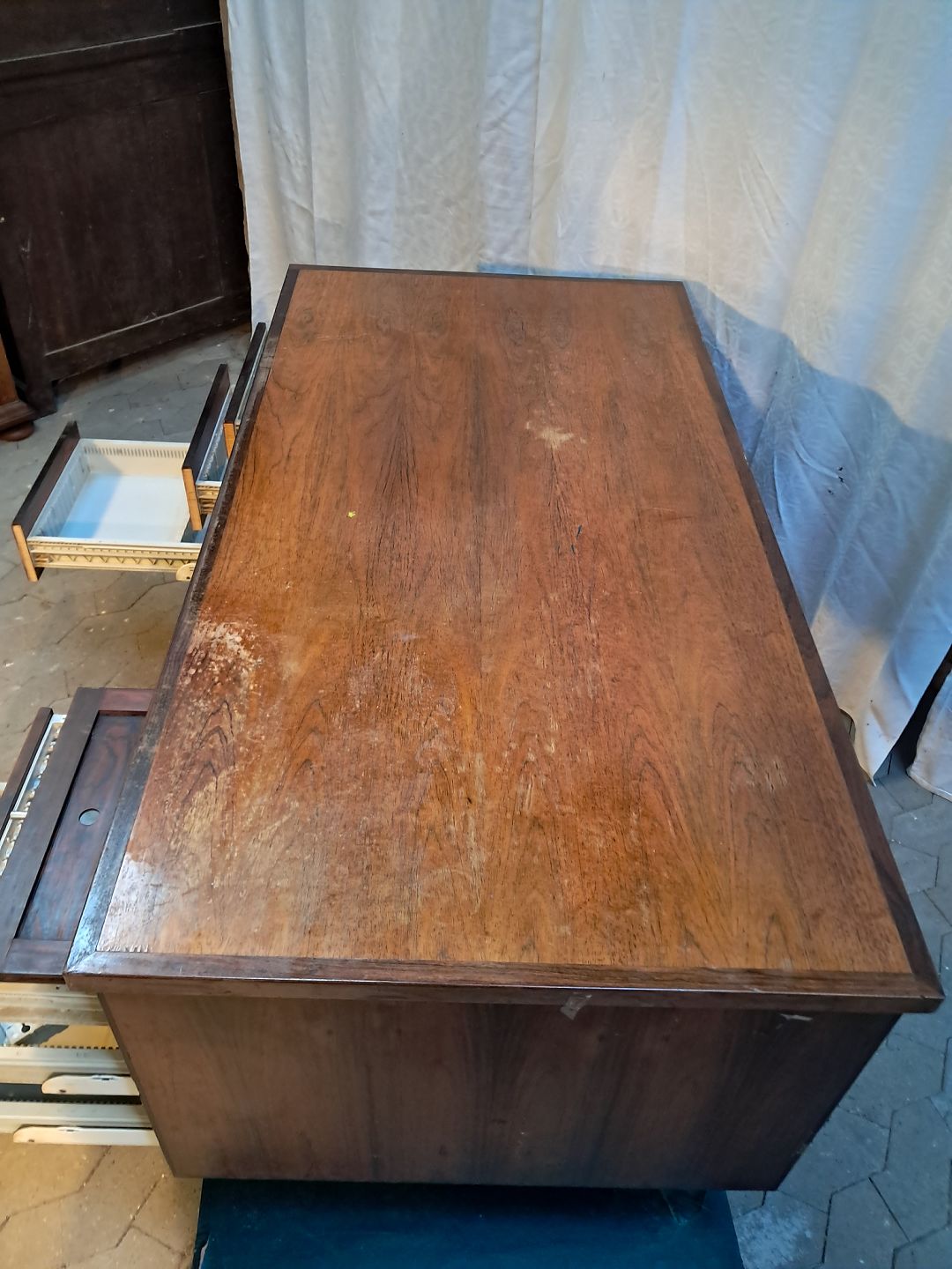 Skrivebord i fineret palisander, fra 1980erne.Det har brugsspor og bordpladen trænger til service.