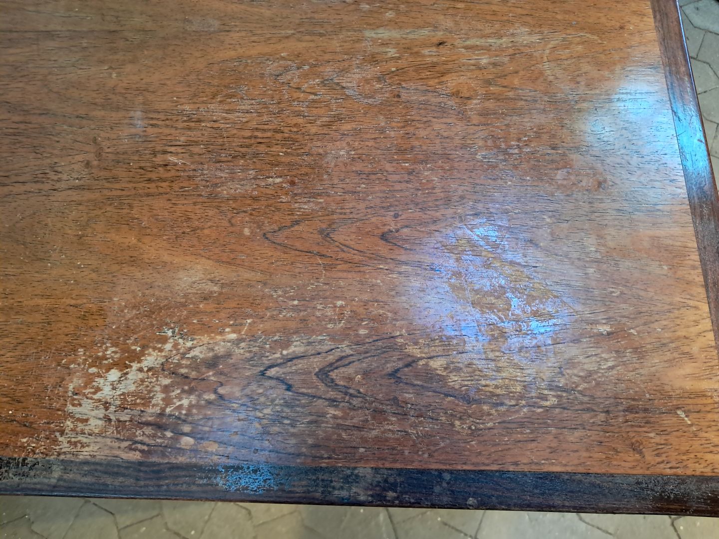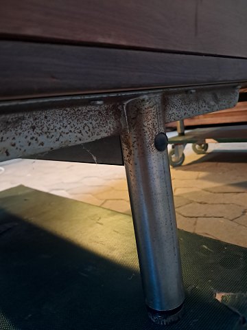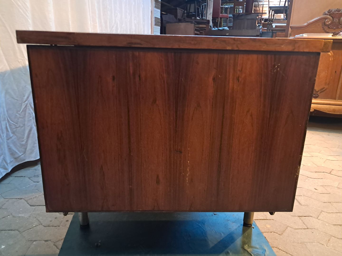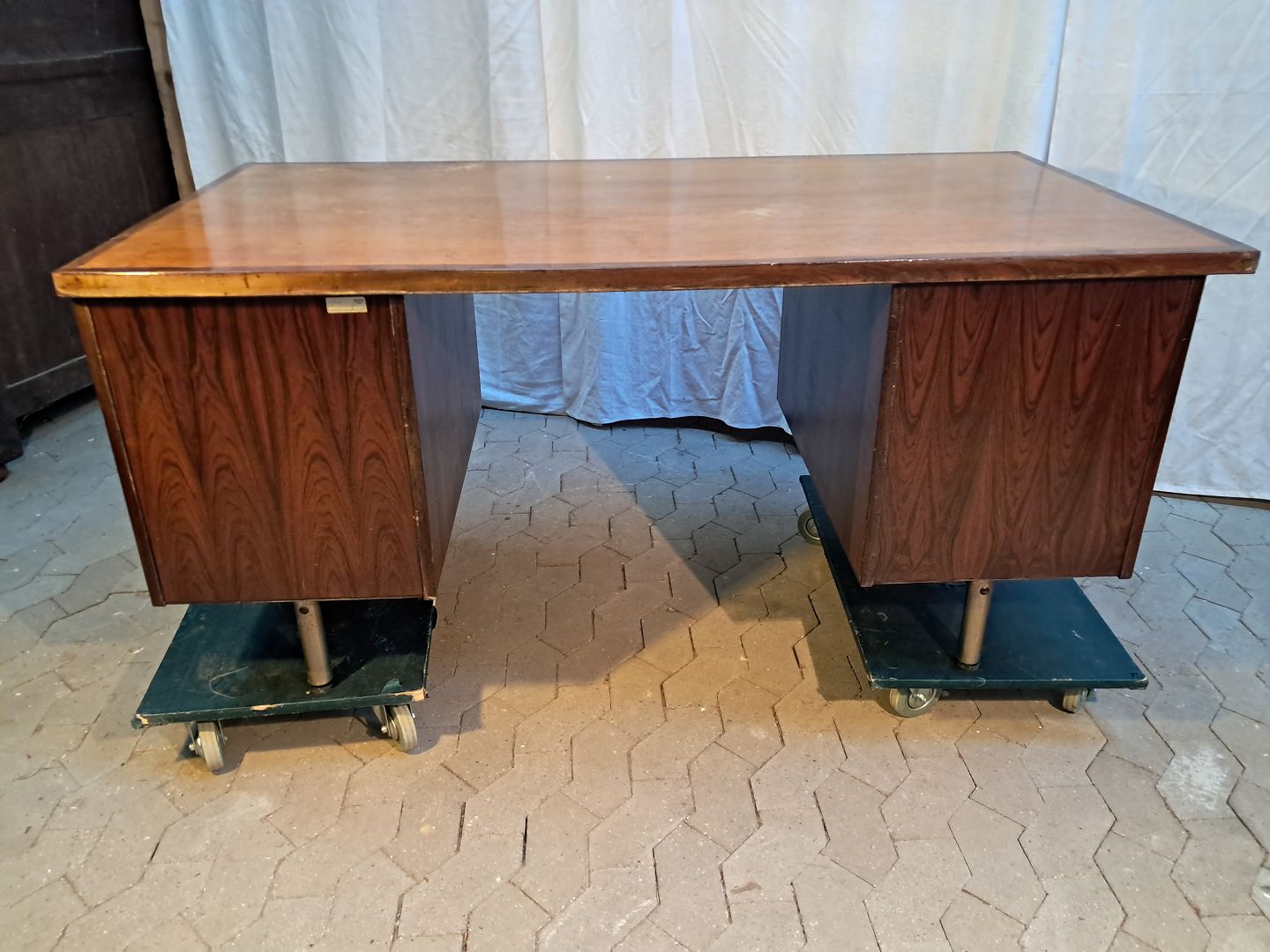 Skrivebord i fineret palisander, fra 1980erne.Det har brugsspor og bordpladen trænger til service.