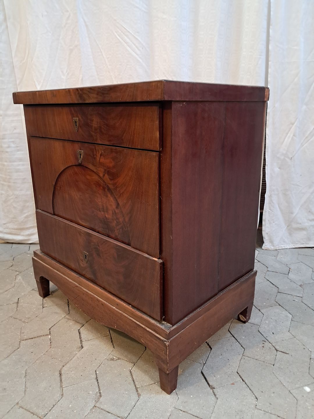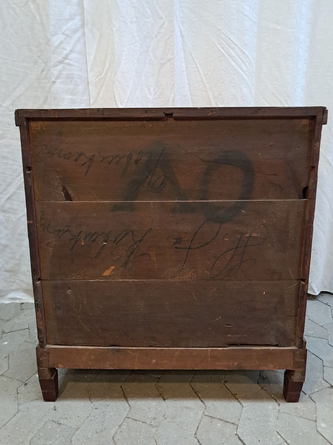 Kommodei fineret mahogni, fra 1910erne.Den har brugsspor og skufferne køre dårligt/trænger til service.