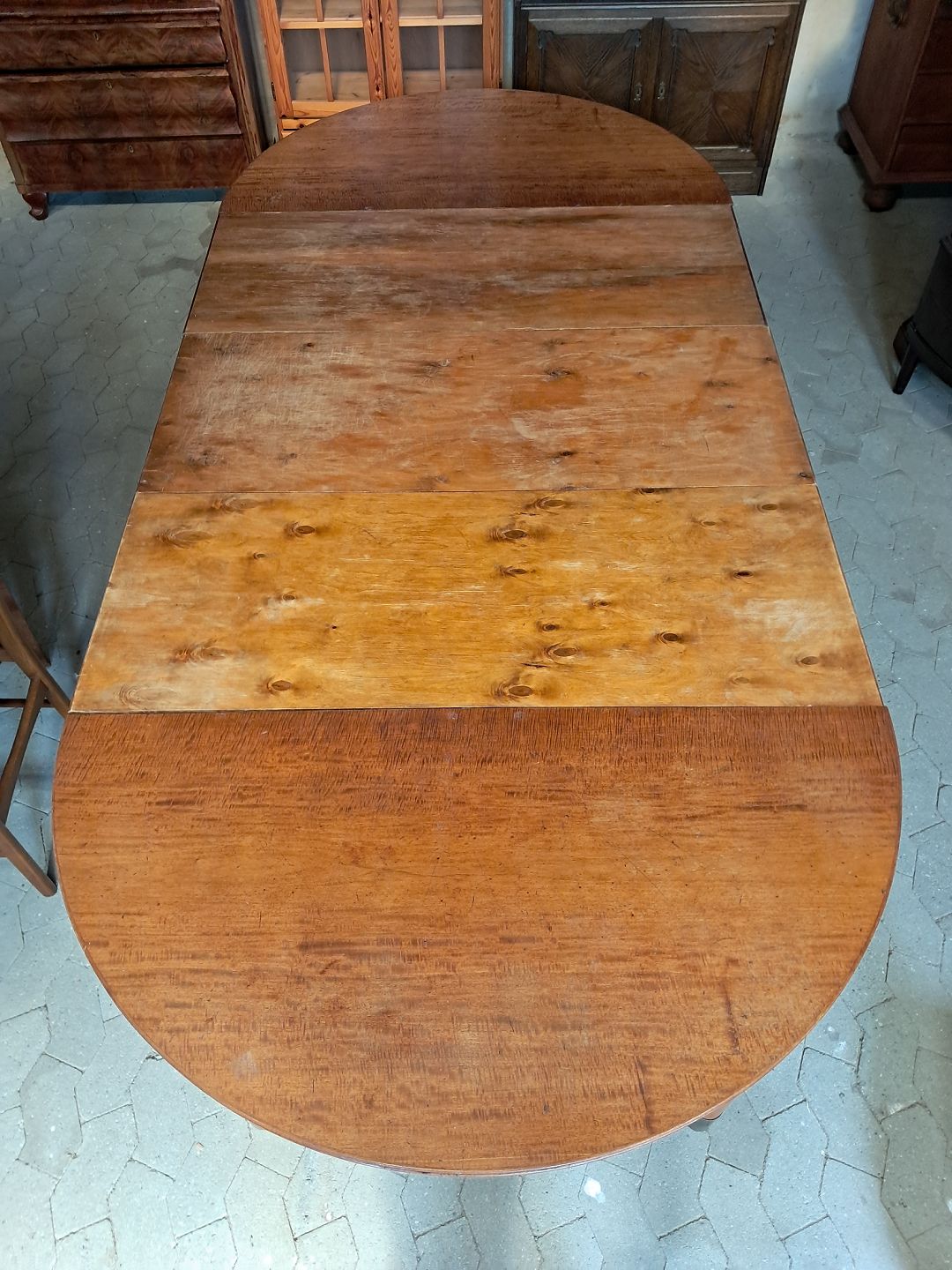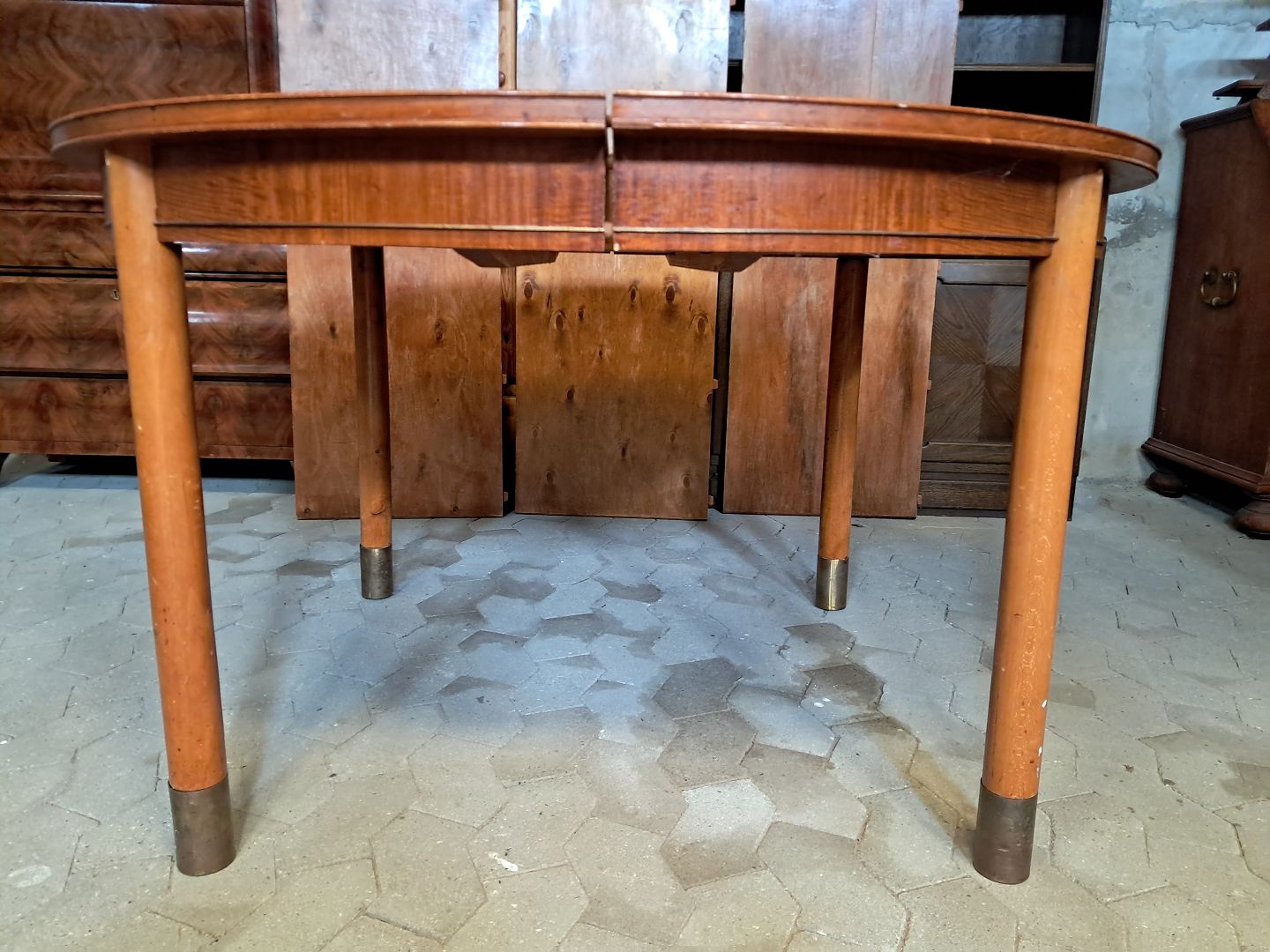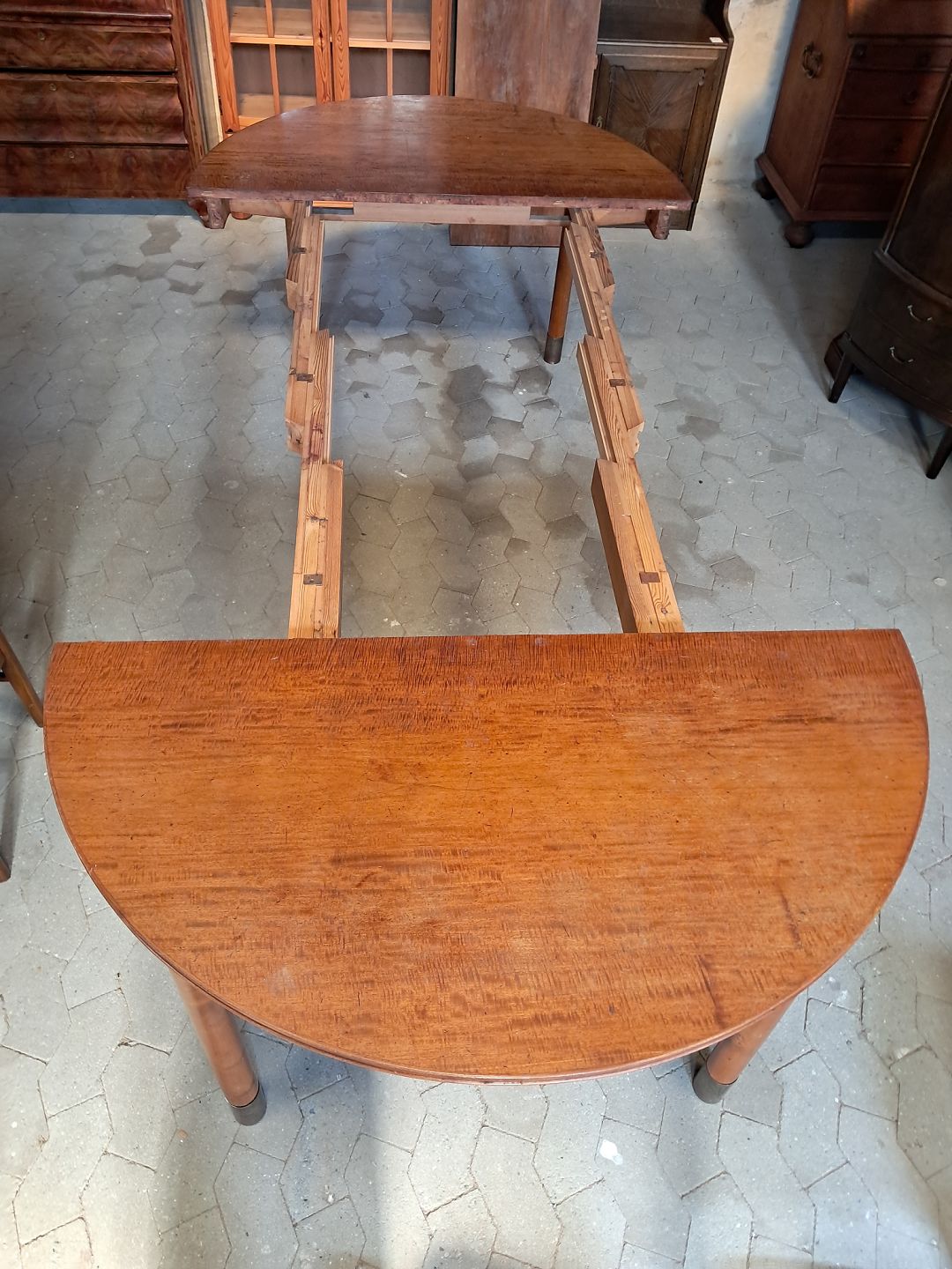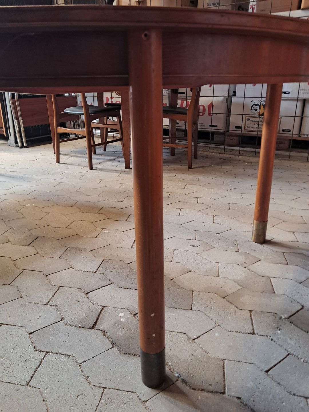 Spisebord i fineret mahogni med 3 tillægsplader, fra 1950erne.Det har brugsspor.