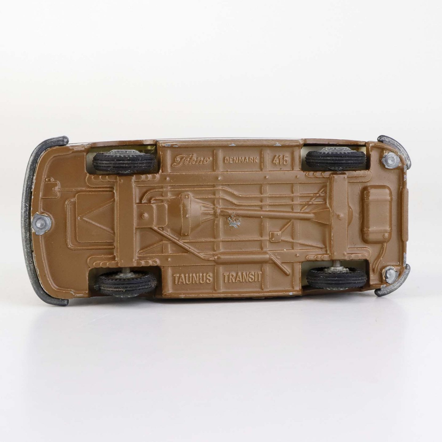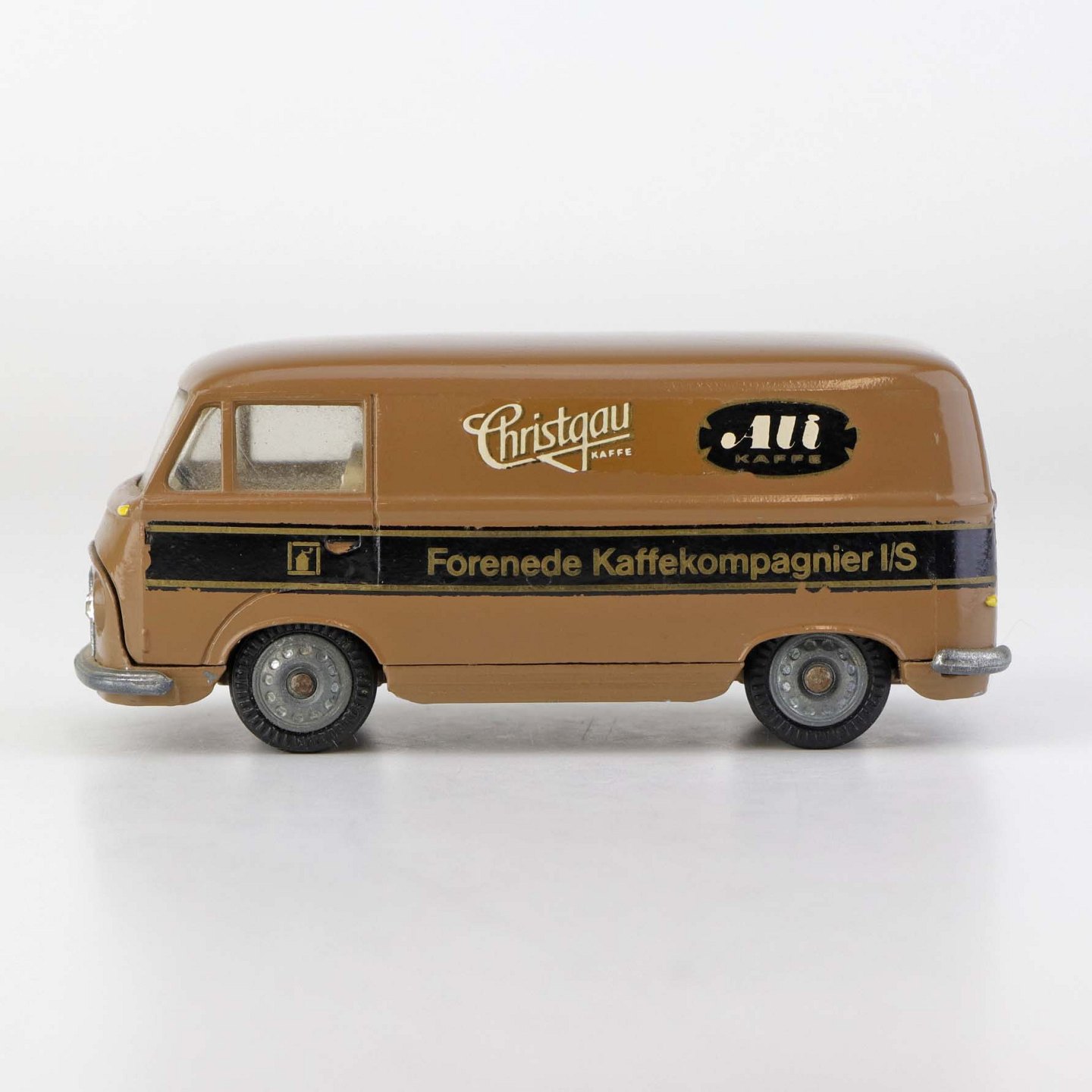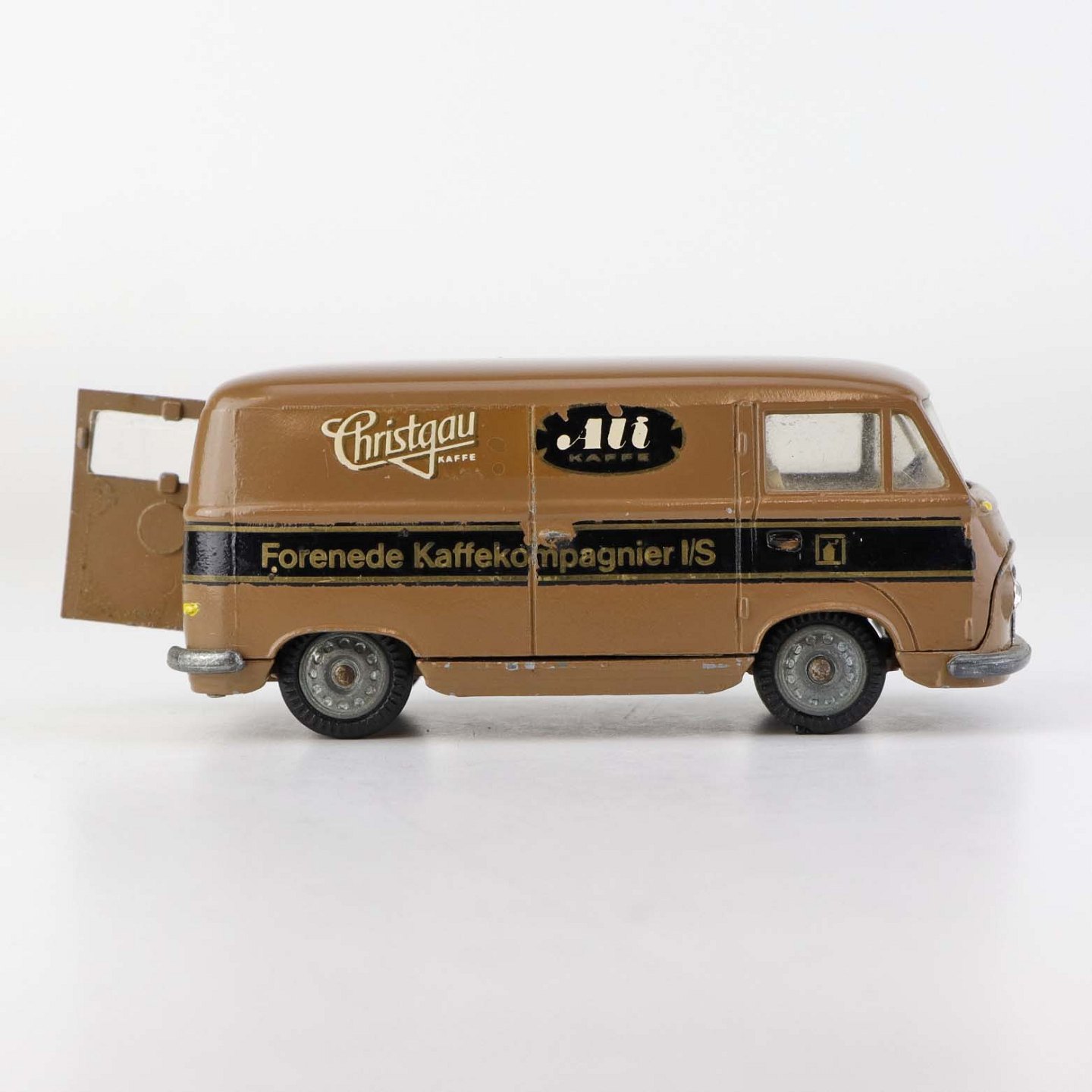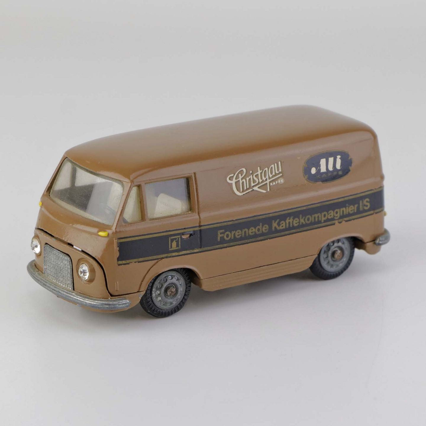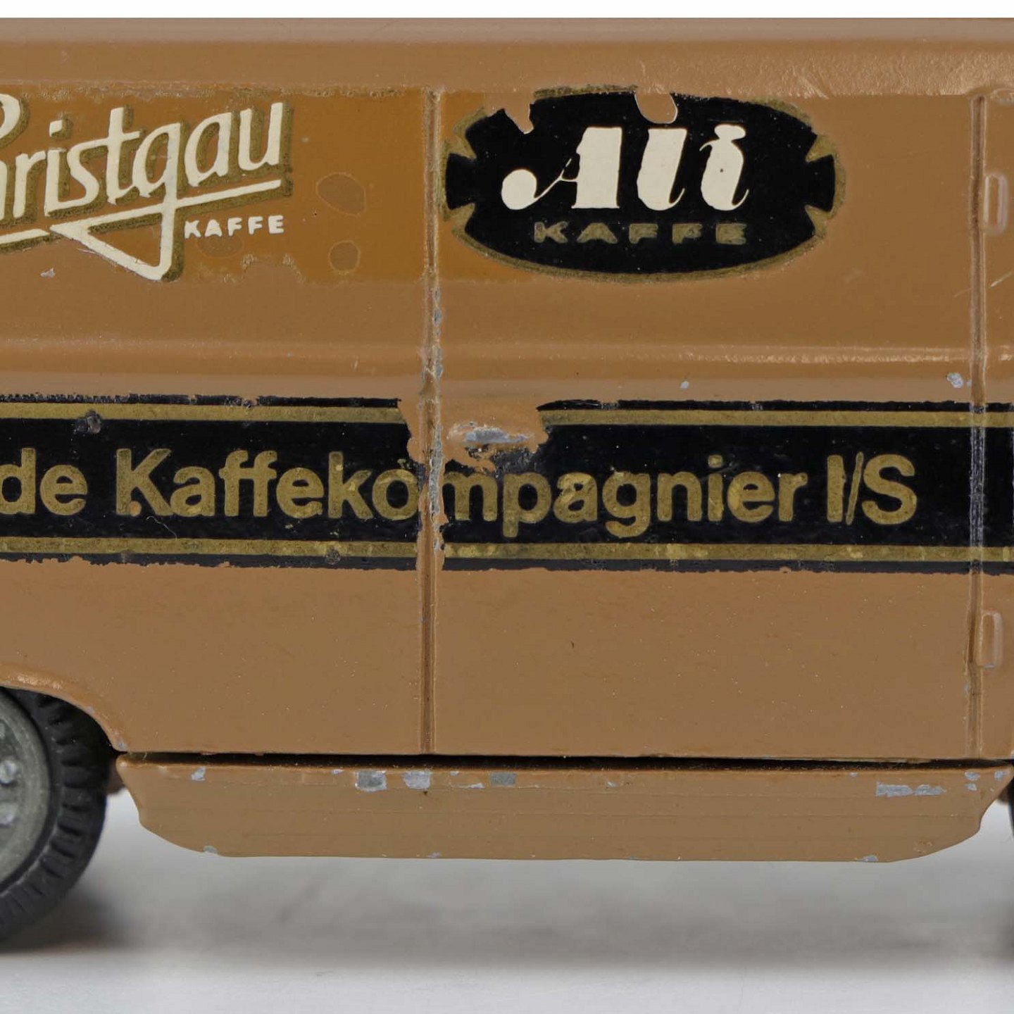 Taunus Transit legetøjsbil i brunlakeret metal med gummi hjul og teksten Ali Kaffe, Forenede kaffekompagnier. Nr. 415Producent Tekno, Denmark