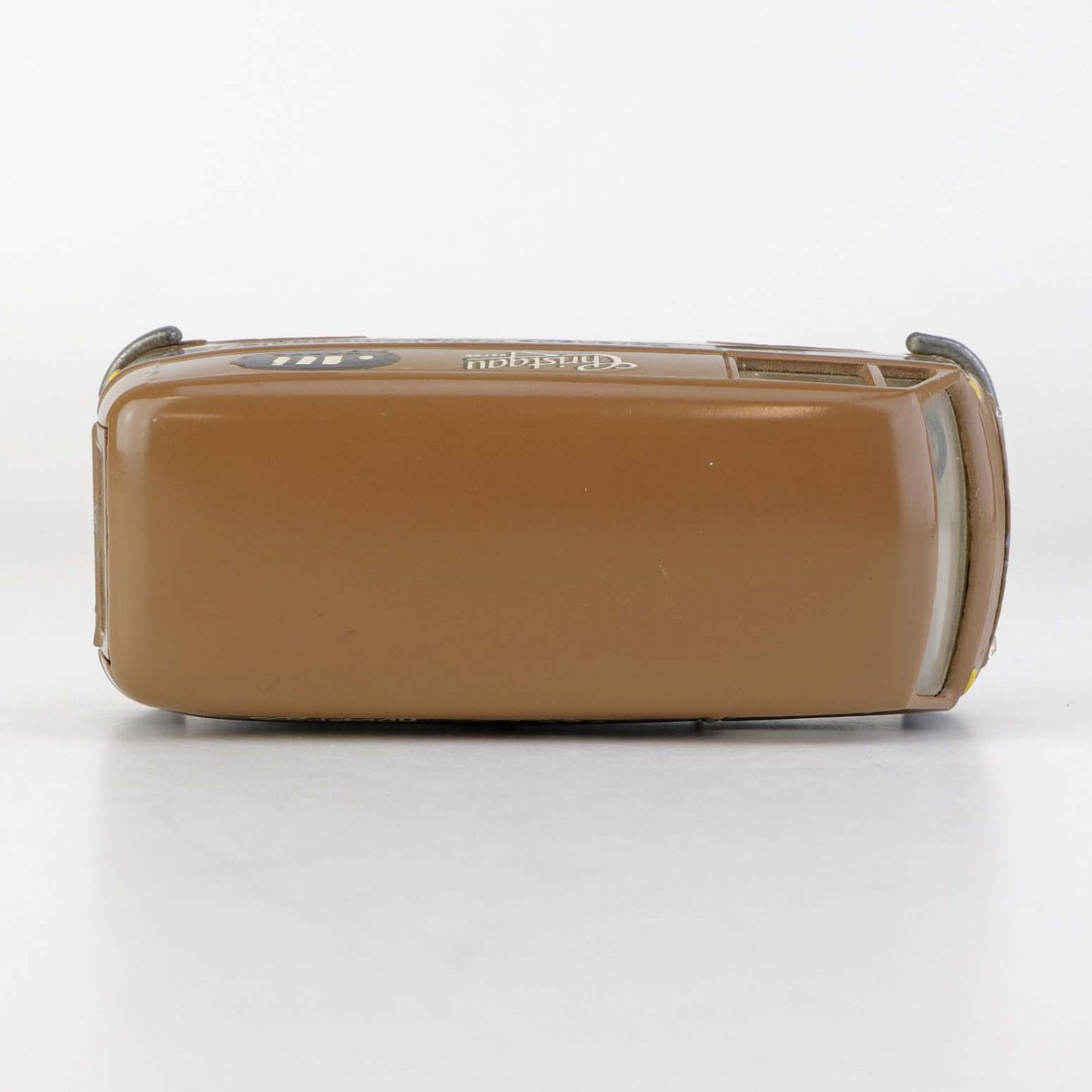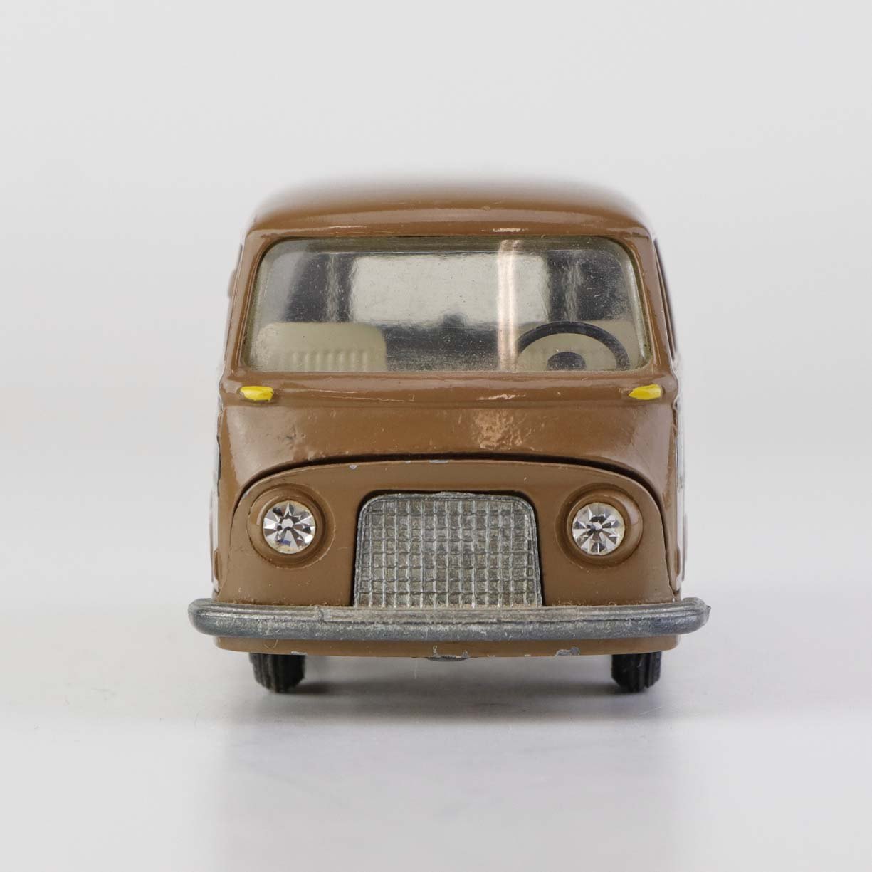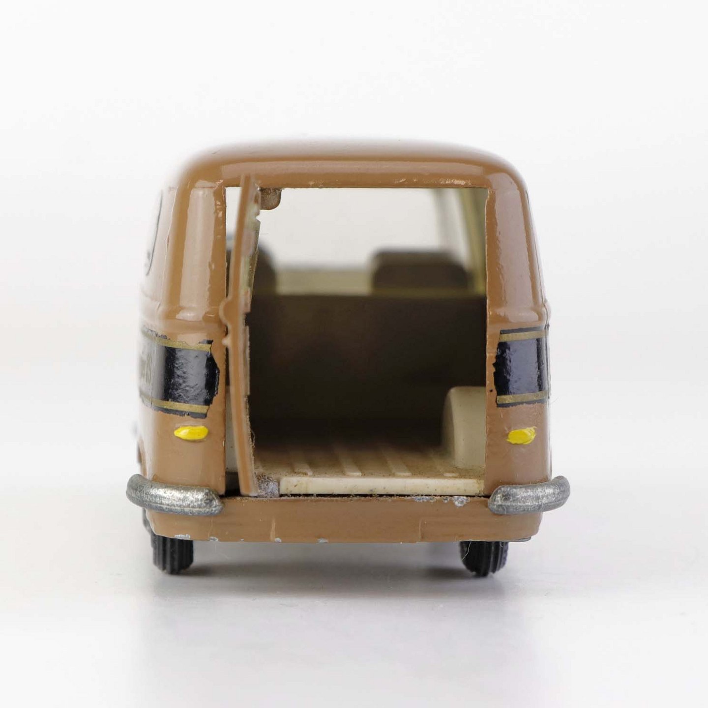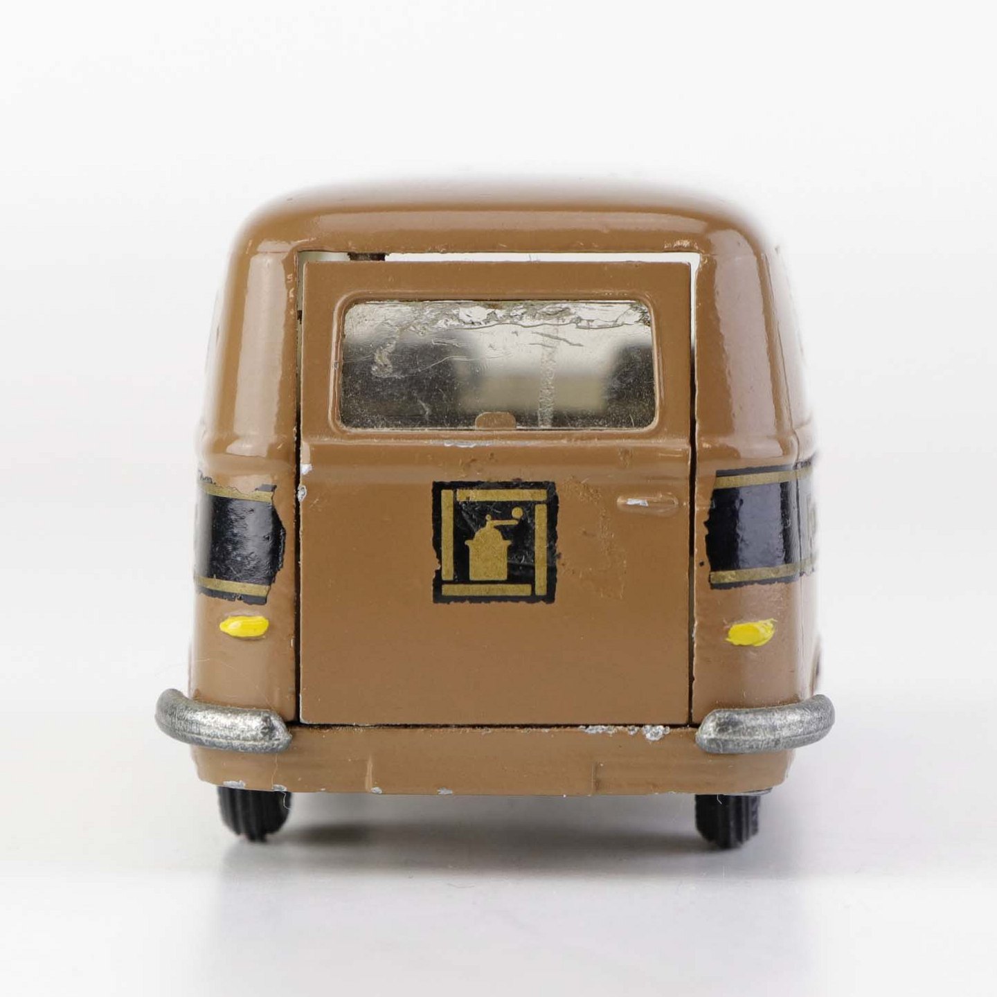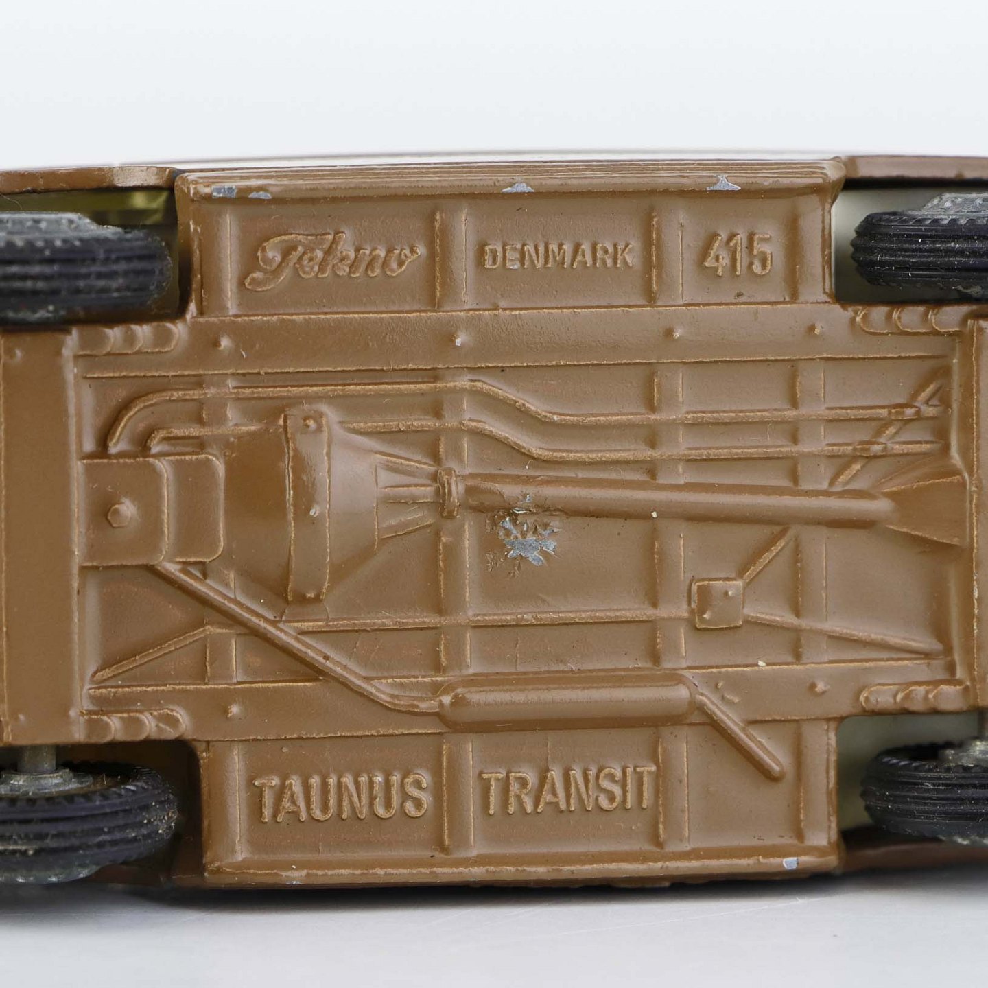 Taunus Transit legetøjsbil i brunlakeret metal med gummi hjul og teksten Ali Kaffe, Forenede kaffekompagnier. Nr. 415Producent Tekno, Denmark
