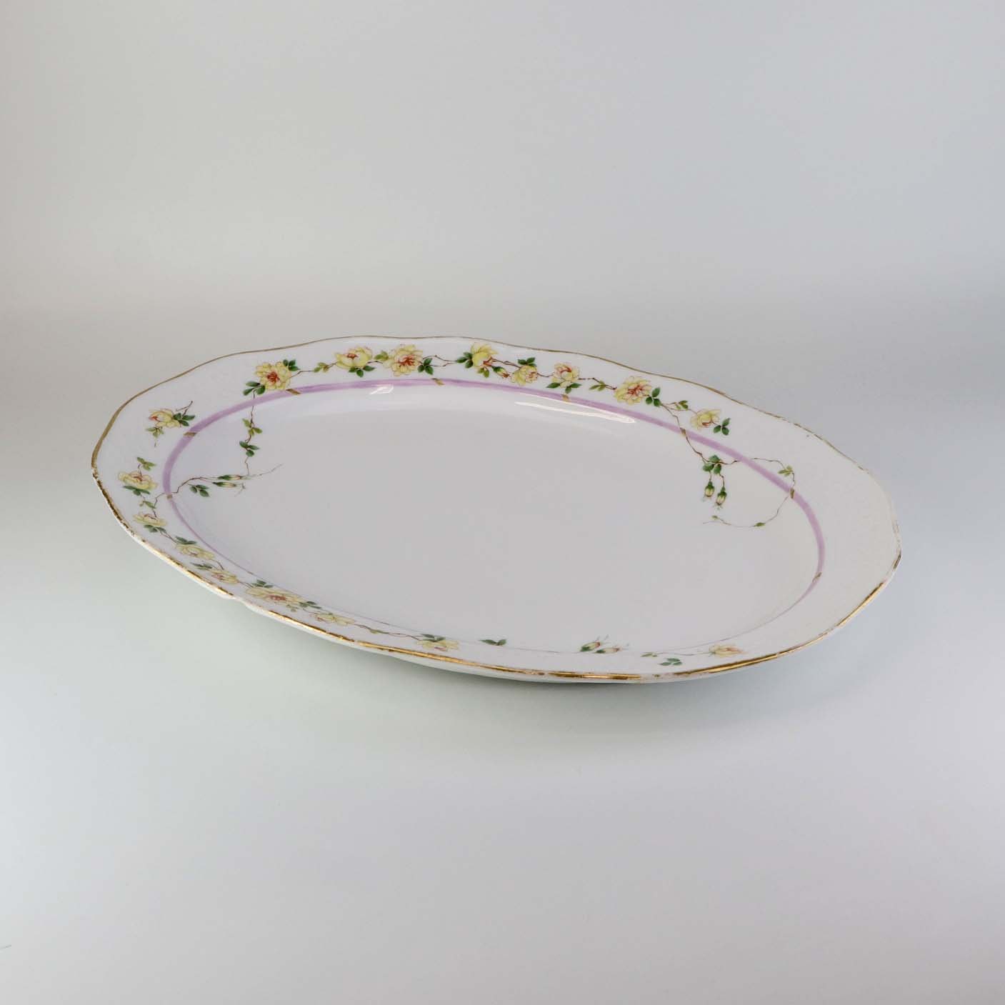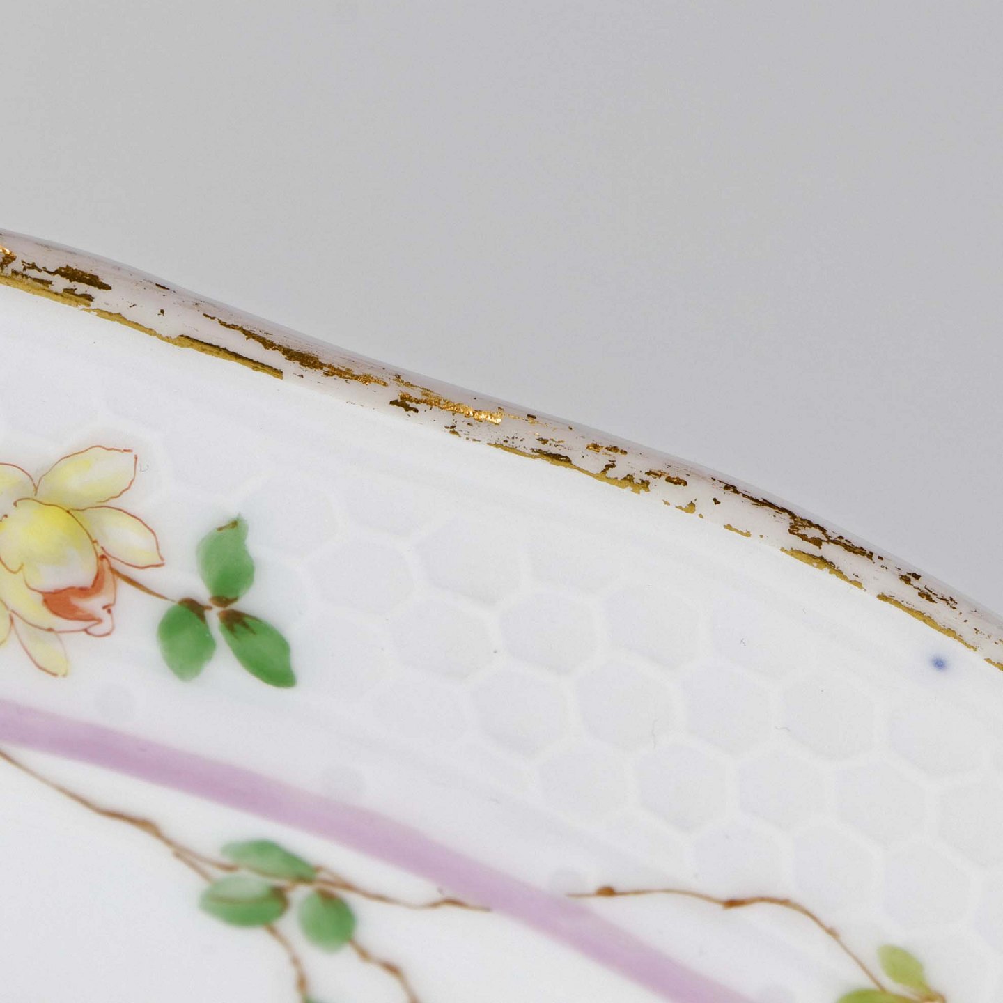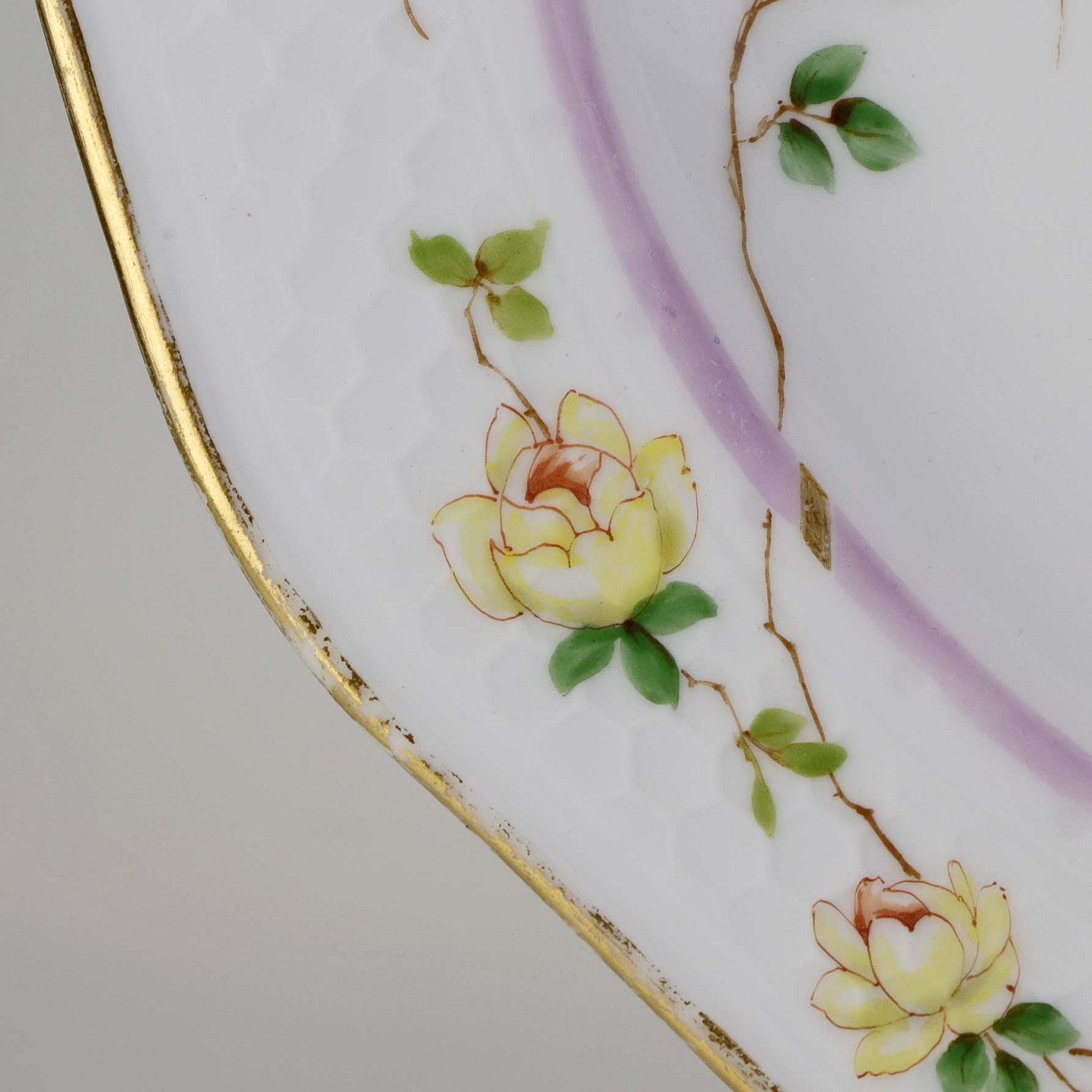 Service i hvidt porcelæn med hamret kantmønster dekoreret med gule blomsterranker og lyslilla streg. Stellet er med guldkant og det er mærket med bølger anvendt frem til 1890.