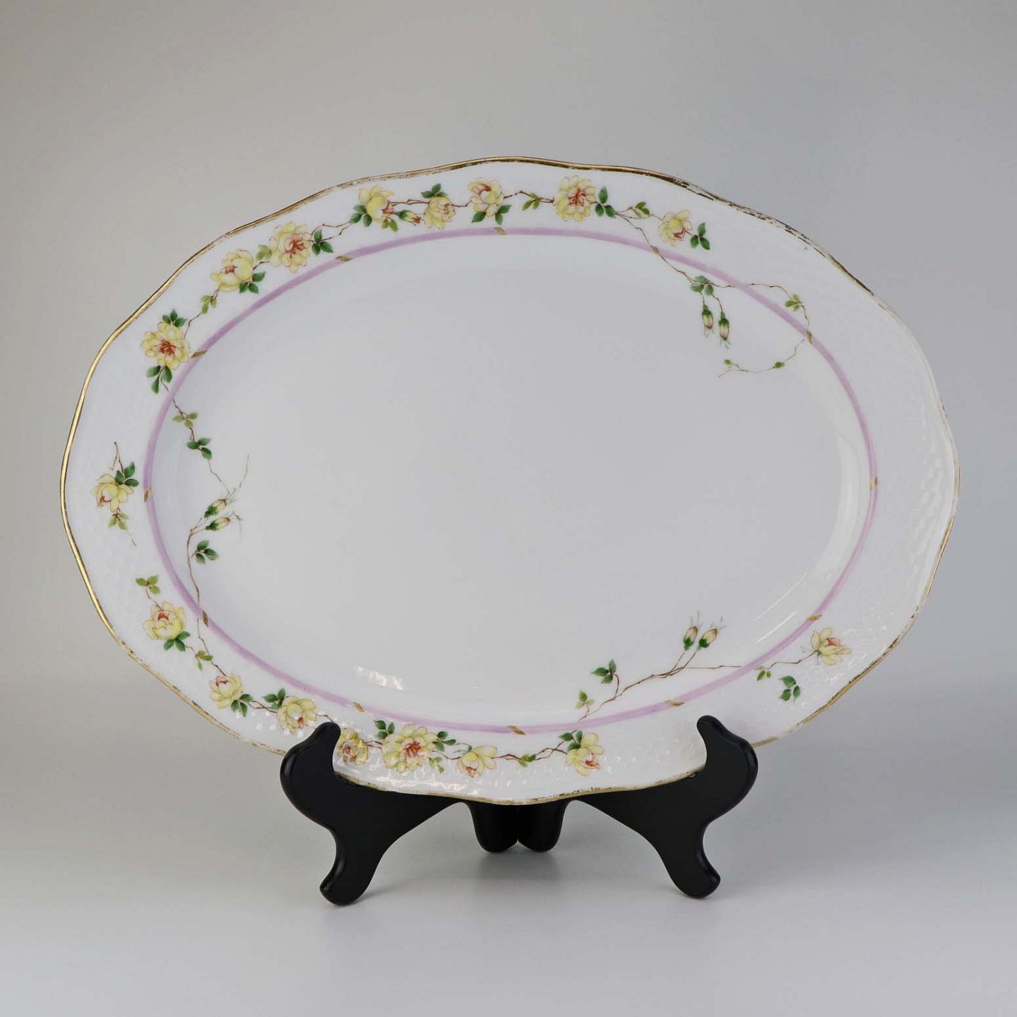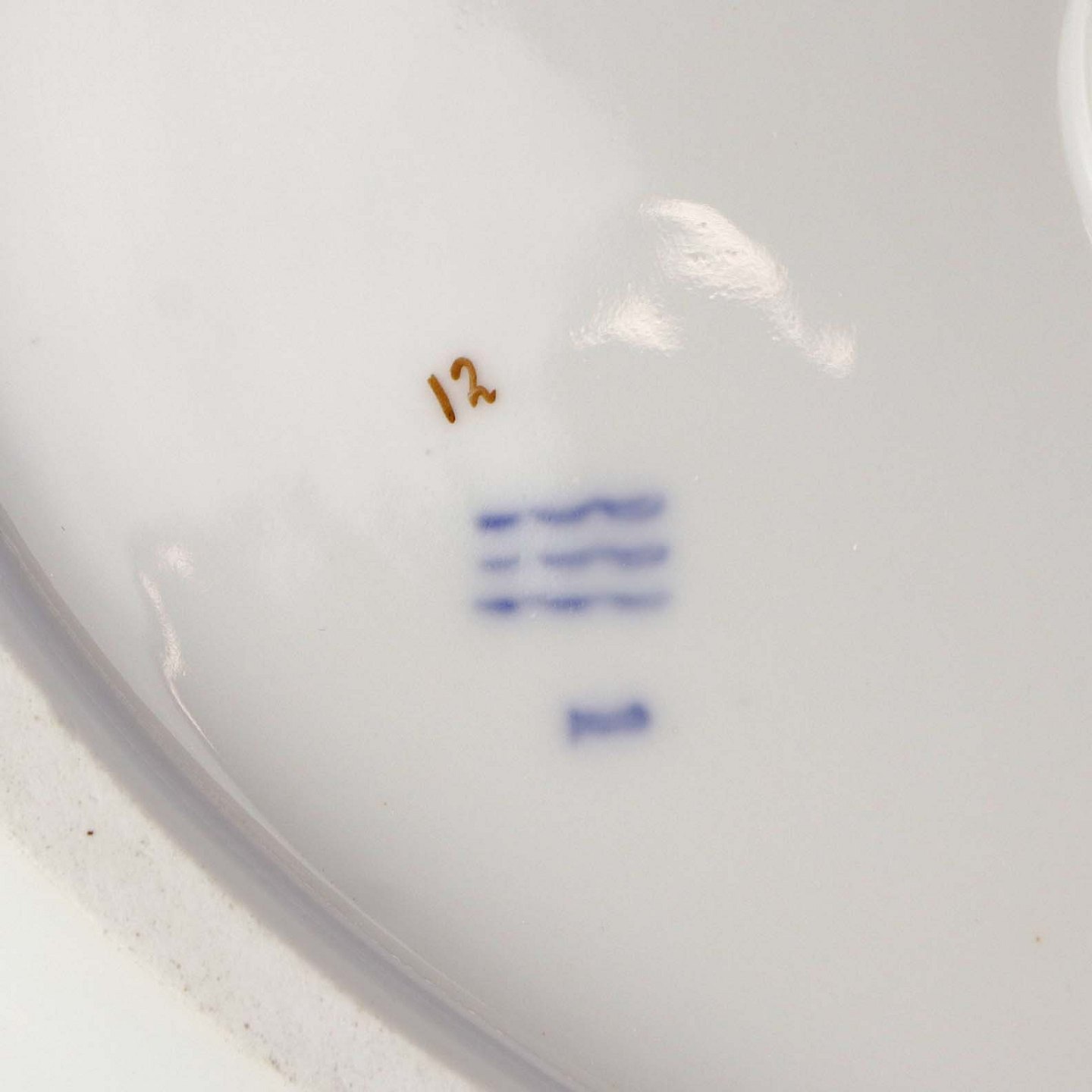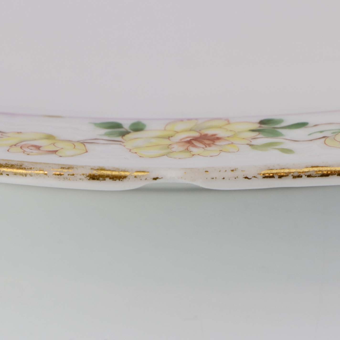Service i hvidt porcelæn med hamret kantmønster dekoreret med gule blomsterranker og lyslilla streg. Stellet er med guldkant og det er mærket med bølger anvendt frem til 1890.