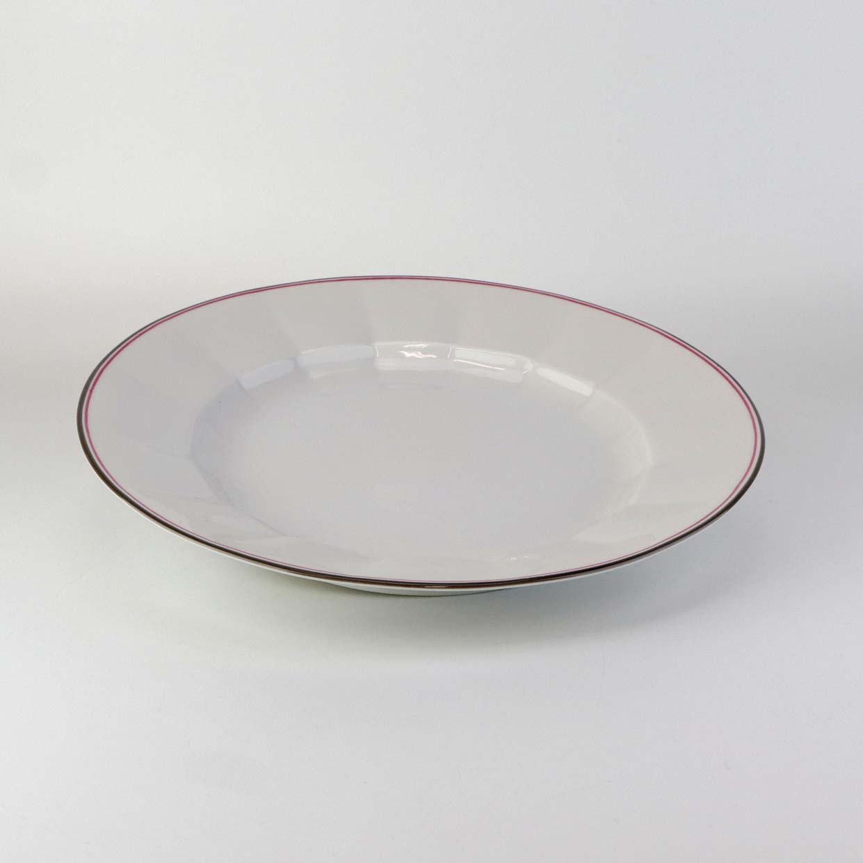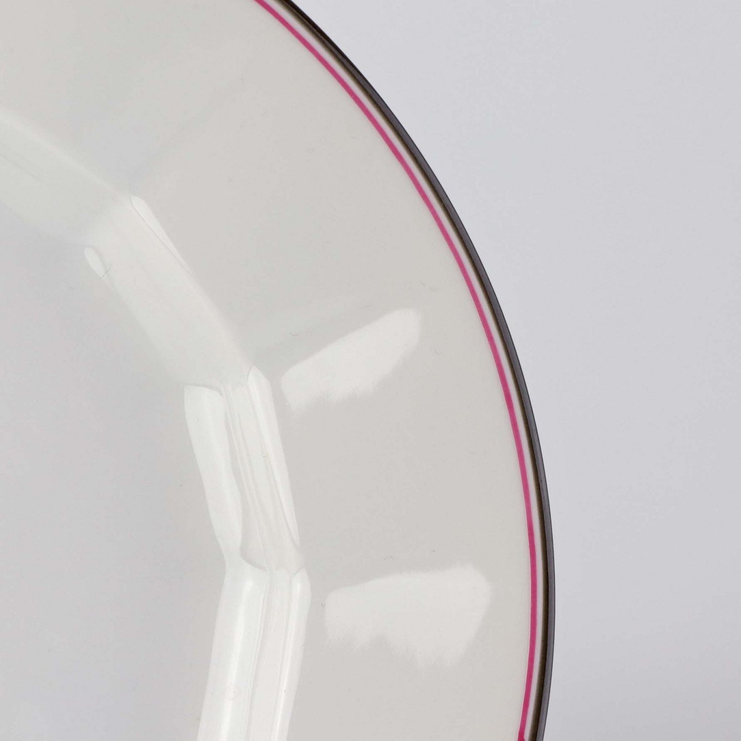Service i kantet hvidt porcelæn dekoreret med lyserød og grå stribe ved kant.