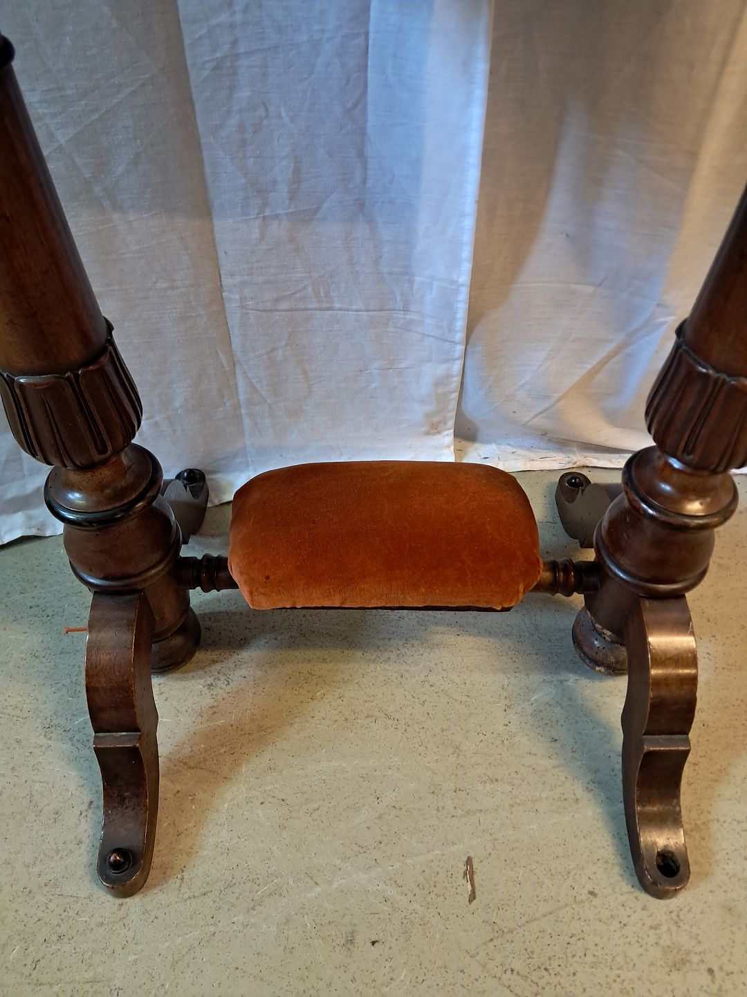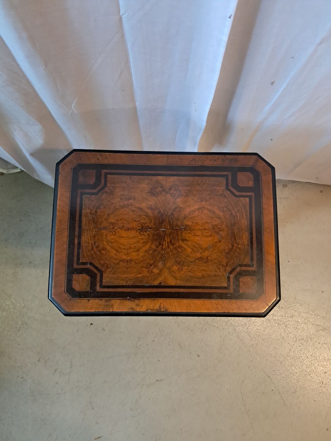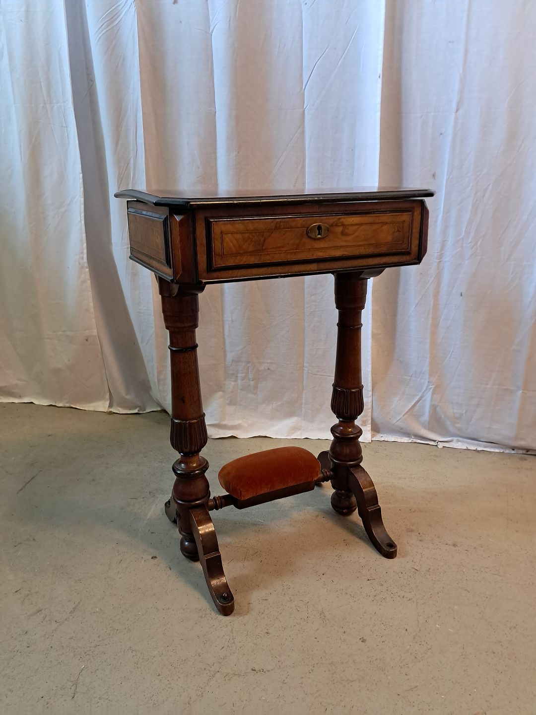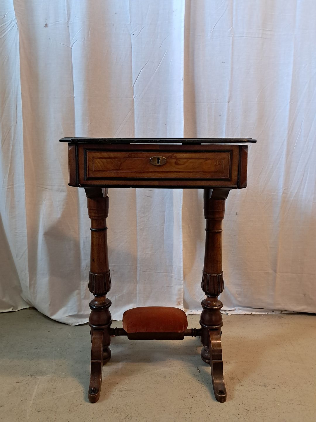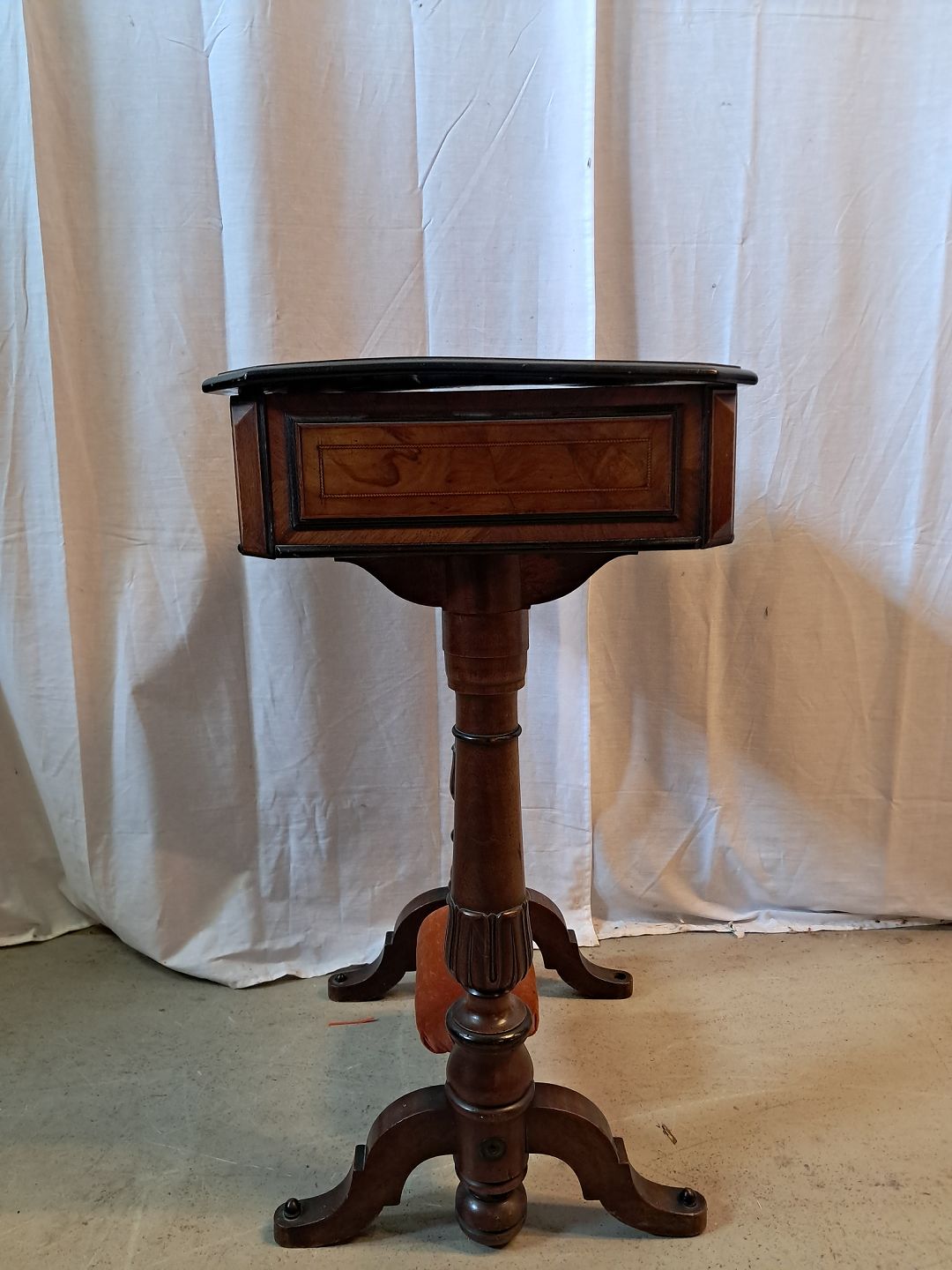 Sybord i fineret mahogni, fra 1910erne.Det har brugsspor og toppladen buer lidt.