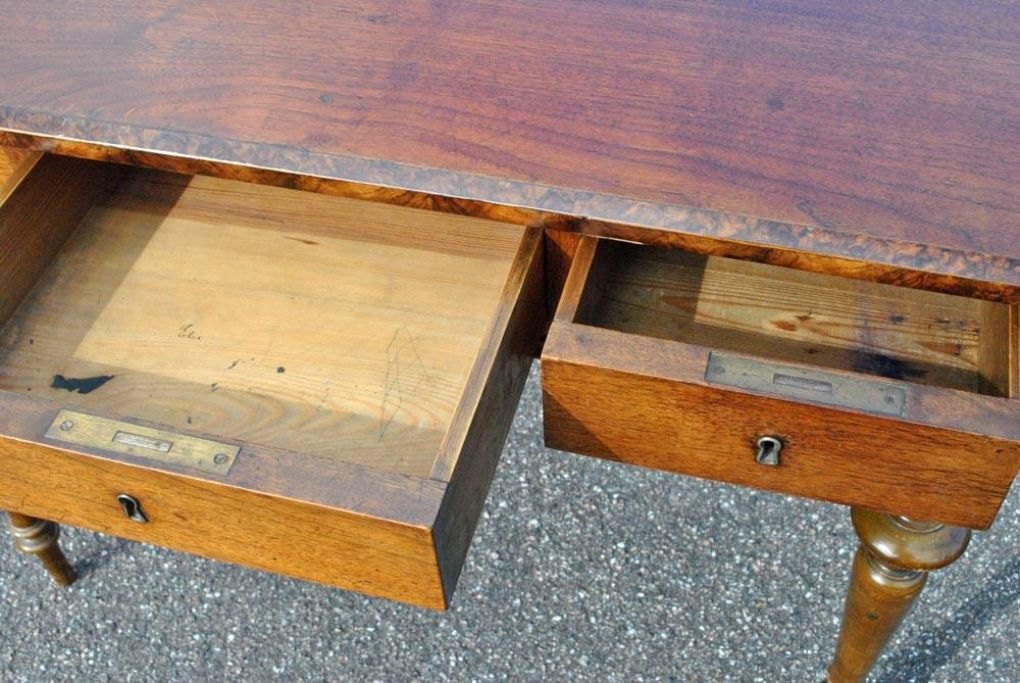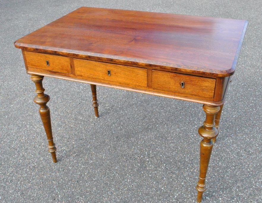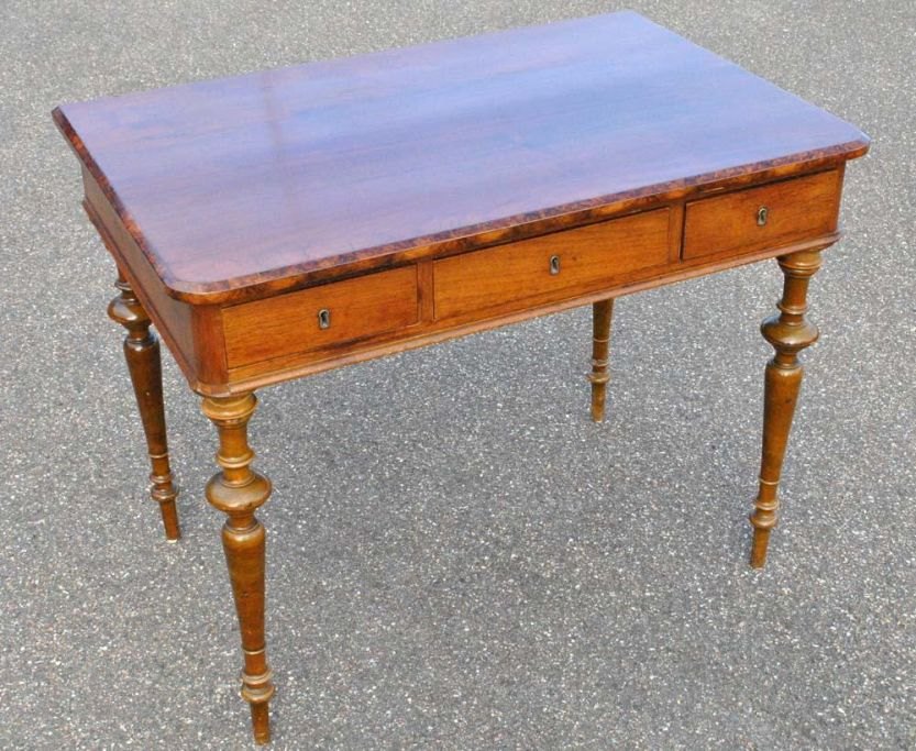 Neo-rococo women's desk of walnut and mahogany, polished beech legs. Front with three drawers. B. 95 / D. 62 / H. 73 cm.Item number: 15238