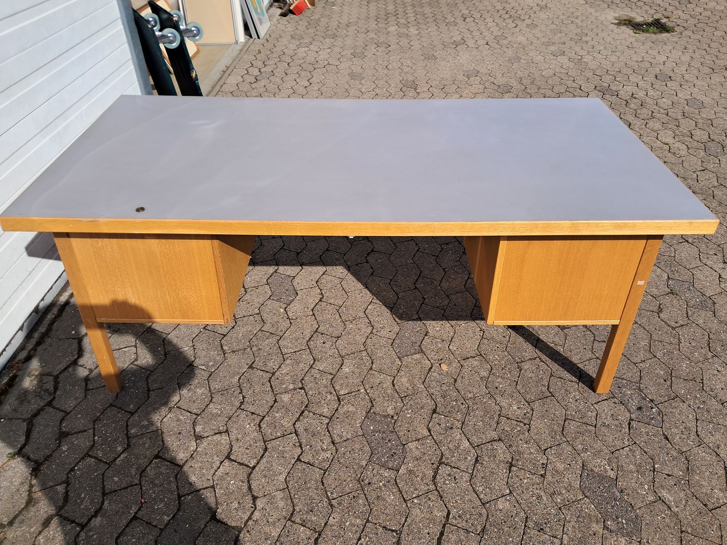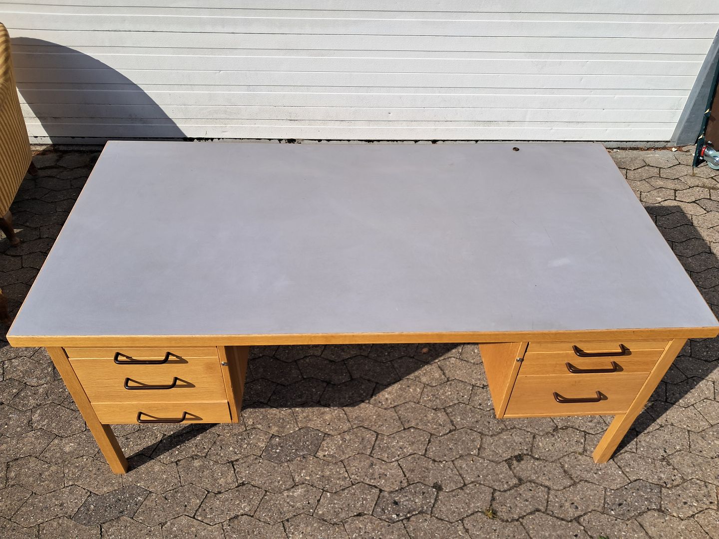 Skrivebord i egetræ med linoleumsplade, fra 1980erne.Det har brugsspor.