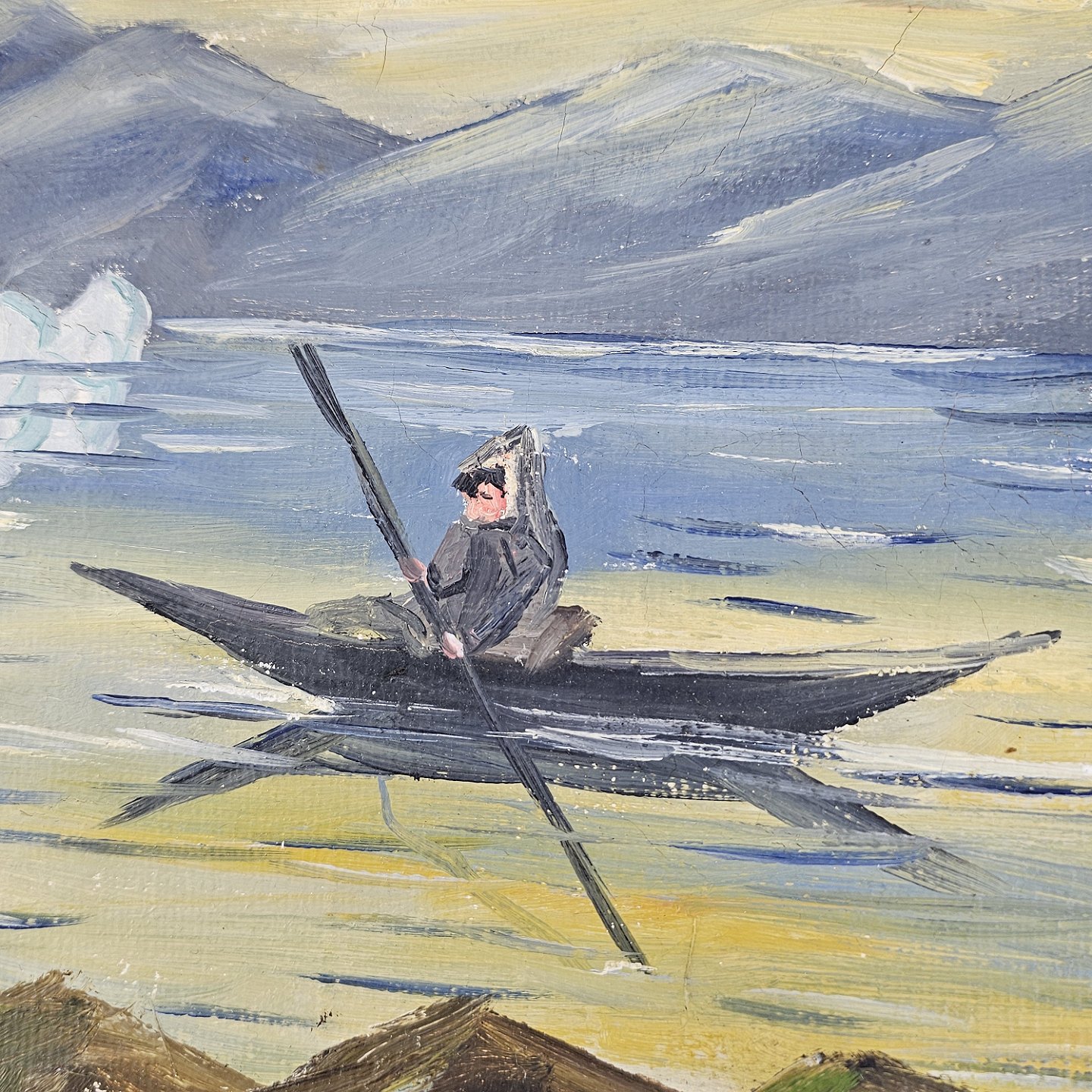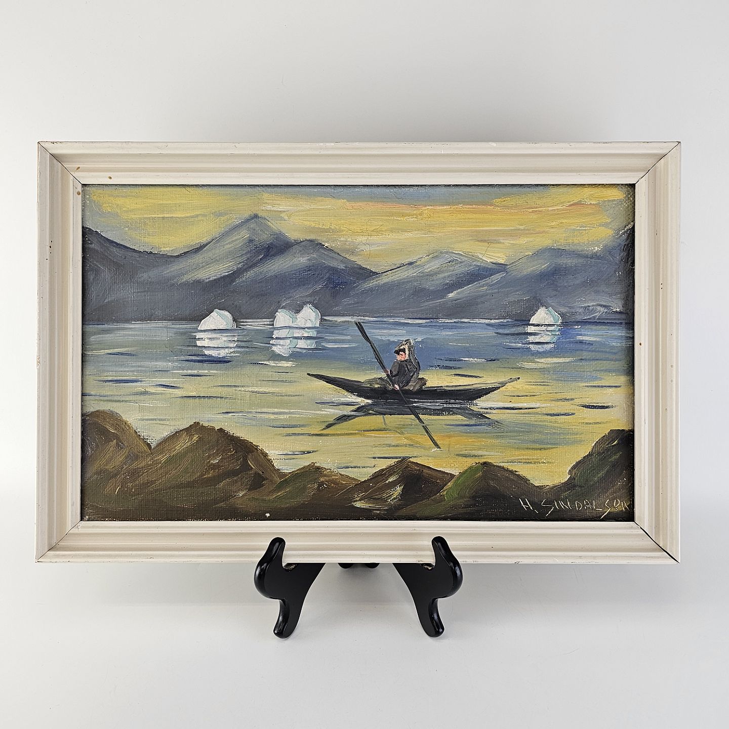 Oliemaleri på lærred i hvidmalet træramme. Havmaleri med et grønlandsk inspireret motiv af en kajaksejler Kunstner H. Sindalsen