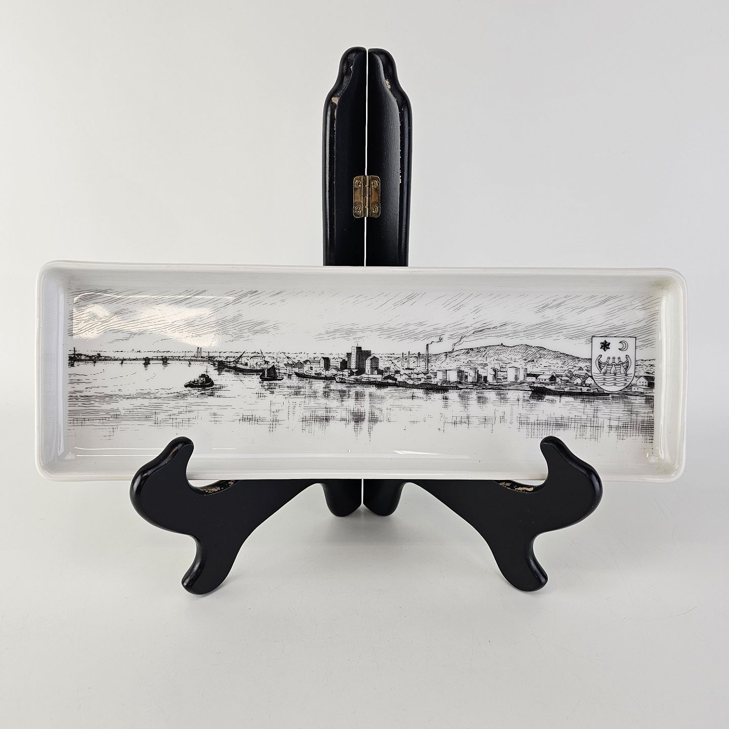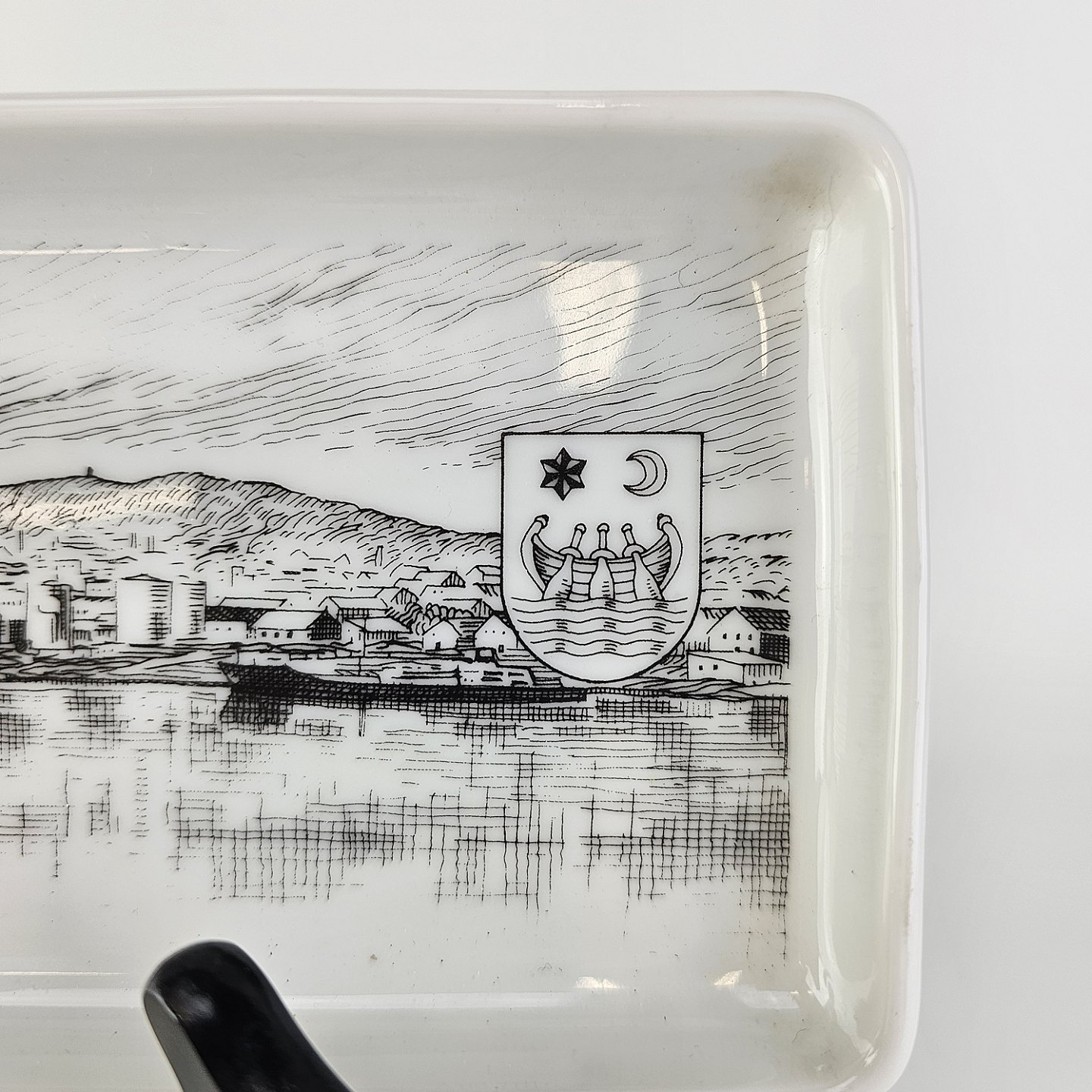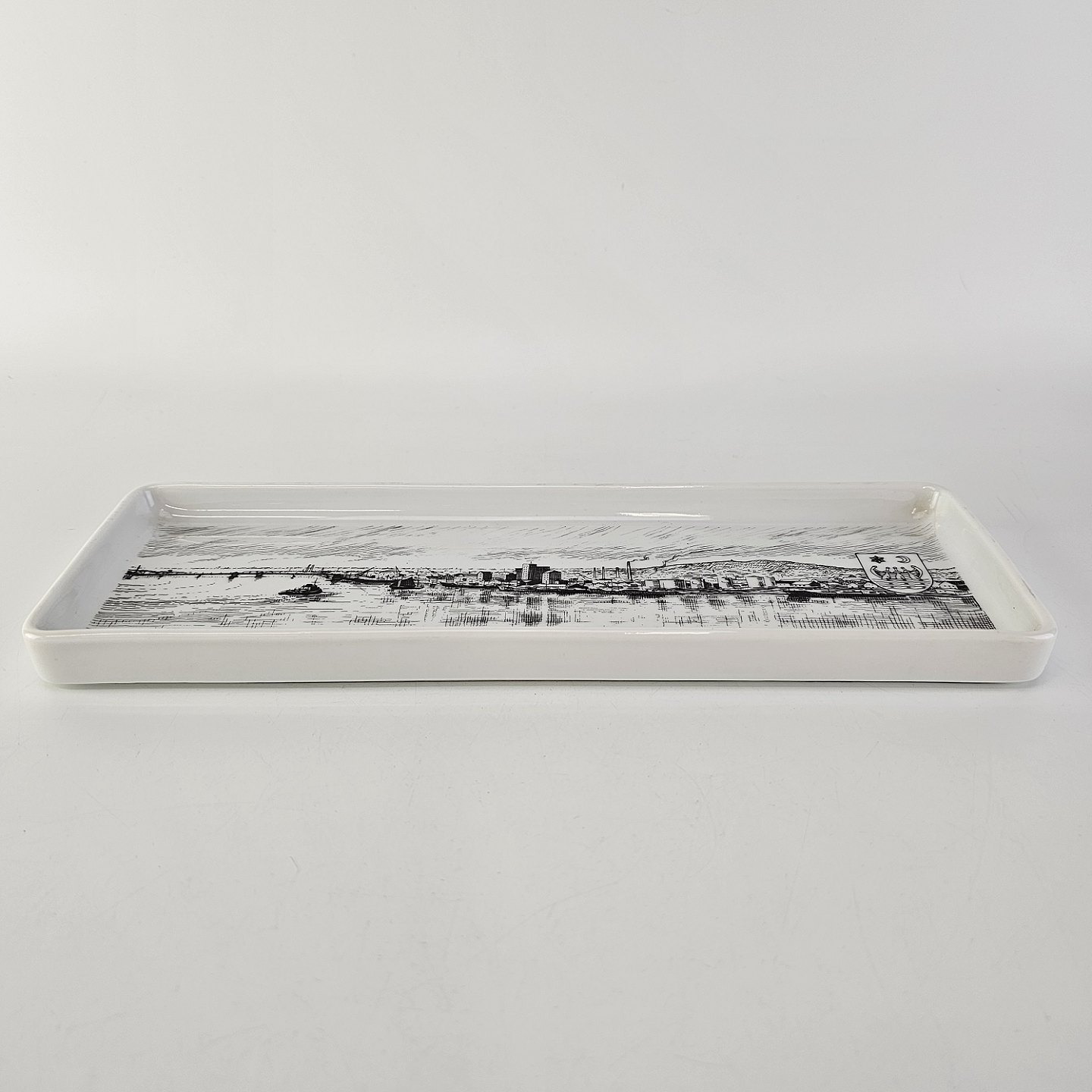 Aflangt fad i hvidt porcelæn med bymotivNørresundby 7042