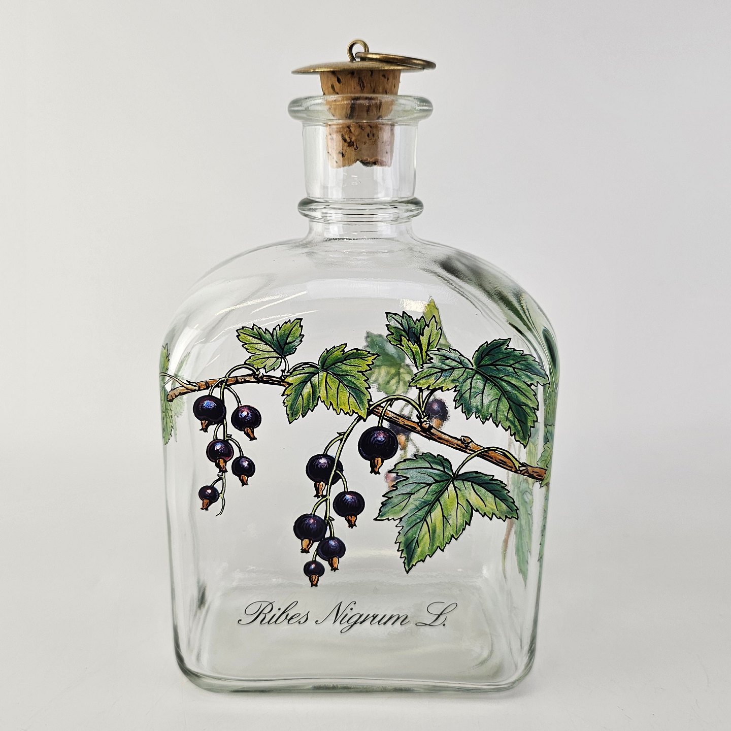 Karaffel i klart glas med korkprop fra serien Brændevins Amatøren, dekoreret med en gren af solbær og teksten Ribes Nigrum L.Formgiver Finn Clausen / Michael Bang