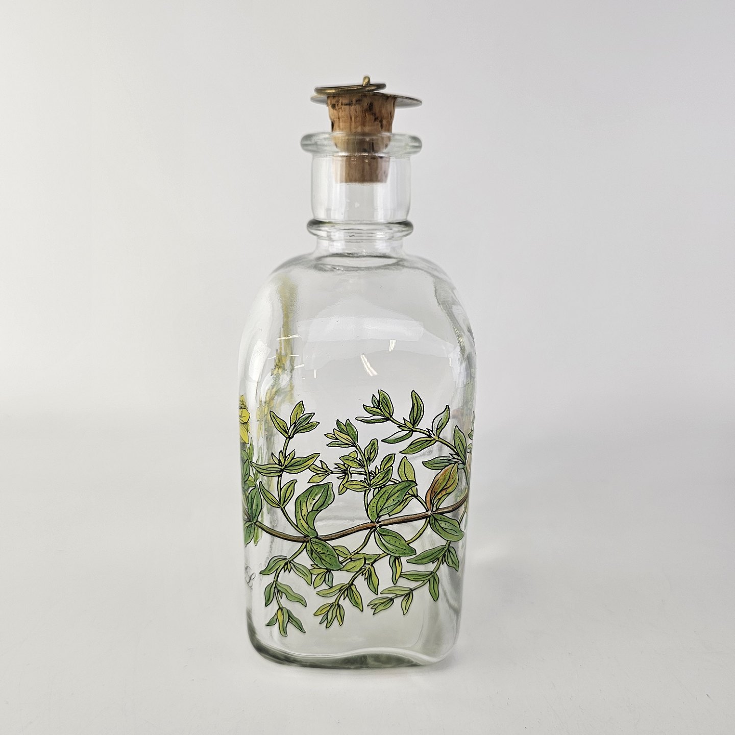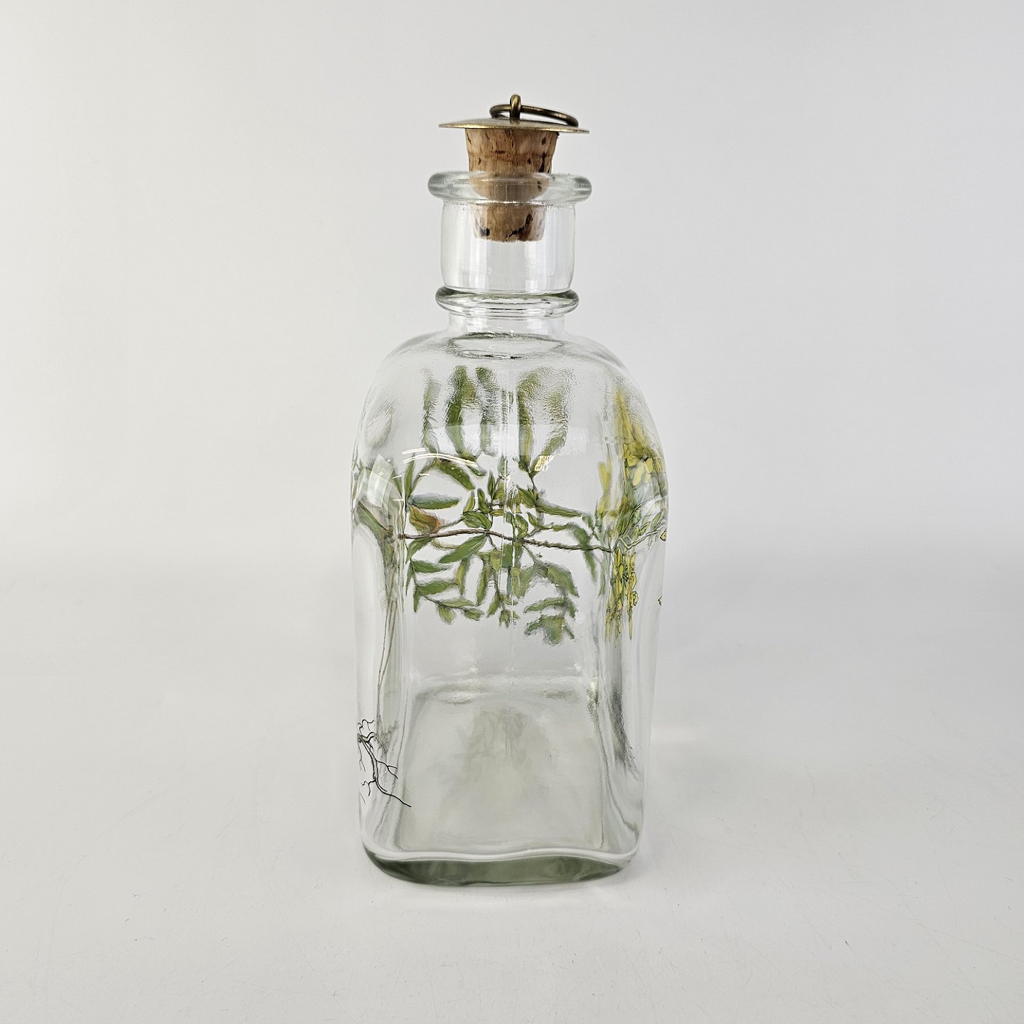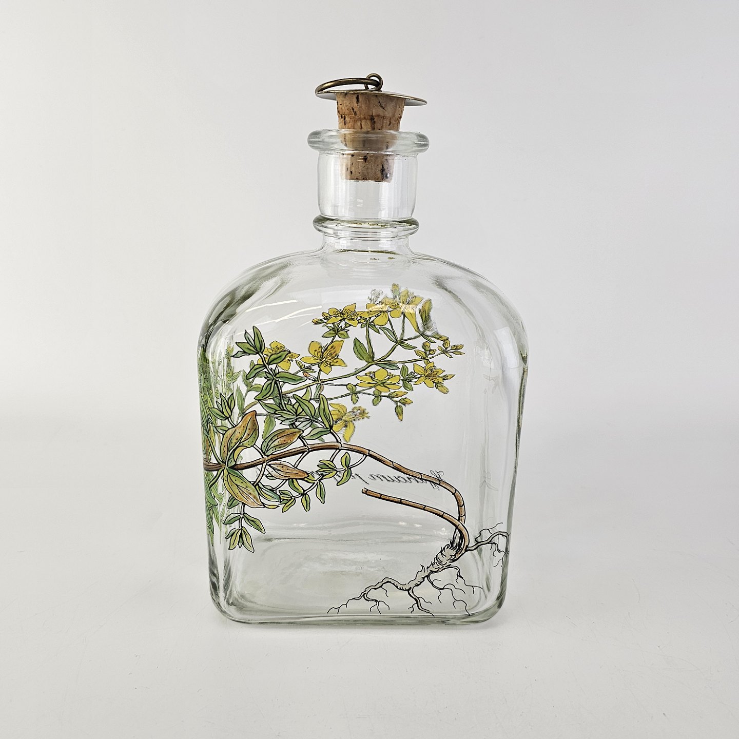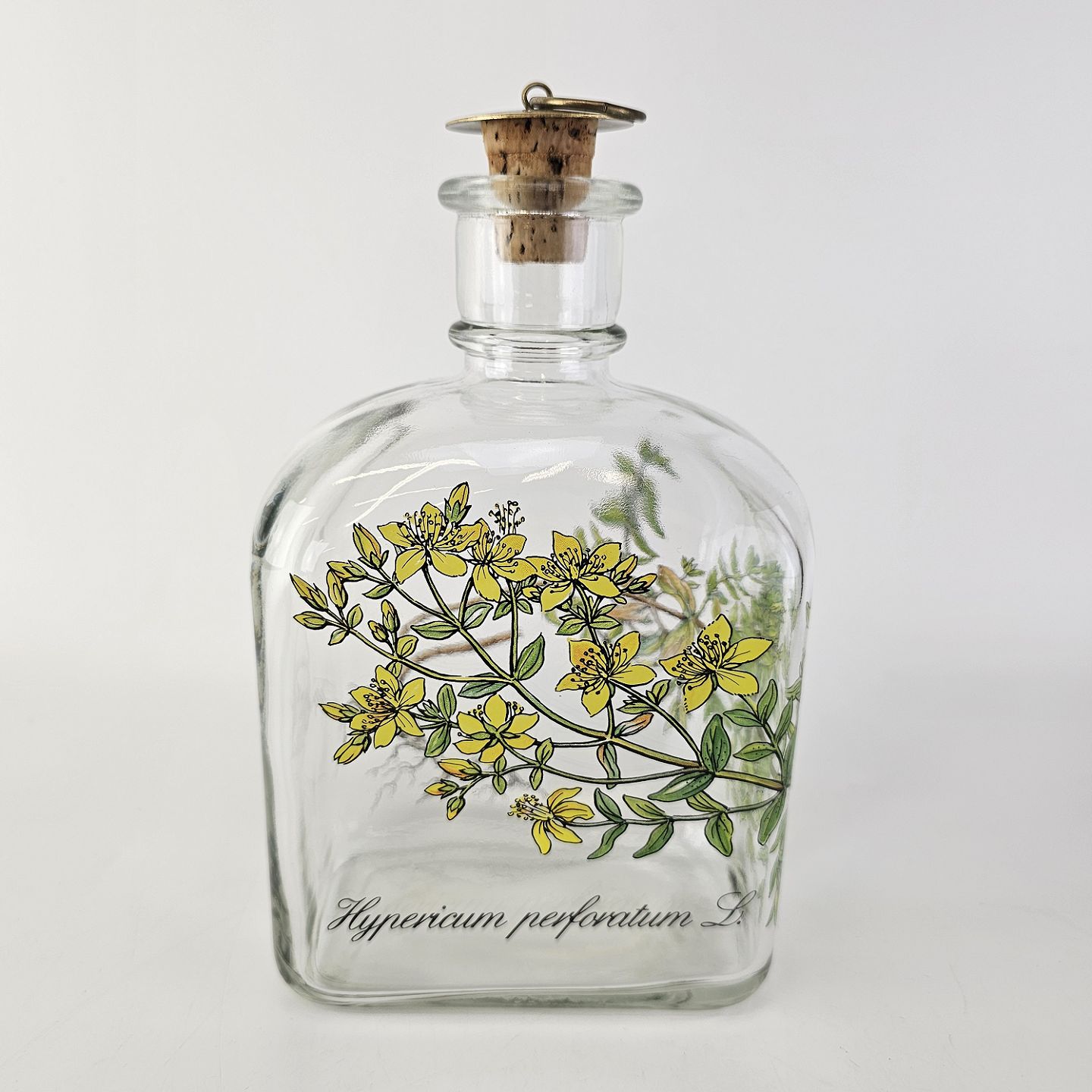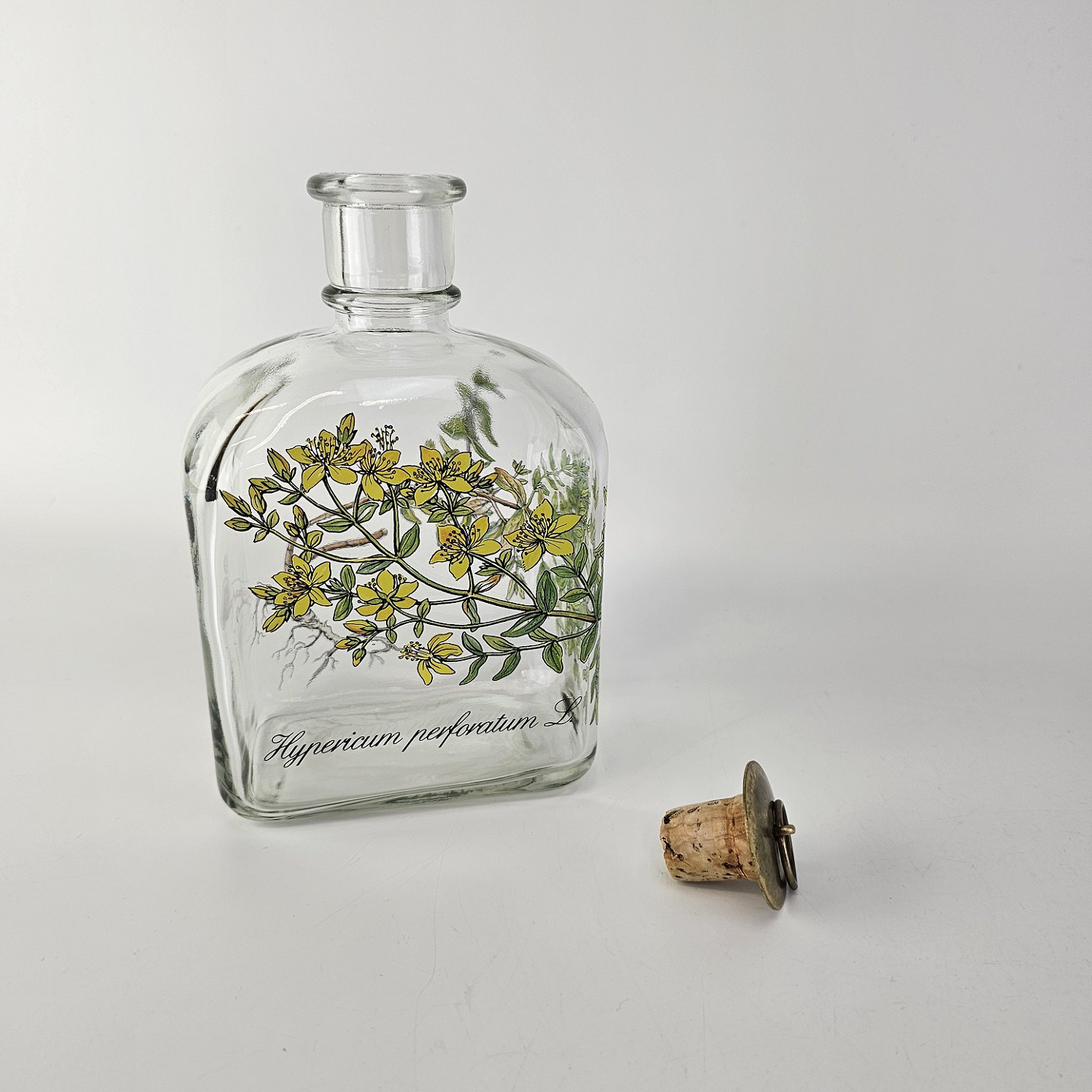 Karaffel i klart glas med korkprop fra serien Brændevins Amatøren, dekoreret med en gren af prikbladet perikum blomster og teksten Hypericum Perforatum L. Formgiver Finn Clausen / Michael Bang
