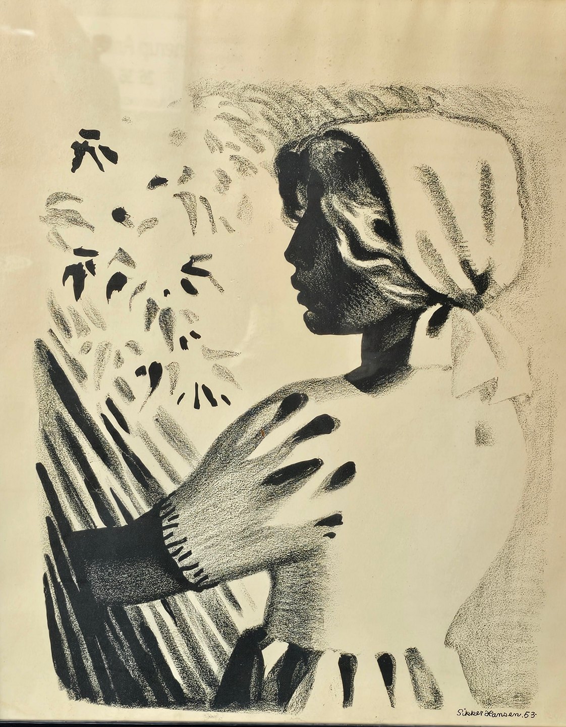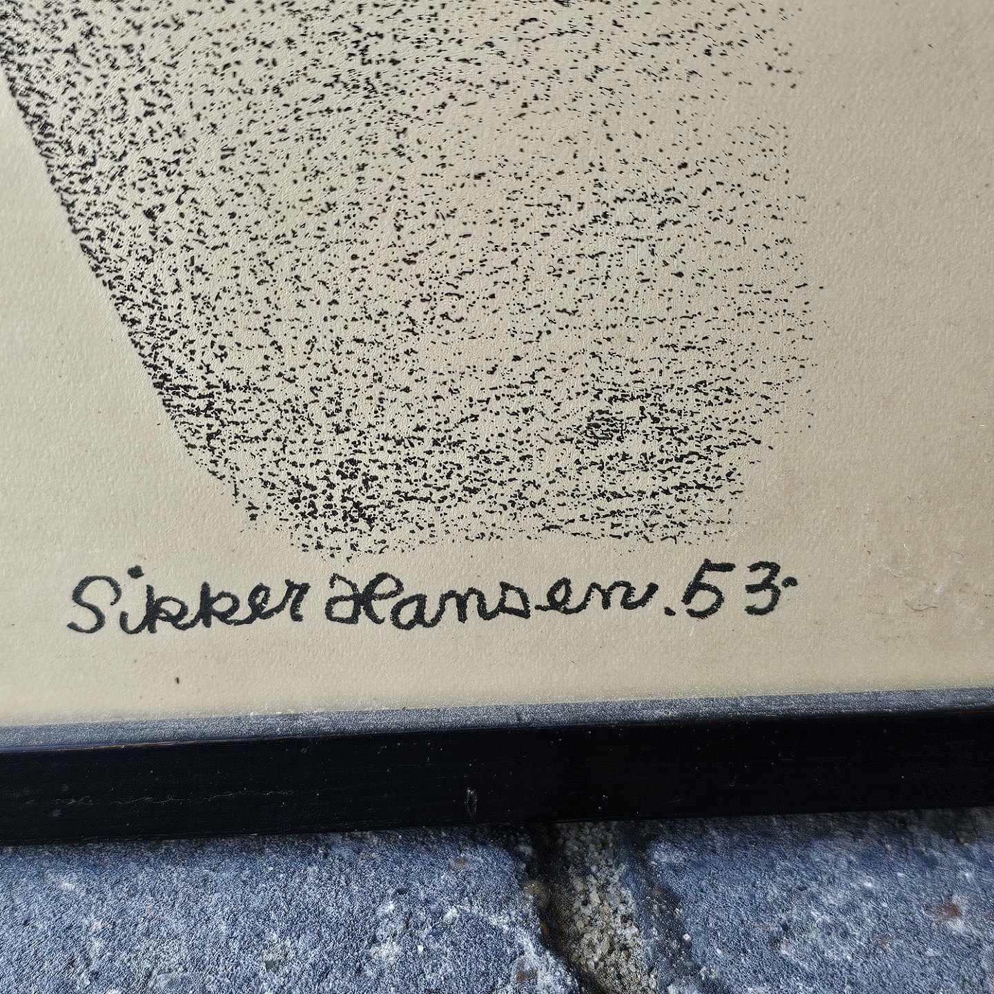 Indrammet tryk i sort ramme med motiv af en pige med negKunstner Aage Sikker Hansen, 1953 (1897-1955)