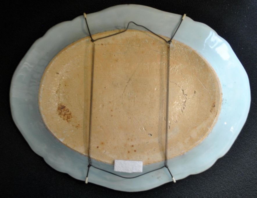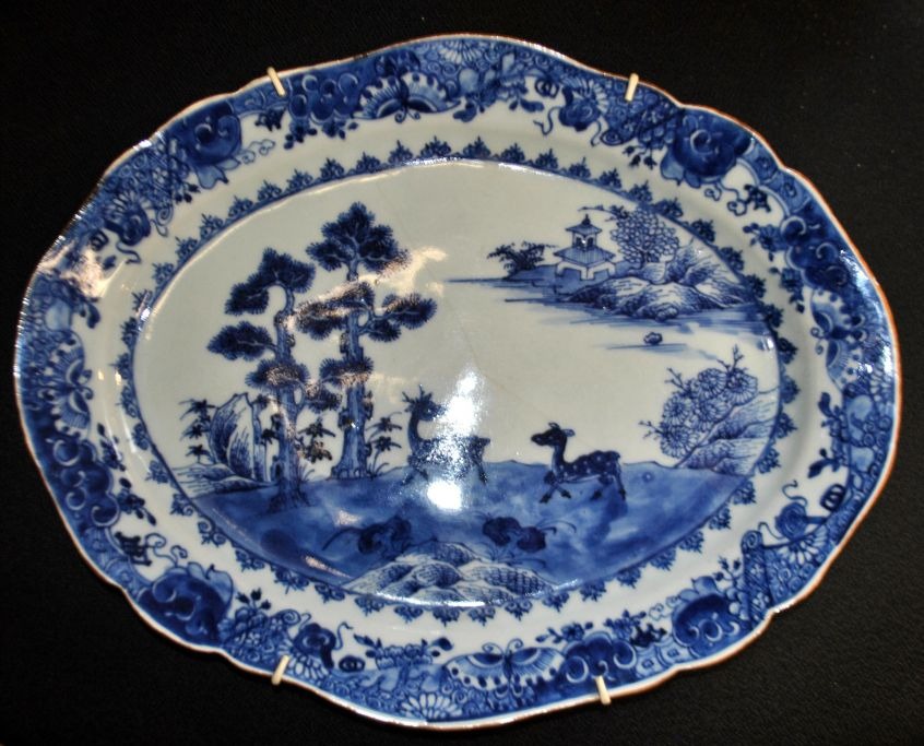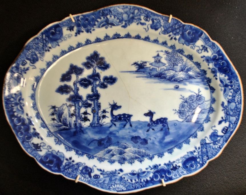 Chinese blue and white dish, 18th century. With hand-painted decorations of deer in a landscape. In the background pagoda. Rim decorated with flowers and butterflies. L.: 36.5 cm. W.: 28.5 cm.NB: With hairline cracks - otherwise perfect condition!