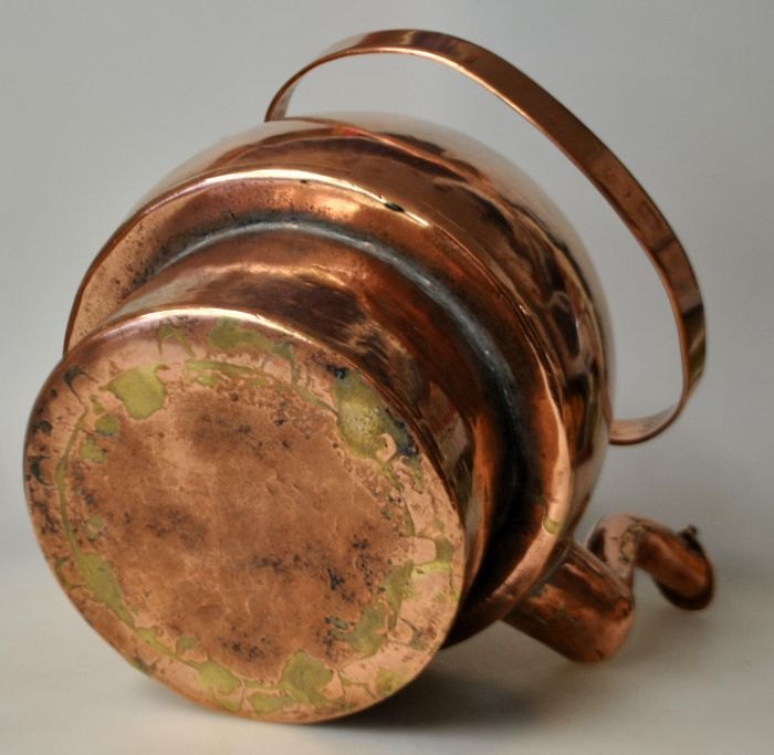 Copper kettle, 19th century. With indistinct stamps. With handle, lid and spout. H: 21 cm. H. incl. handle: 29.5 cm. Dia: 20 cm.