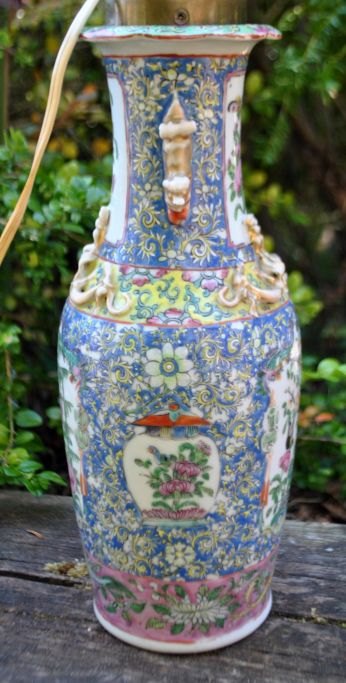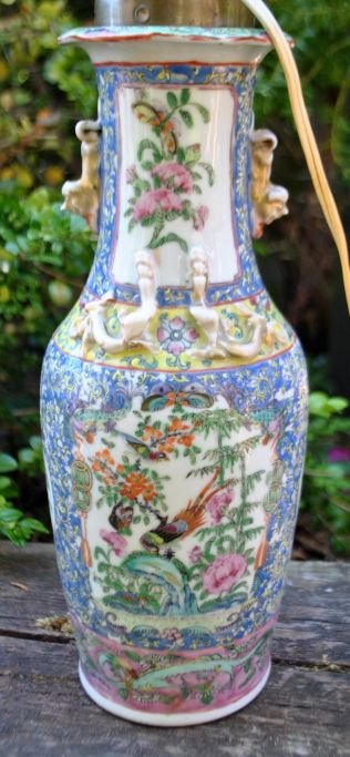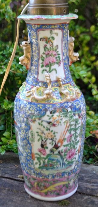 Chinese vase - converted into a lamp, 19th century. Famille rose. Decoration in the form of lions, dragons, birds and flowers. Height: 30 cm. Height with mounting: 54 cm.Item number: 28218