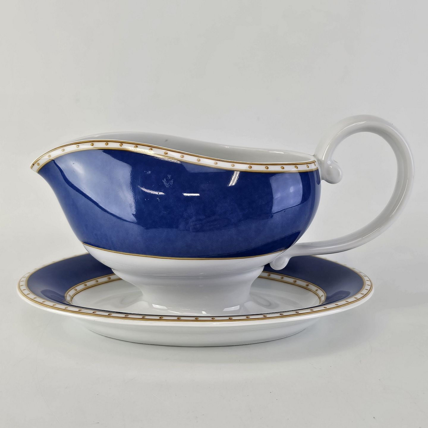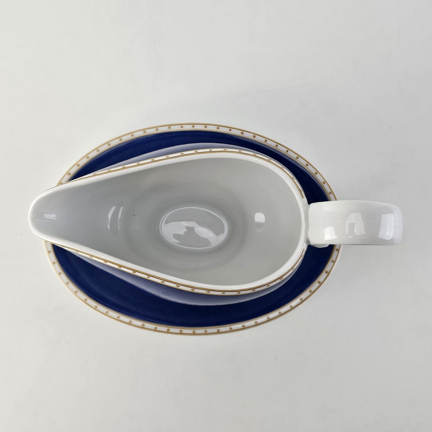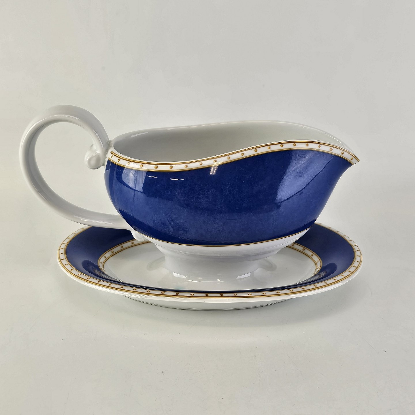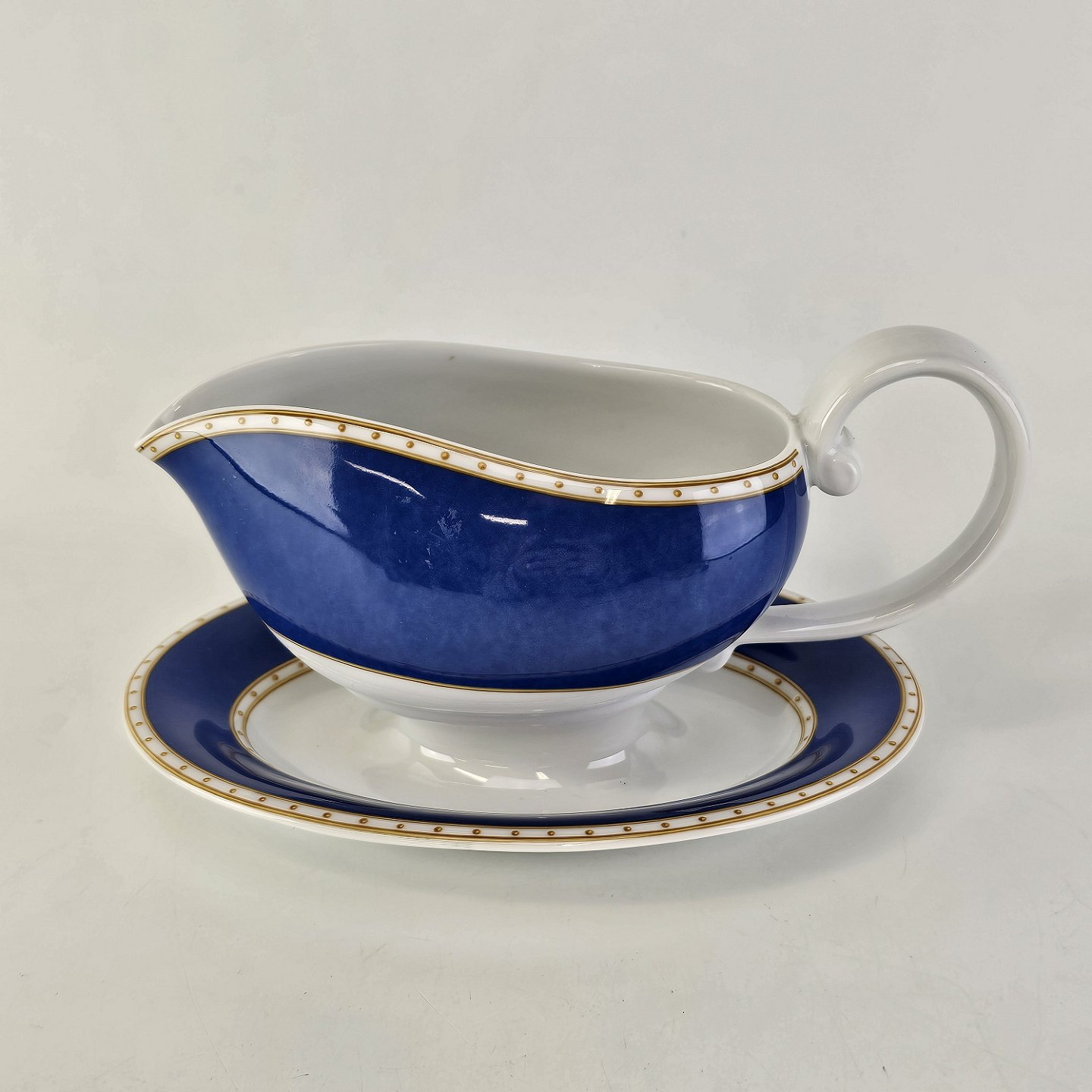 Liselund er hvidt porcelæn dekoreret i lyseblå eller mørkeblå nuancer, sovsekanden er uden fletmønster