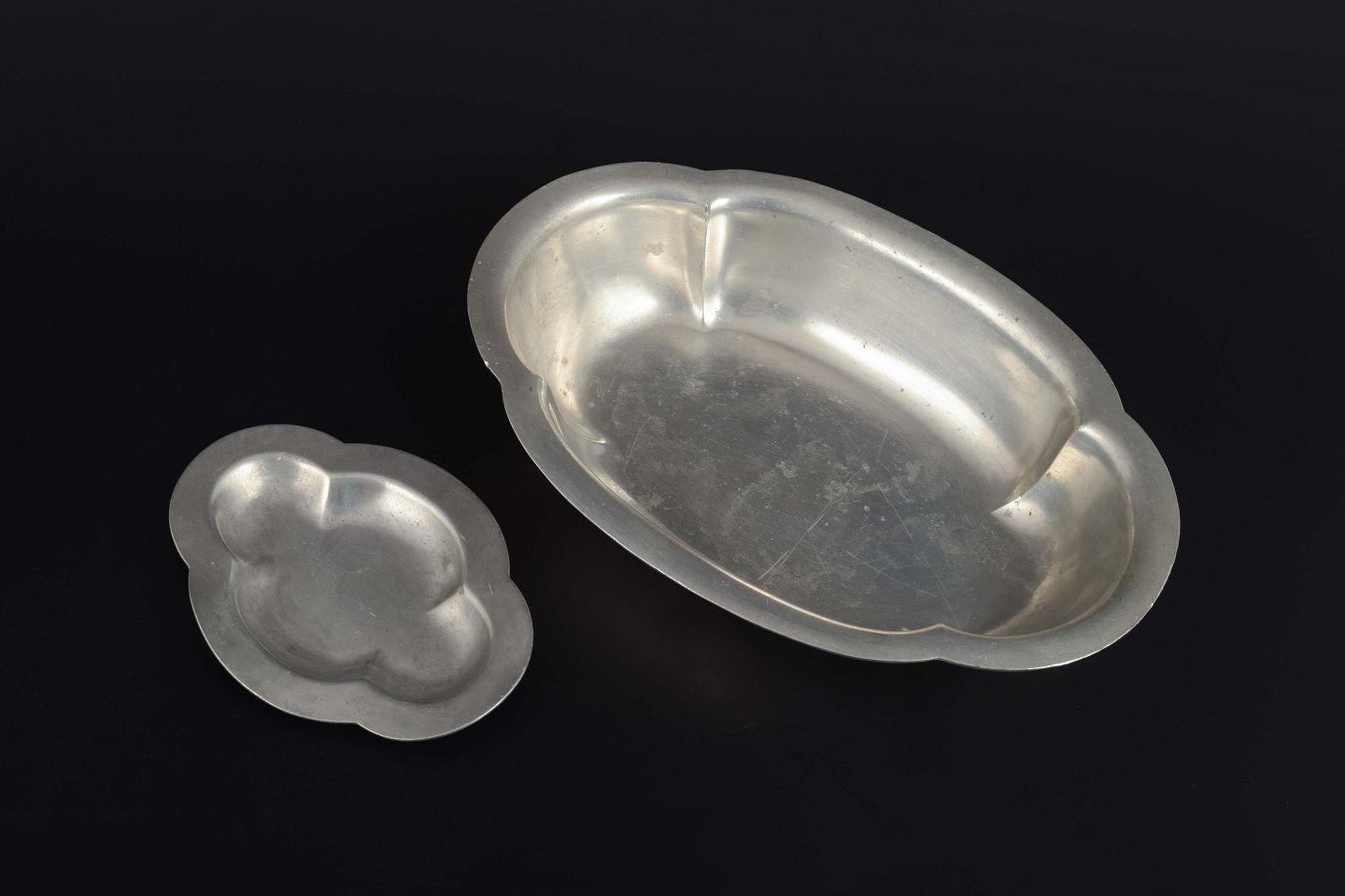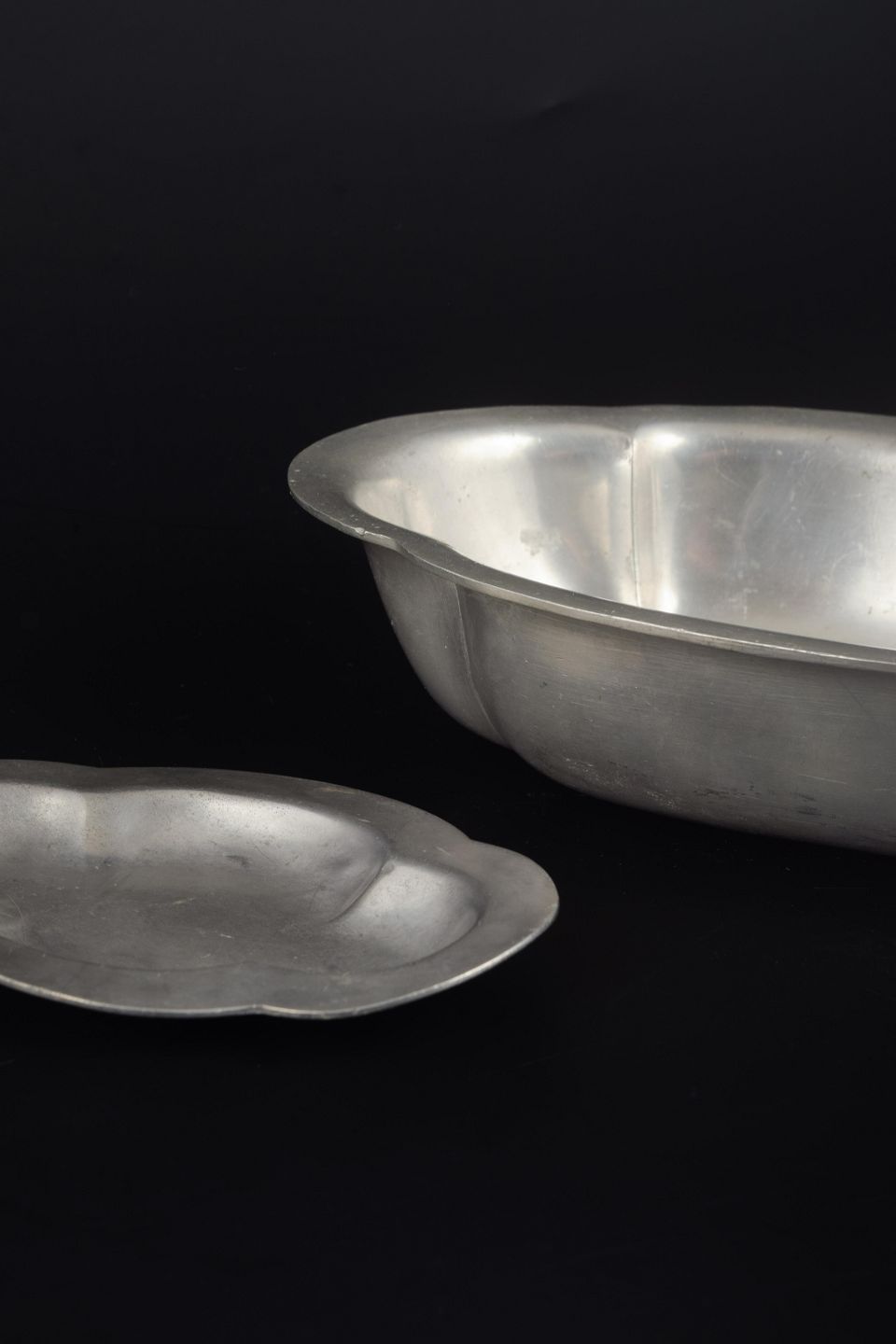 Oval and round bowls in pewter, both with softly curved organic forms, 1930–1940.