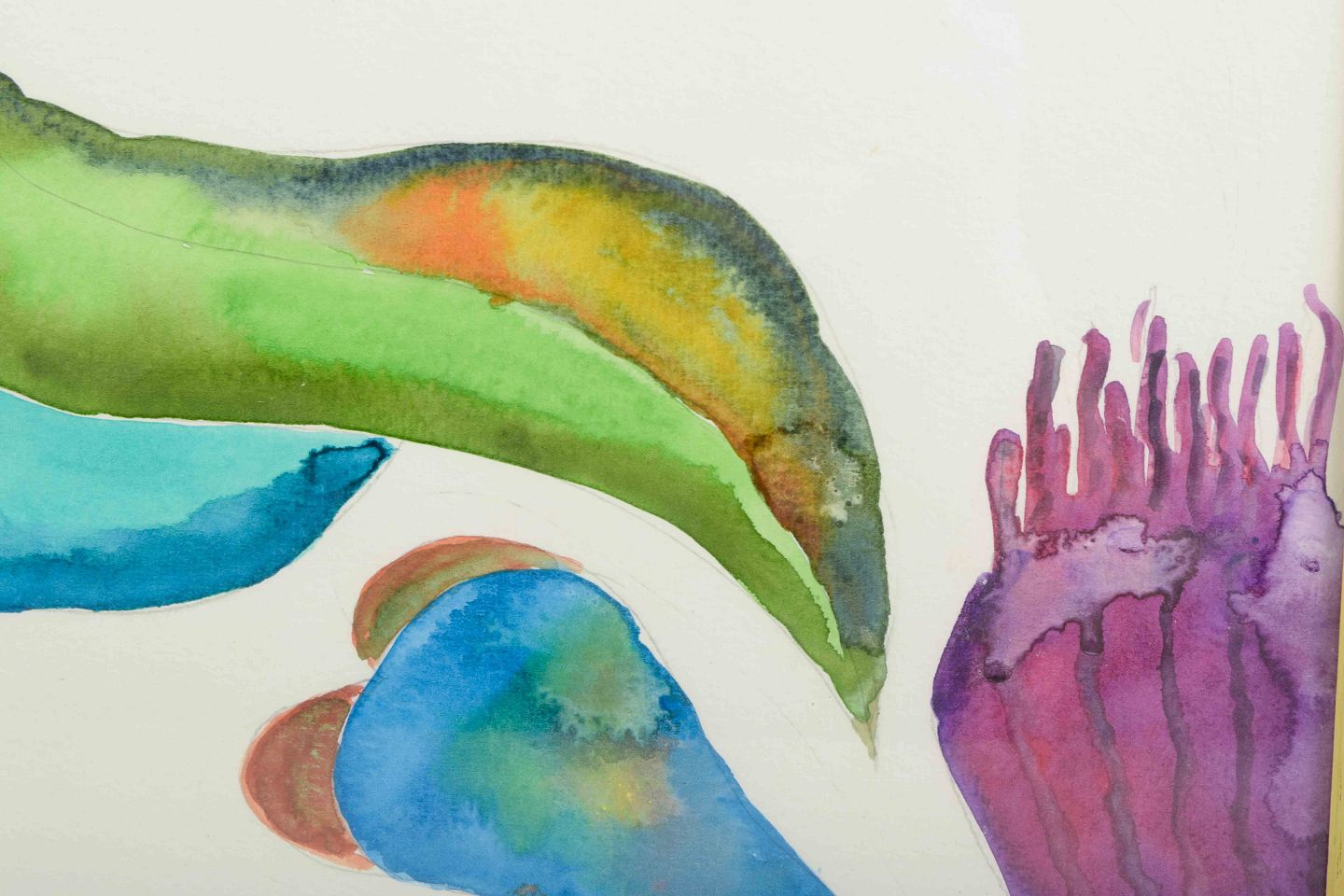 An abstract and colorful work in watercolor, where organic forms in violet, blue, and green tones float across the white surface of the paper. The work appears as a free and experimental composition with both figurative and nature-inspired associations.
